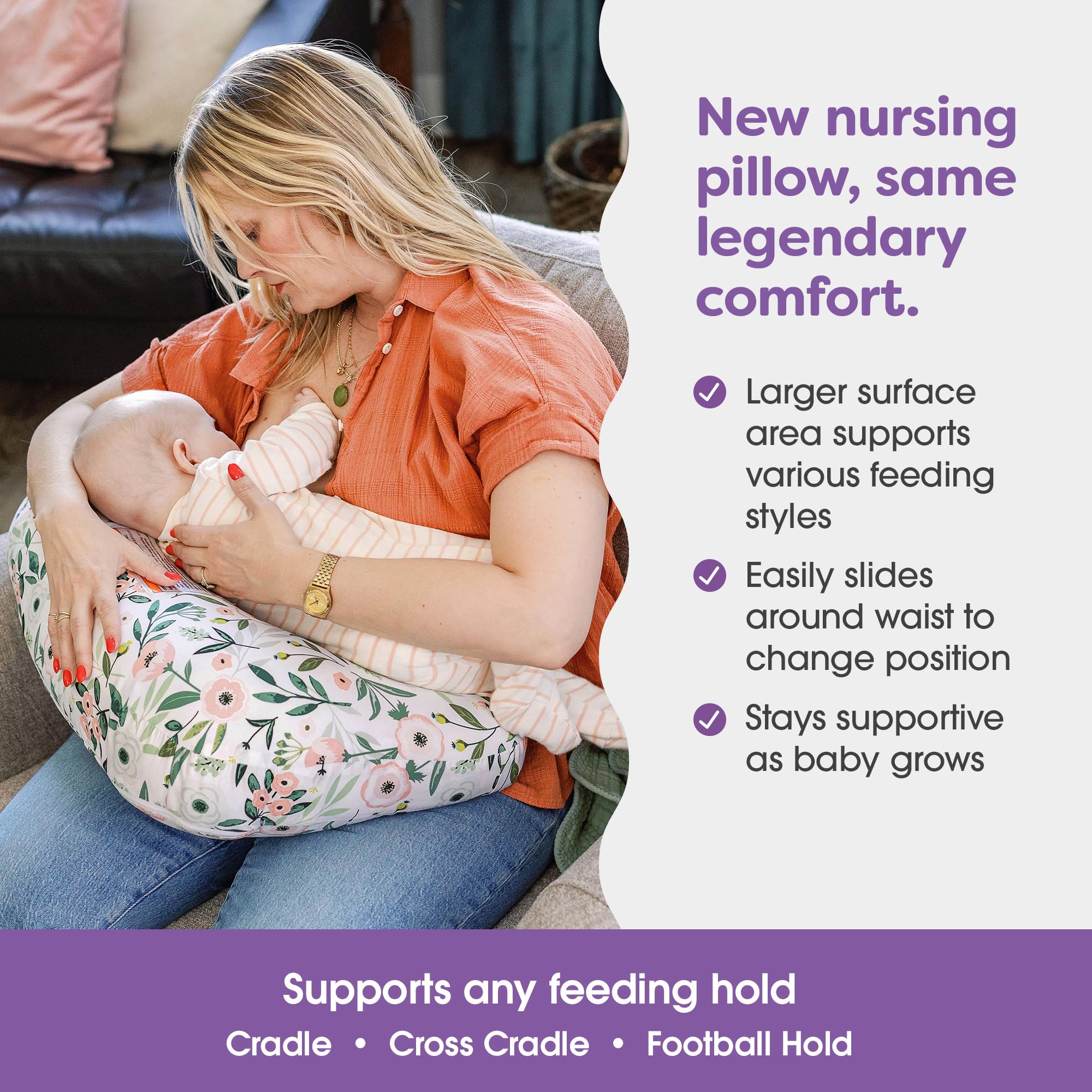 Introducing the Updated Boppy Nursing Pillow, your comfy, snuggly sidekick for feeding moments. This redesigned cutie, dreamed up by clever moms, gives your arms and back a break while keeping baby at the perfect angle for breastfeeding and bottle feeding. Did you know the average nursing mom clocks over 35 hours a week feeding? Talk about a full-time job. But fear not, our Redesigned Boppy Nursing Pillow is here to save the day (and night), just as our Original Boppy Nursing Pillow has done for 35 years. With its updated, versatile design, you can cradle, cross cradle, or football hold with ease. This pillow’s got your back (literally) with its larger, firmer shape that hugs every body type just right, keeping baby snug and positioned just right. It’s small enough to fit in your rocking chair or glider but big enough to deliver all the support you need. No wonder it’s been a registry must-have and a favorite among moms, dads, caregivers and lactation consultants alike for over three decades. The easy-on, easy-off, beltless design has a wider opening and means you can pop it on with one hand—because what mom or dad has two free hands? Plus, its removable cover is machine washable for those inevitable messes. Filled with hypoallergenic, recycled fiber, it’s as carefree as it is cozy. Got a laundry day? No worries. We’ve got extra covers so you can always have a fresh one ready. Just remember, this pillow is for supervised awake-time only—no snoozing allowed! Trust Boppy to keep you and your baby comfy, happy, and oh-so-confident. Let’s make feeding time the best time.