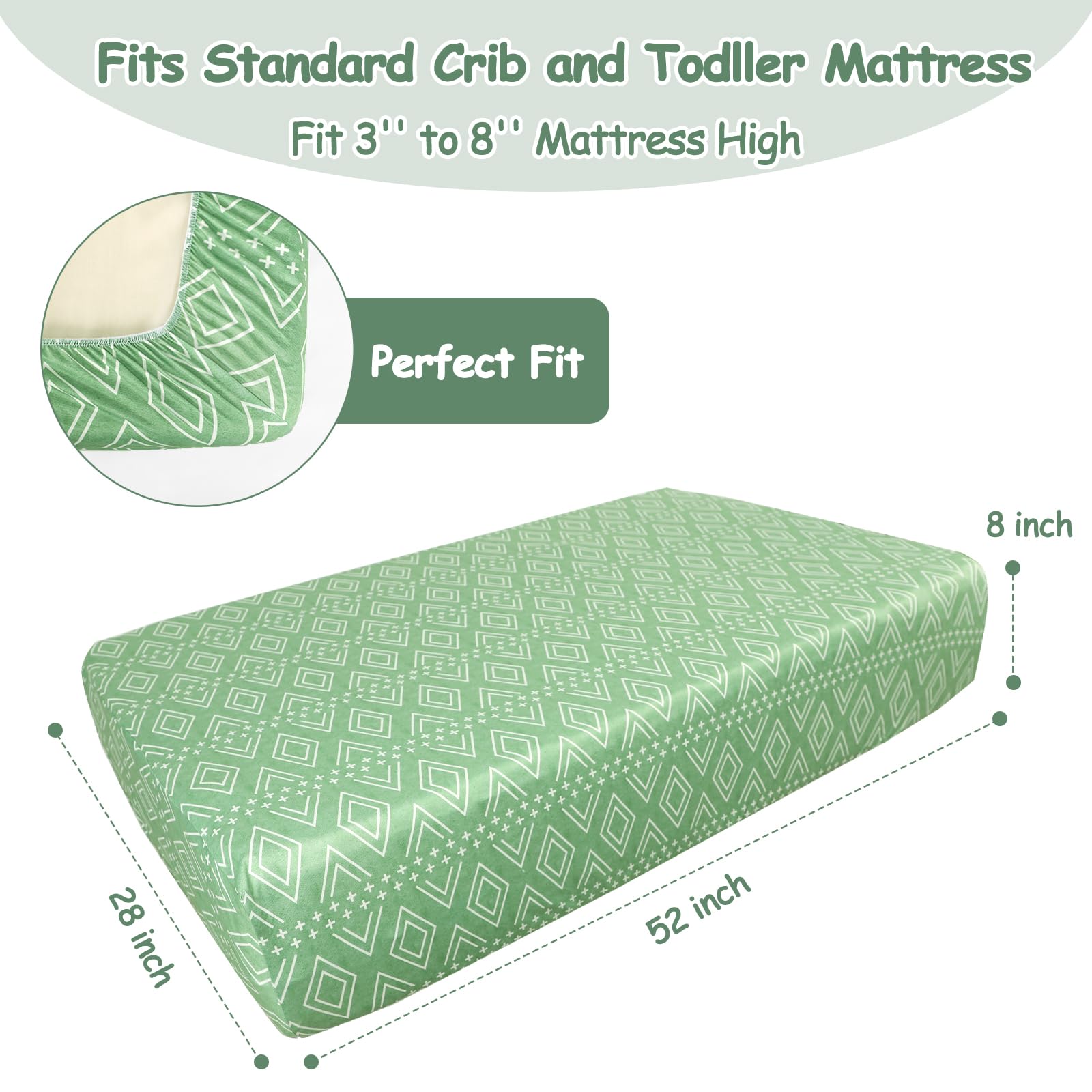 Perfectly Fit: Measuring 52"x28"x8", our crib mattress sheet is specifically designed to perfectly fit standard crib mattresses as well as mini cribs and toddler beds. The sheets fit mattresses with a height of 3” to 8”, ensuring a snug and secure fit.