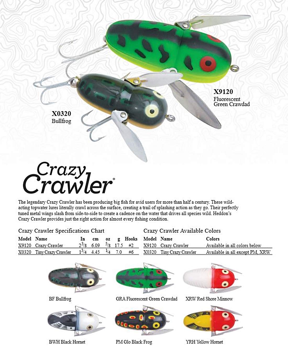 The legendary Crazy Crawler has been producing big fish for avid users for more than half a century. These wildacting topwater lures literally crawl across the surface, creating a trail of splashing action as they go. Their perfectly tuned metal wings slash from side-to-side to create a cadence on the water that drives all species wild. Heddon’s Crazy Crawler provides just the right action for almost every fishing condition
