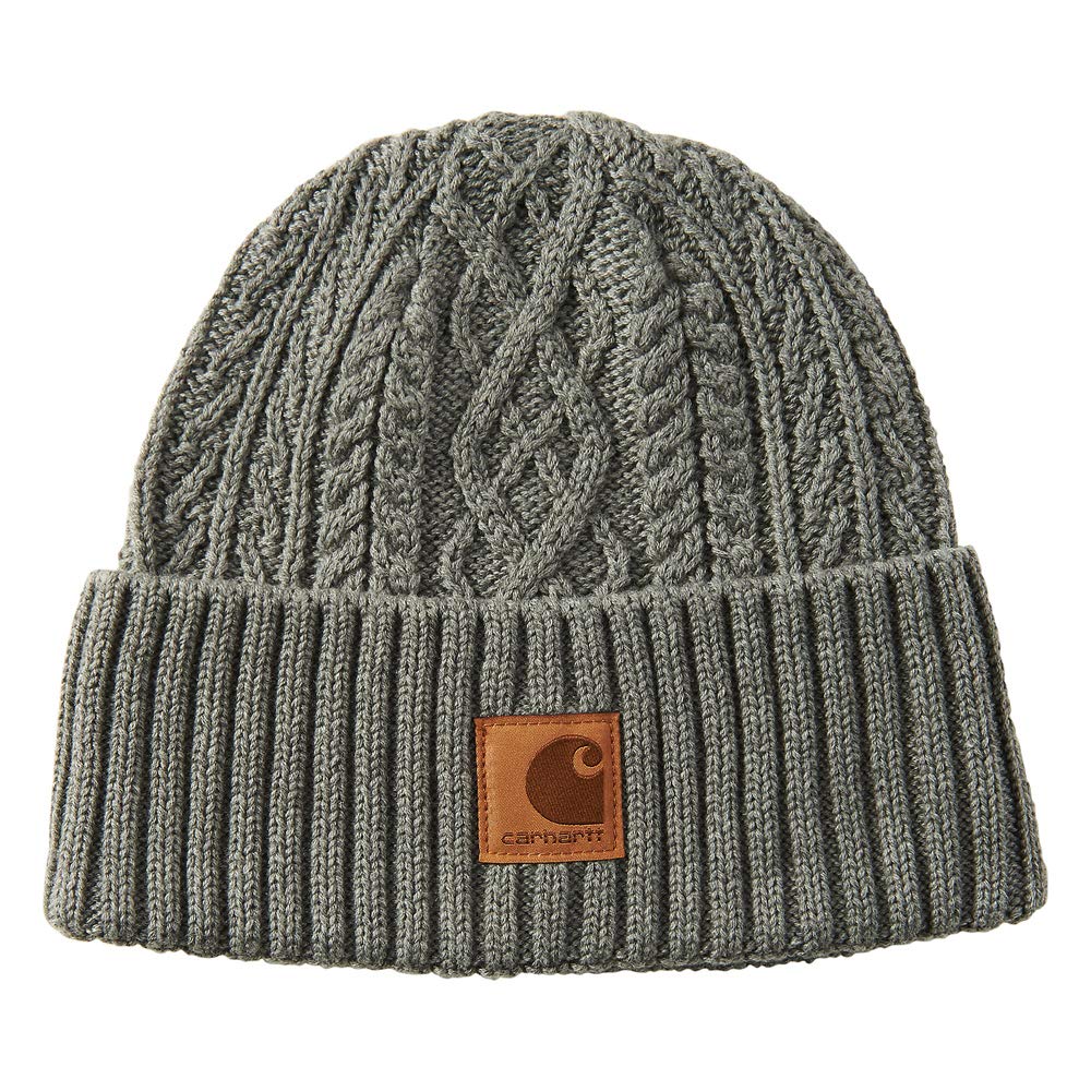 Stretchable rib knit hat with a Carhartt brandmark label on front.