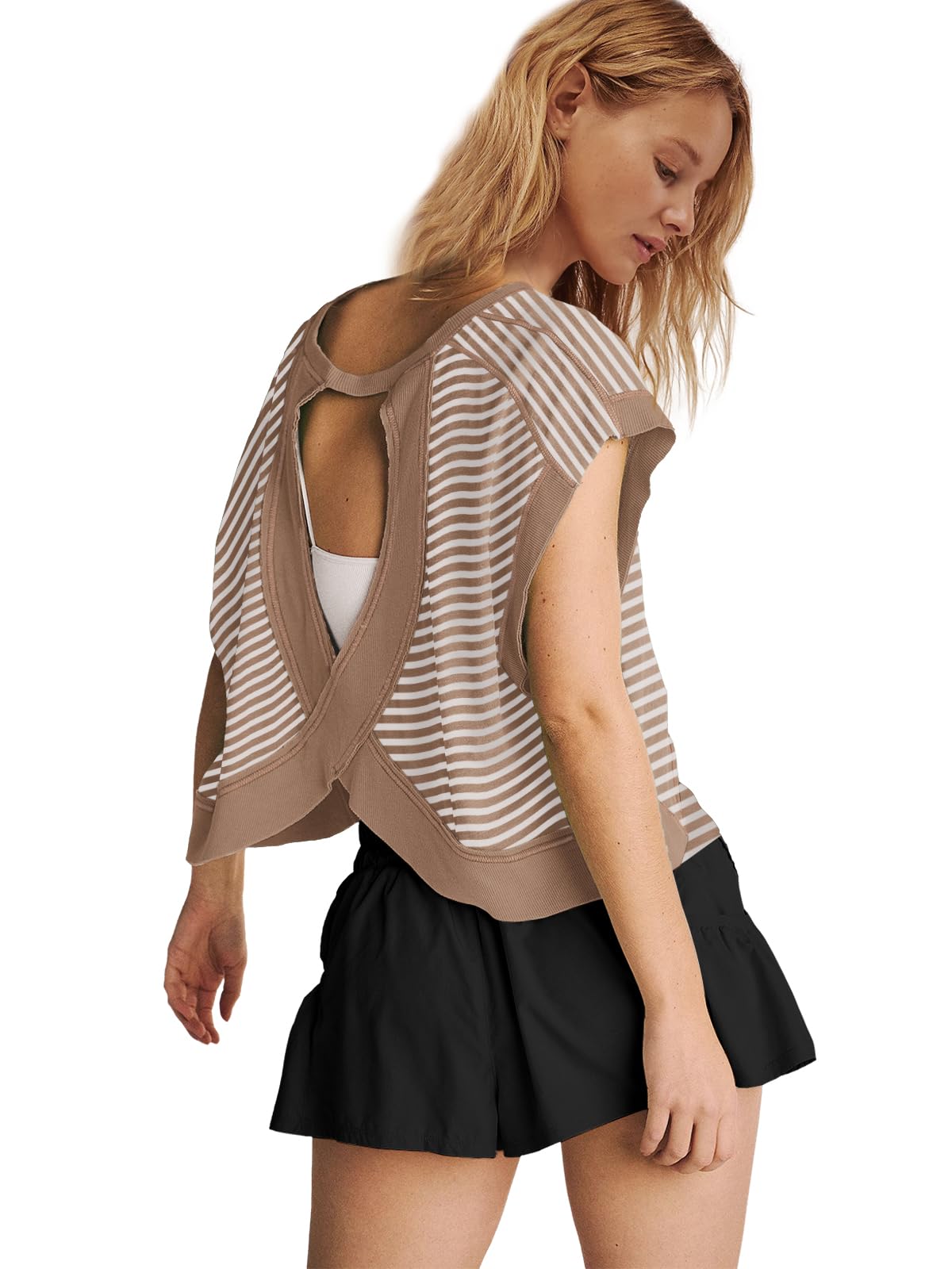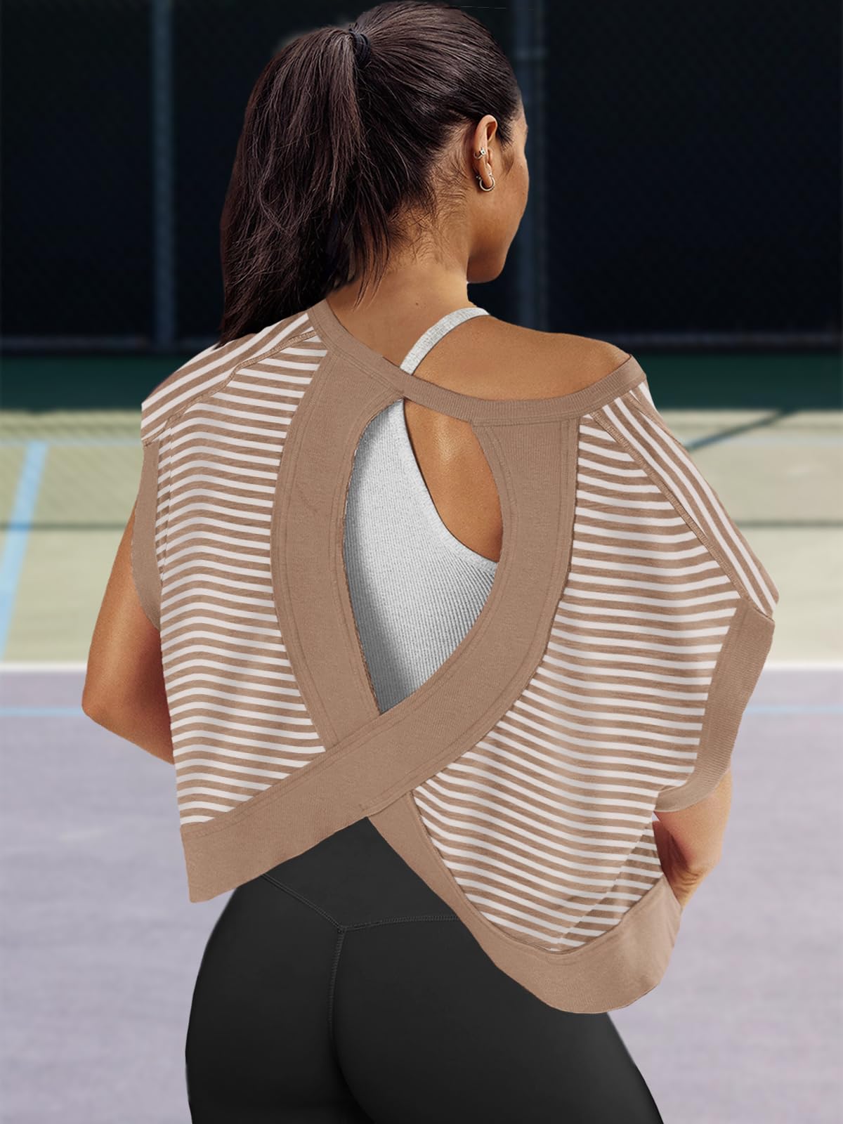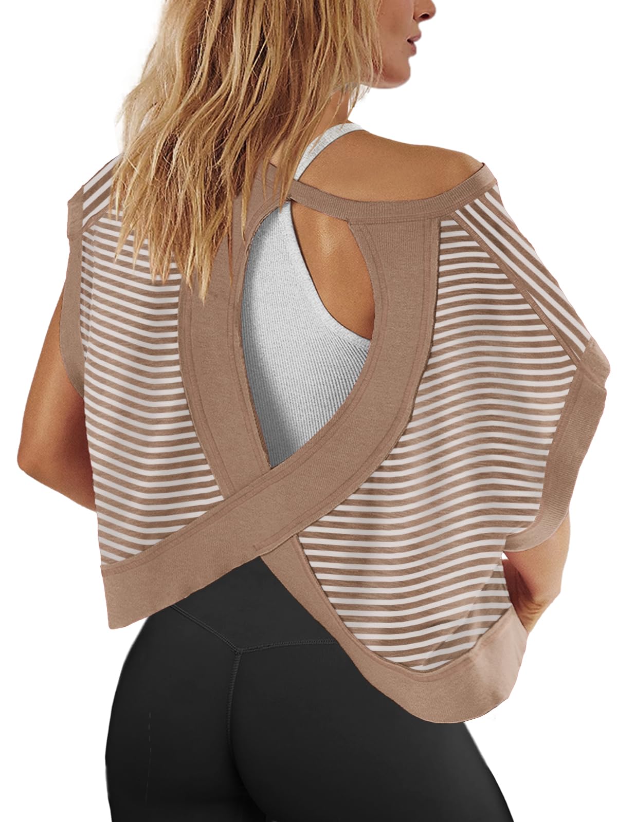 Fit: Please order your regular US size. The workout tshirts for women is an oversized style that not only flatters your figure but also pairs effortlessly with any outfit. If you want a more comfy loose fit for this womens open back tops, suggest ordering one size larger.