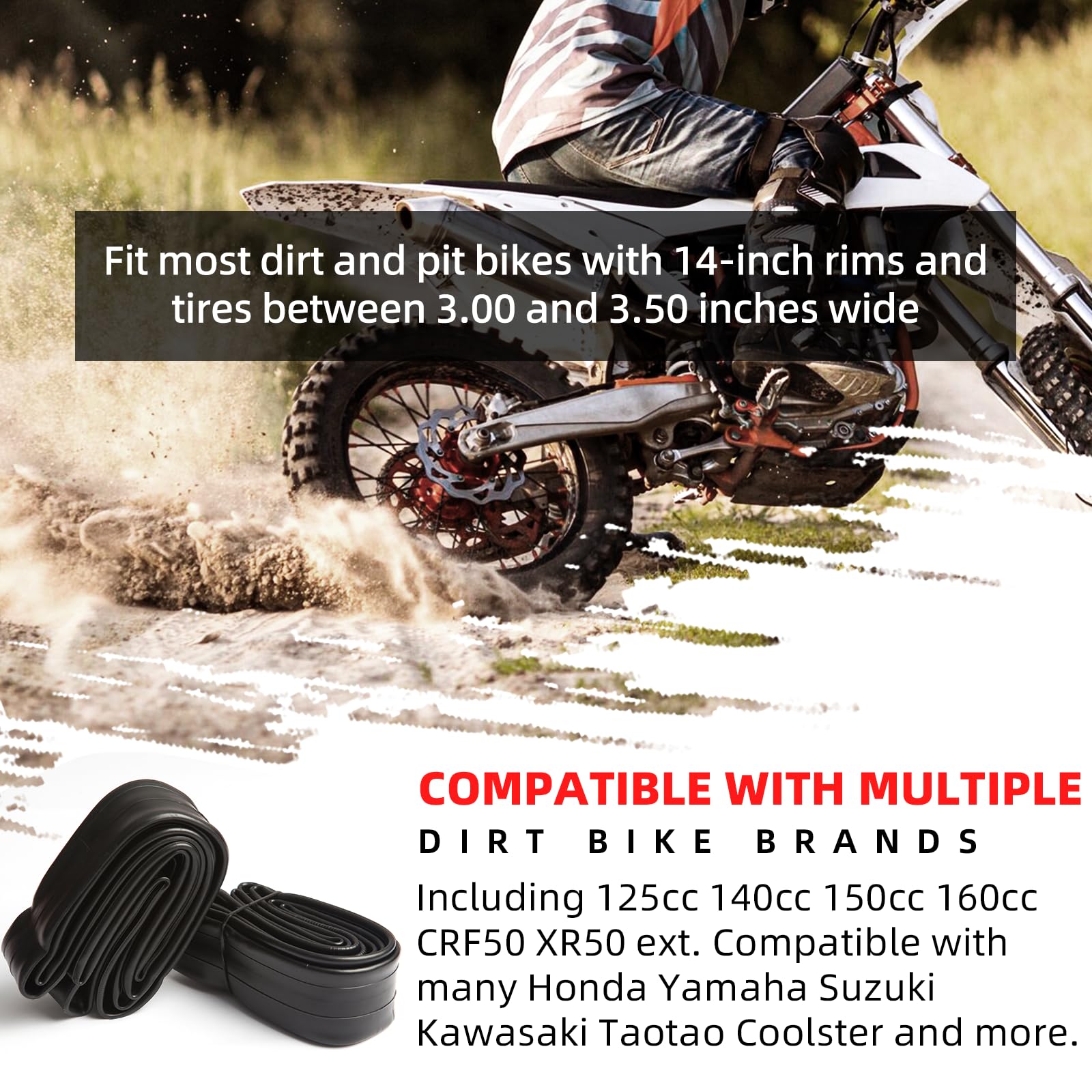 3.00/3.50-14" Dirt Bike Inner Tubes - These universal fit inner tubes (2-pack) fit most dirt and pit bikes with 14-inch rims and tires between 3.00 and 3.50 inches wide, ensuring compatibility and versatility for your dirt bike.