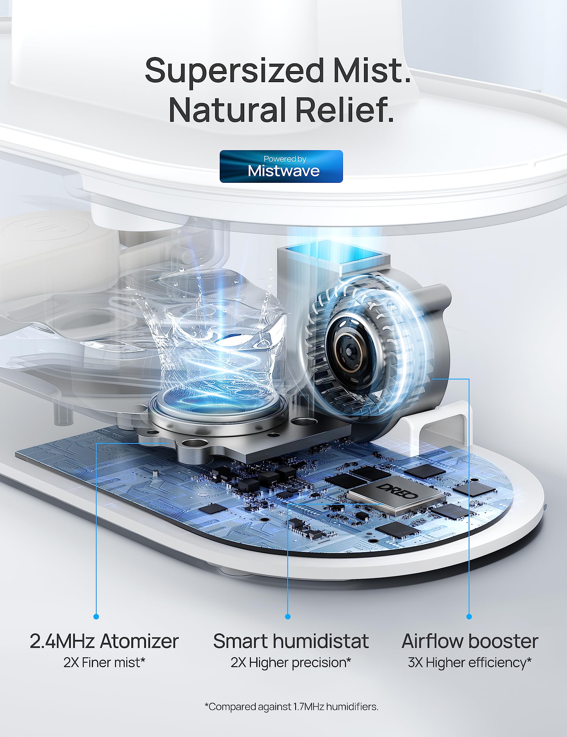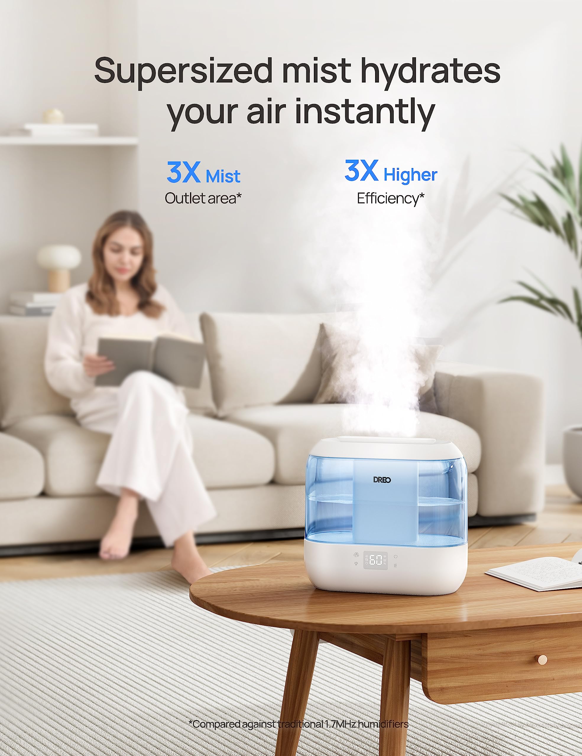 Larger mist, faster relief: Powered by Dreo's Dual-intake design, this humidifier creates a supersized mist 3 times larger than most air humidifiers, bringing faster dry air relief and helping you breathe easy and healthy