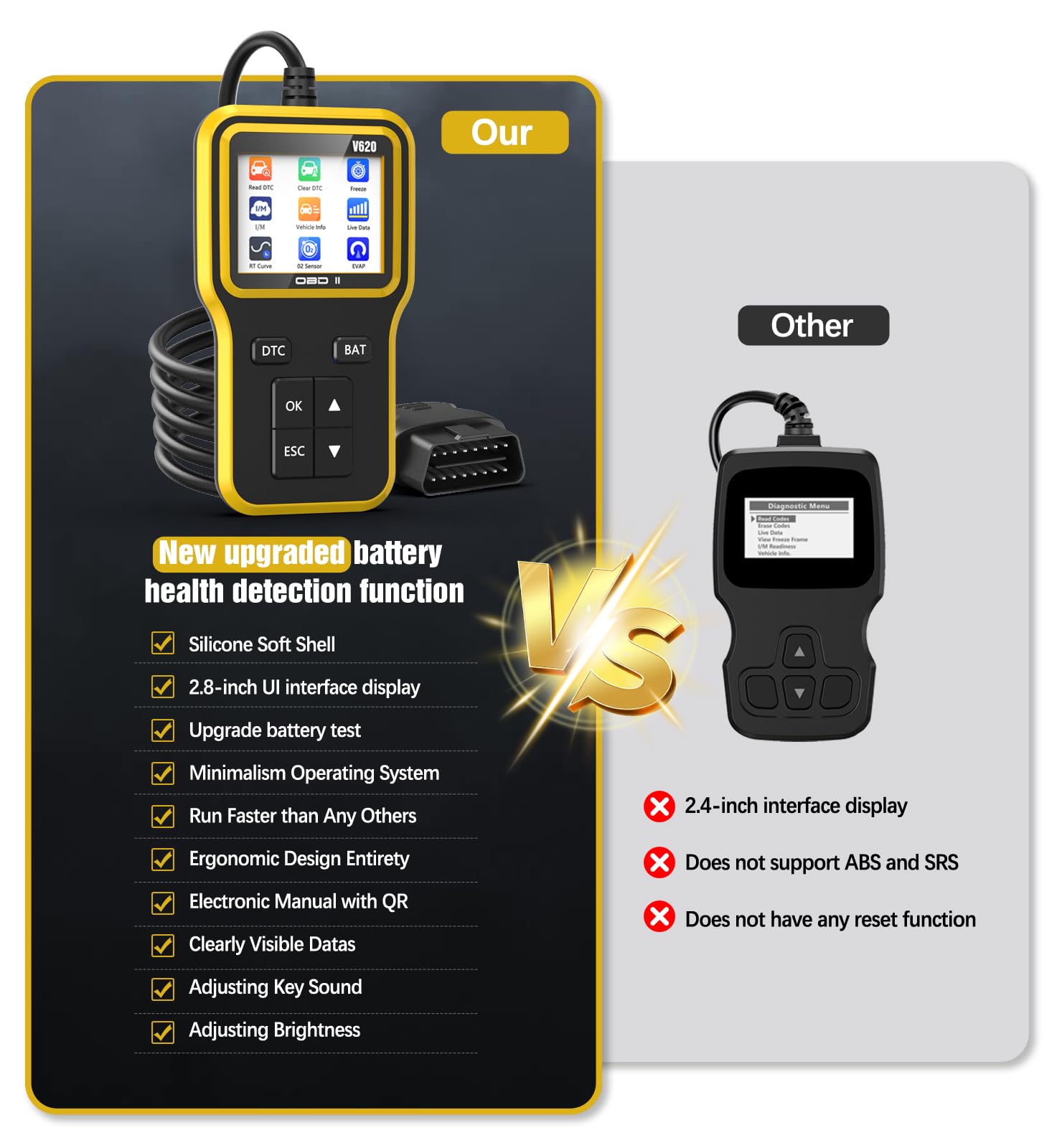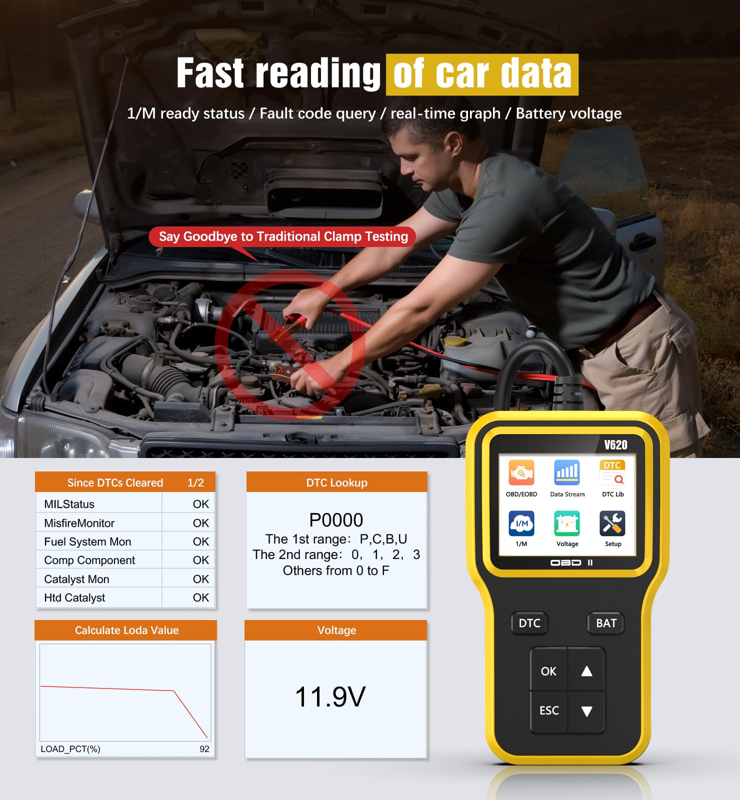 Battery Tester and Advanced OBDII System Diagnostics: This advanced code reader with battery has a built-in easy-to-use battery tester for monitoring battery life and voltage, helping you quickly assess the battery health of your vehicle, prevent unexpected failures and ensure reliable car performance. At the same time, this engine fault code reader provides advanced diagnostic functions, including testing the O2 sensor and EVAP system to measure oxygen concentration, control the amount of fuel injection, reduce fuel consumption, maintain optimal combustion conditions, improve engine efficiency; reduce exhaust emissions, and better protect the environment.