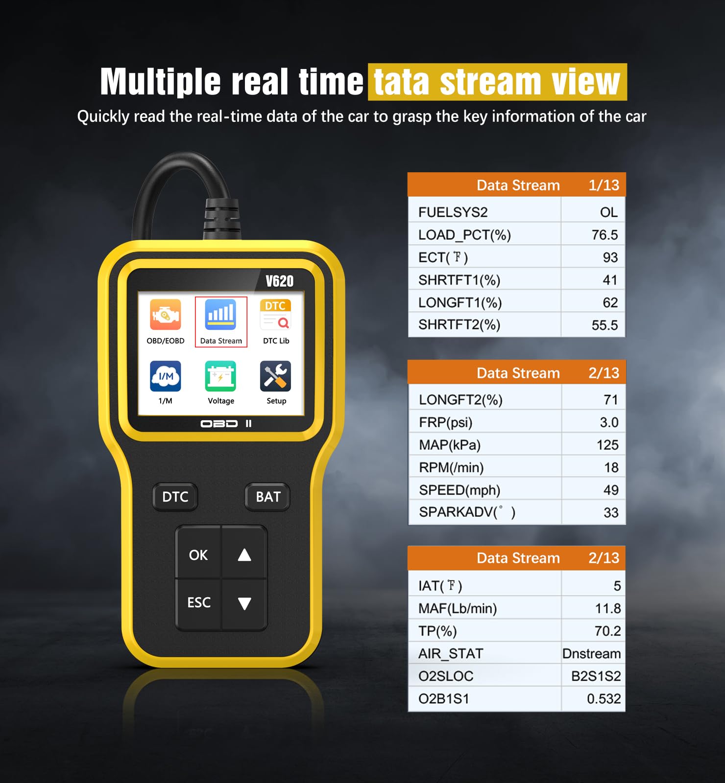 Multi-Function: This code reader for cars and trucks is like a micro mechanic, which can quickly read and clear engine error codes, live data stream (with graphic display), view freeze frame, check MIL readiness status, read I/M monitoring readiness status and collect vehicle information, display vehicle indicators in detail. You can use it to check fault codes by yourself and display code definitions, understand the health of the vehicle, be fully prepared for going to the auto repair shop for car maintenance.