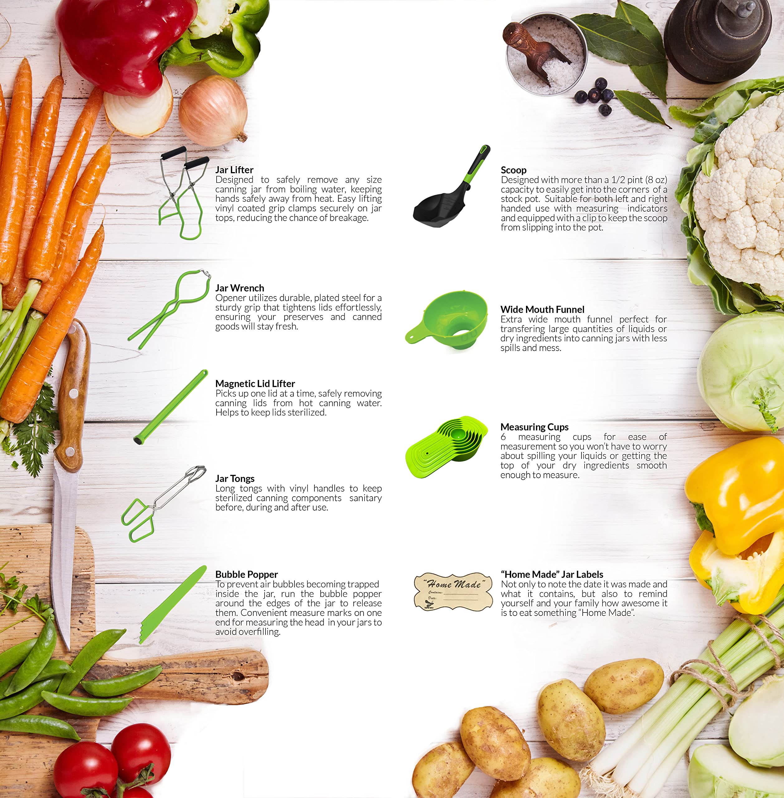 All-in-one canning supplies - This home canning kit consists of all essential tools: canning funnel, jar lifter, bubble popper (measurer), magnetic lid lifter, jar wrench, canning tongs, large canning scoop (More than ½ Pint), 6 measuring cups and a set of "Homemade" labels to remind everyone of the hard work you have put in to make it :)