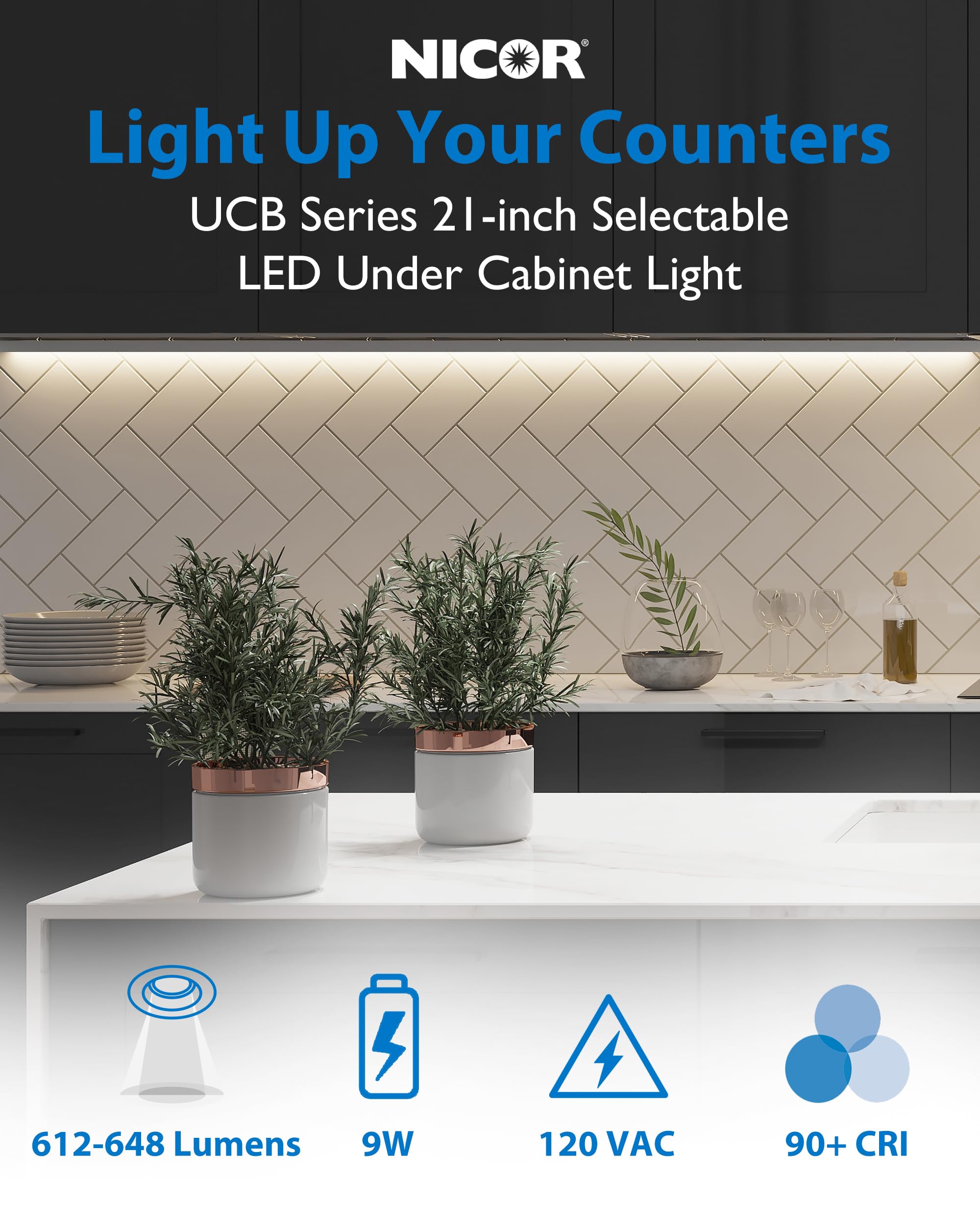 Illuminate Your Space with our UCB Series Under Cabinet Lighting Hardwired LED Under Cabinet Lighting Our LED under cabinet lighting hardwired offers a customizable experience with 5 selectable color temperatures: 2700K under cabinet lighting wired, 3000K under cabinet lights wired, 3500K undercabinet lights for kitchen hardwired, 4000K under cabinet lights hardwired, and 5000K under cabinet LED lighting hardwired. Whether you need a warm, cozy ambiance or bright, energizing light, this hardwire under cabinet lighting allows you to match any mood or setting. With a 90 CRI rating and R9 over 50, this undercabinet LED lights for kitchen provides accurate color rendering, while the polycarbonate diffuser ensures uniform illumination across your space. Designed for efficiency and performance, these 5W under counter lights for kitchen wired deliver 340 to 360 lumens at 120VAC, offering ample brightness with lower energy consumption. The under counter lights for kitchen hardwired are also dimmable down to 5% when used with standard TRIAC or ELV dimmers. The 9-inch undercounter led lights for kitchen, 24 inch led under cabinet light, 24 inch under cabinet light, as well as 12 inch, 18 inch, 21 inch, 33 inch, and 42 inch under counter light has a direct-wire design and surface-mount hole for easy setup. With multiple knockouts, these under the cabinet lights for kitchen support multidirectional wiring and can be quickly daisy-chained to other lighting fixture. These under counter LED lights are versatile enough to fit into various spaces, whether as kitchen under cabinet lights, under shelves undermount cabinet lighting, or in workspaces. Our undercounter lights’ 1-inch low-profile design and gloss white finish create a clean, professional look that enhances interior design.