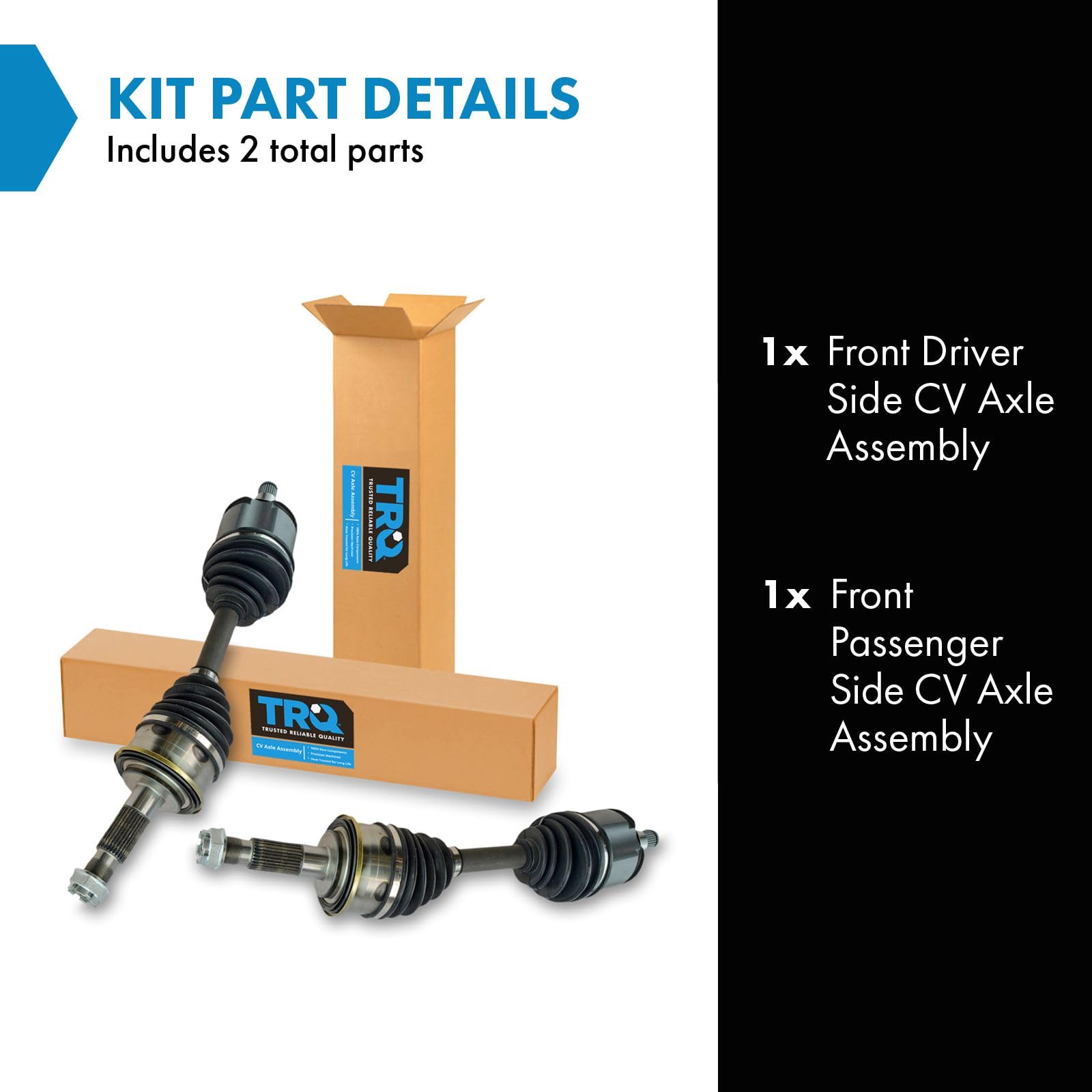 2 Piece CV Axle Assembly Set Kit Includes (1) Front Driver Side CV Axle Assembly (1) Front Passenger Side CV Axle Assembly Fitment Compatible with: 2001-04 Toyota Tacoma 4 Wheel Drive Front Driver & Passenger Side Compatible with: 1996-02 Toyota 4Runner 4 Wheel Drive Front Driver & Passenger Side Compatible with: 1995-00 Toyota Tacoma 4 Wheel Drive Front Driver & Passenger Side with Auto Locking Hubs Product Attributes Quantity: 2 Piece Product Features 100% New: Manufactured to tighter tolerances for extended service life Neoprene Boots: Improved durability compared to stock material Moly Greased: Specifically-designed grease shield to reduce premature wear Application Specific Design: No modification Item Details TRQ CV (constant velocity) drive axles are manufactured using premium raw materials designed to restore original performance. TRQ CV drive axles are new, so there is no core charge with your TRQ purchase. TRQ-designed drive axles utilize neoprene boots, moly grease, stainless steel clamps, and heat-treated ball tracks to ensure extended service life. Each TRQ axle is application-specific so each spline and thread will mate properly for a seamless fit. All products are fit and road-tested in our Massachusetts R&D facility to ensure we deliver on our promise of Trusted Reliable Quality. Reference Numbers 4343004020 4343035030 447-59584 447-59693 66-5134 NCV69142 TO-8308 TO8308