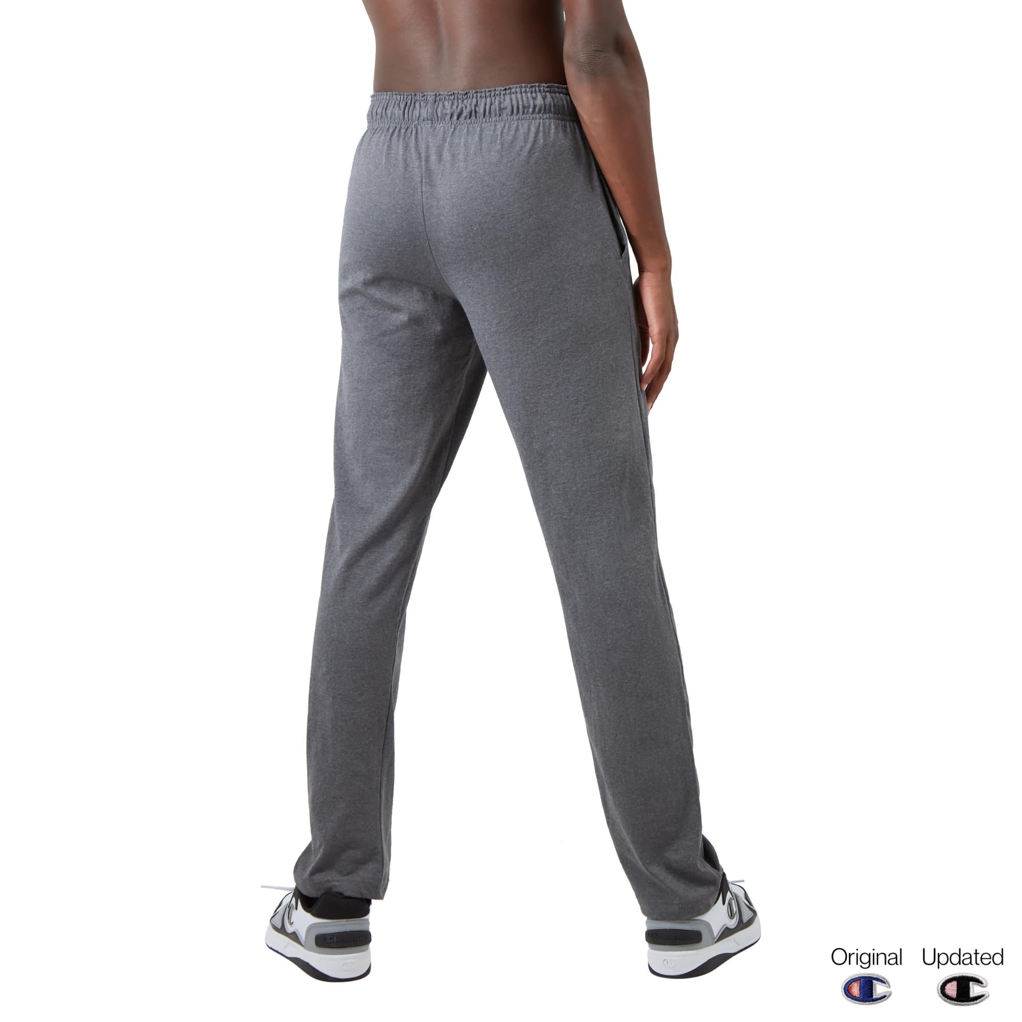 Description CLASSIC CHAMPION STYLE. These menβs open-hem lounge pants deliver ultimate lightweight comfort and are as soft as your favorite jersey knit t-shirt. Made for everyday at-home wear, their minimalist design features a stretch waistband with drawcord closure for a customizable fit. Convenient side pockets are the perfect place to store your phone, wallet, and more, while the open hem completes the laid-back look. These menβs lounge pants are finished with a Champion C logo patch at the left hip and are ready to be paired with your favorite tee or hoodie for an effortlessly cool 'fit.