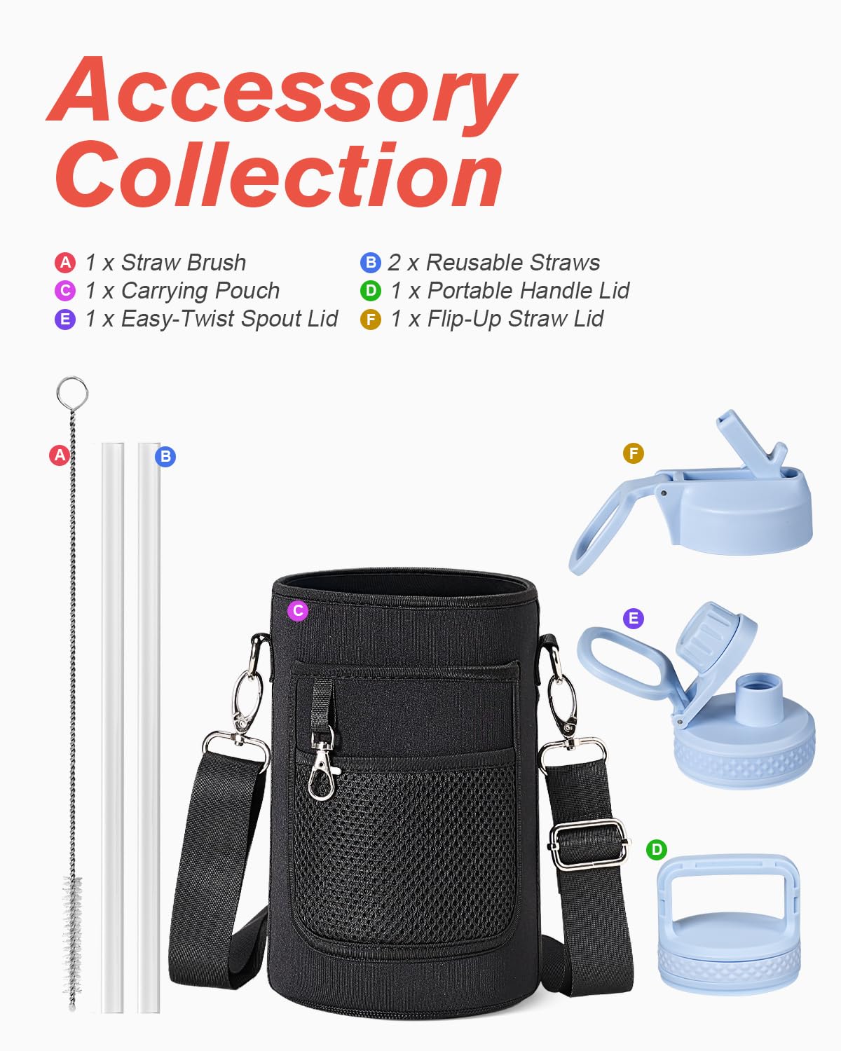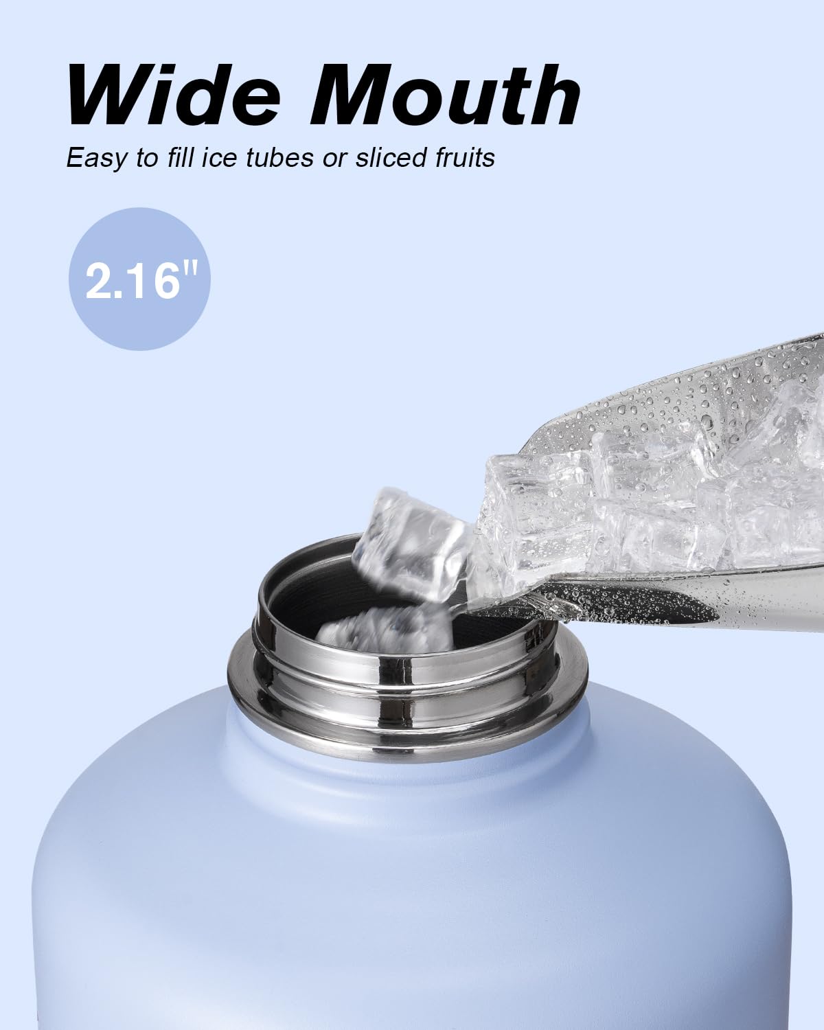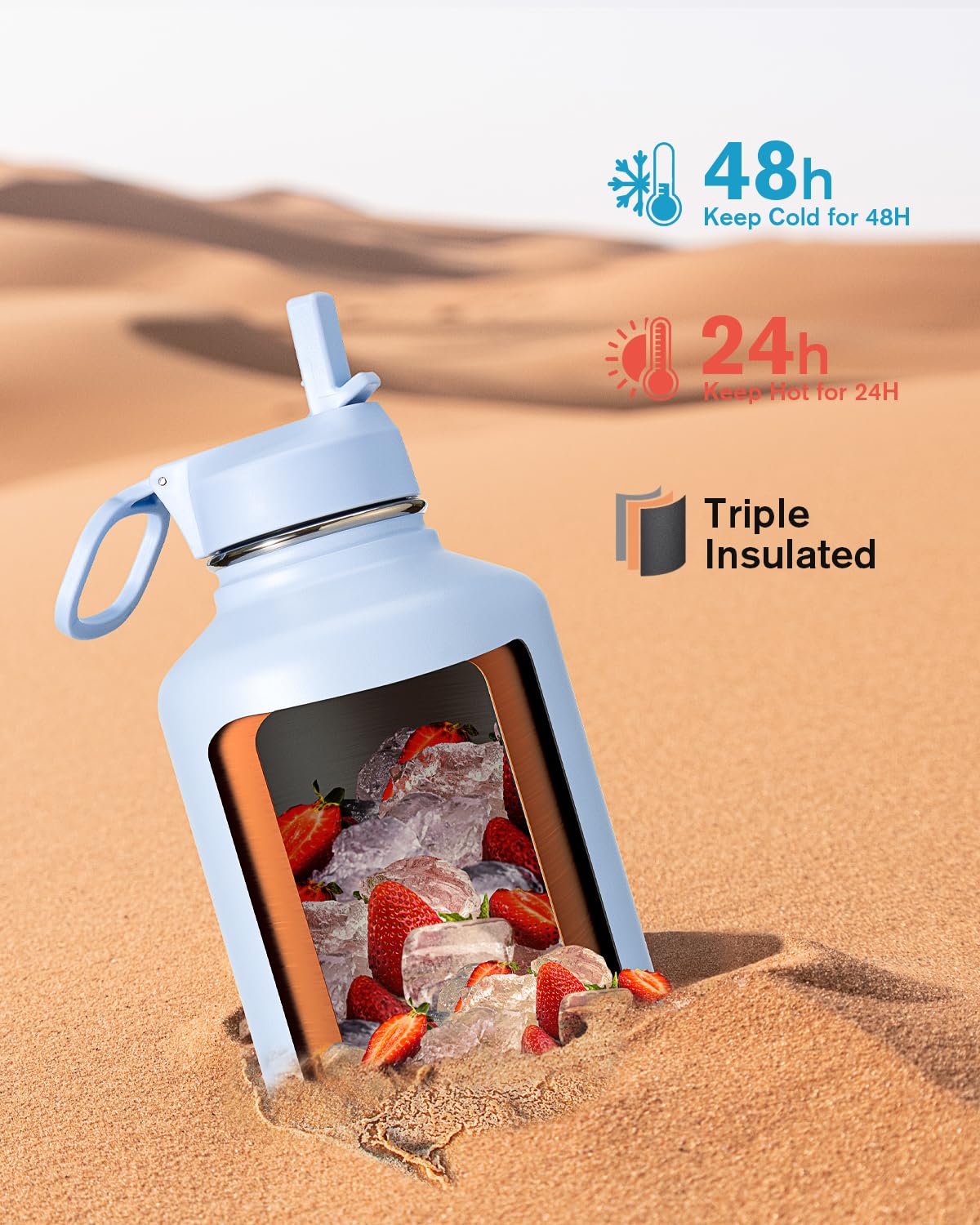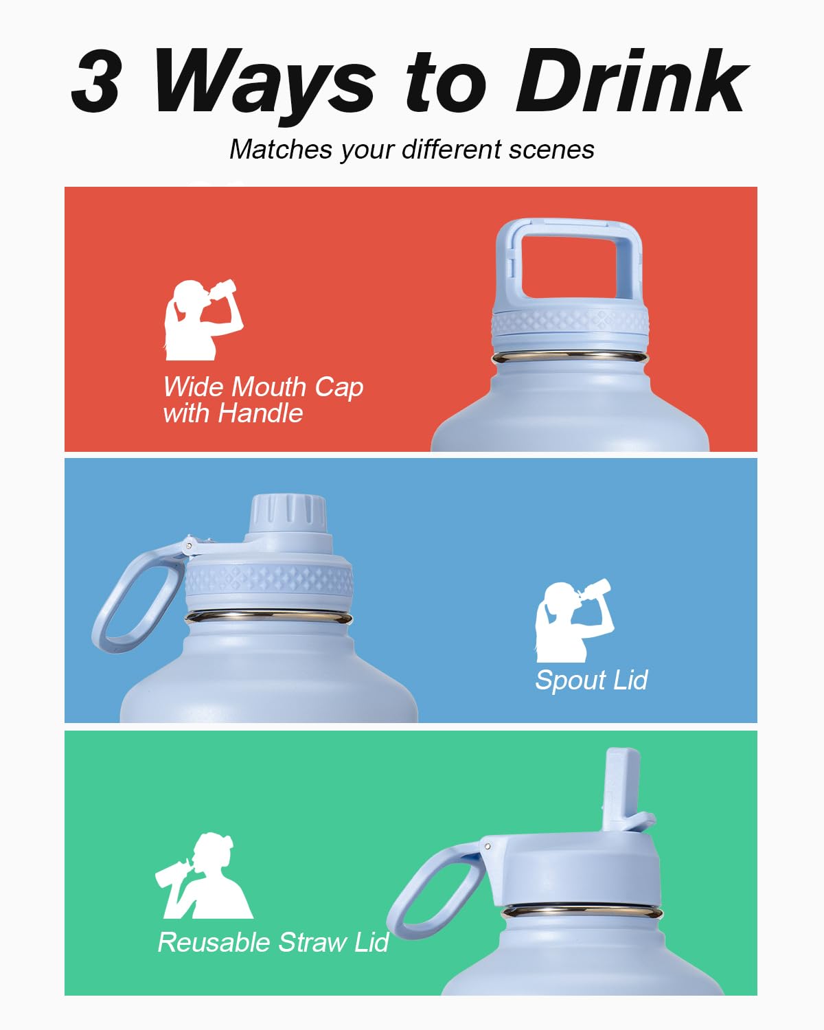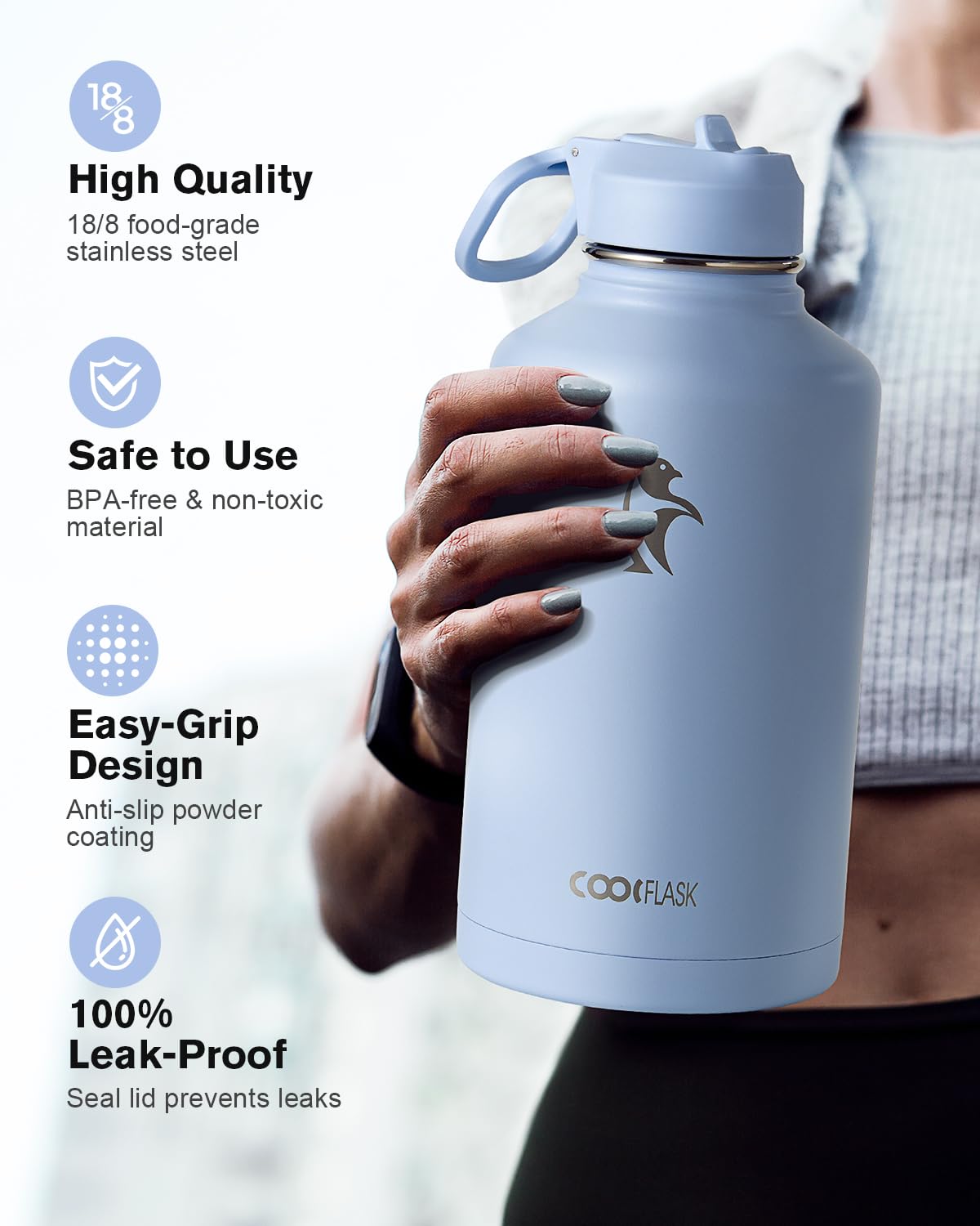 Half Gallon Water Bottle Insulated with Straw & 3 Lids, Coolflask 64 oz Water Jug Large Metal Stainless Steel Wide Mouth for Sports, Gym or Office, Non-BPA Keep Cold 48H Hot 24H, Light Blue
