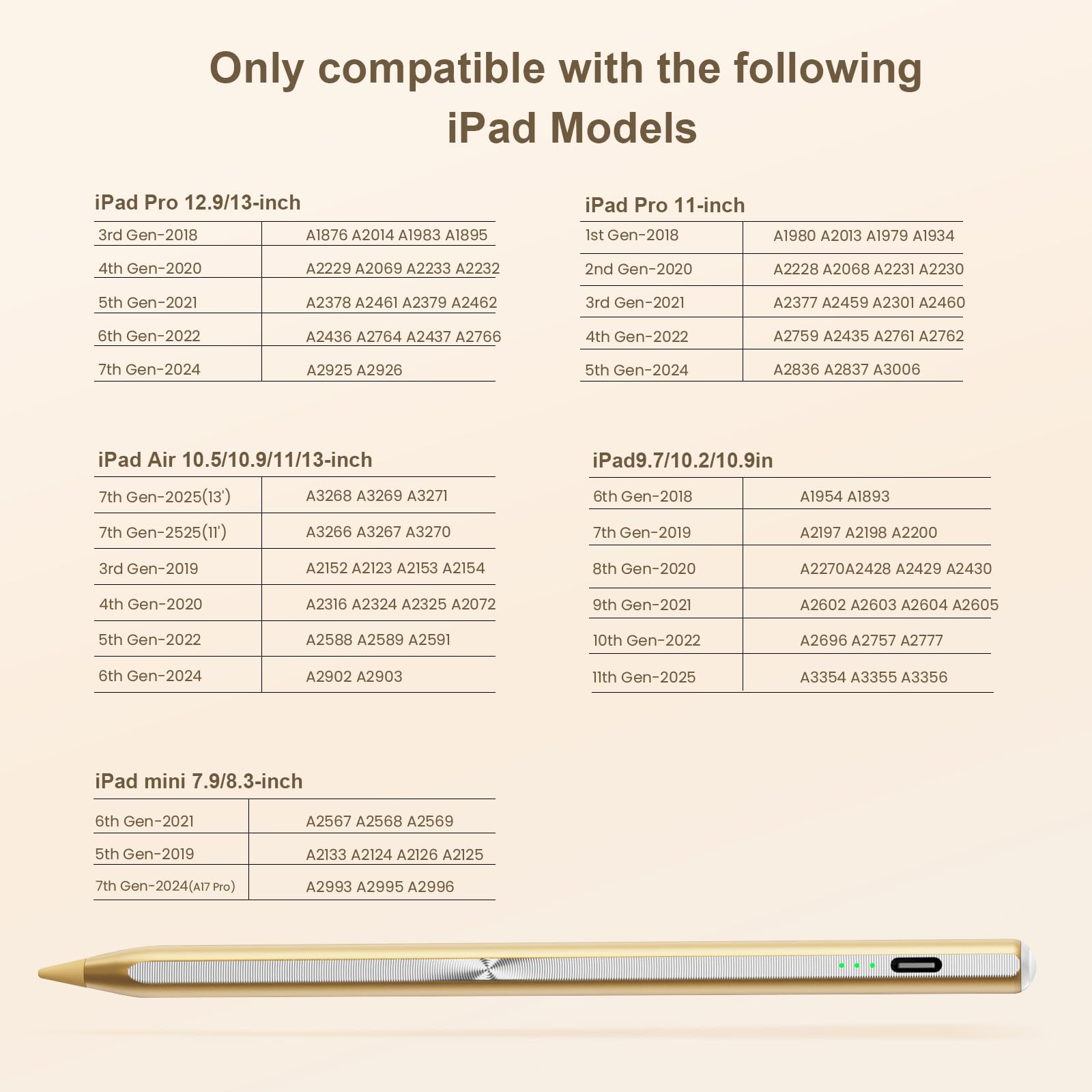 🖊【Wide Compatibility】: Stylus pen supports iPad 2018-2025 series:iPad 11th 11 inch 2025/10/9/8/7/6th Gen,iPad Air 7th 11 inch (M3) 2025/7th 13 inch (M3) 2025/6/5/4/3th Gen,iPad Pro 13 inch M4,iPad Pro 12.9 inch 3/4/5/6th Gen,iPad Pro 11 inch 1/2/3/4th/M4,iPad Mini 7th (A17 Pro)/6/5th Gen.NOTE: The Pencil is NOT compatible with iPad models before 2018, iPhone, Android and Microsoft devices. Please check your product model before placing an order.