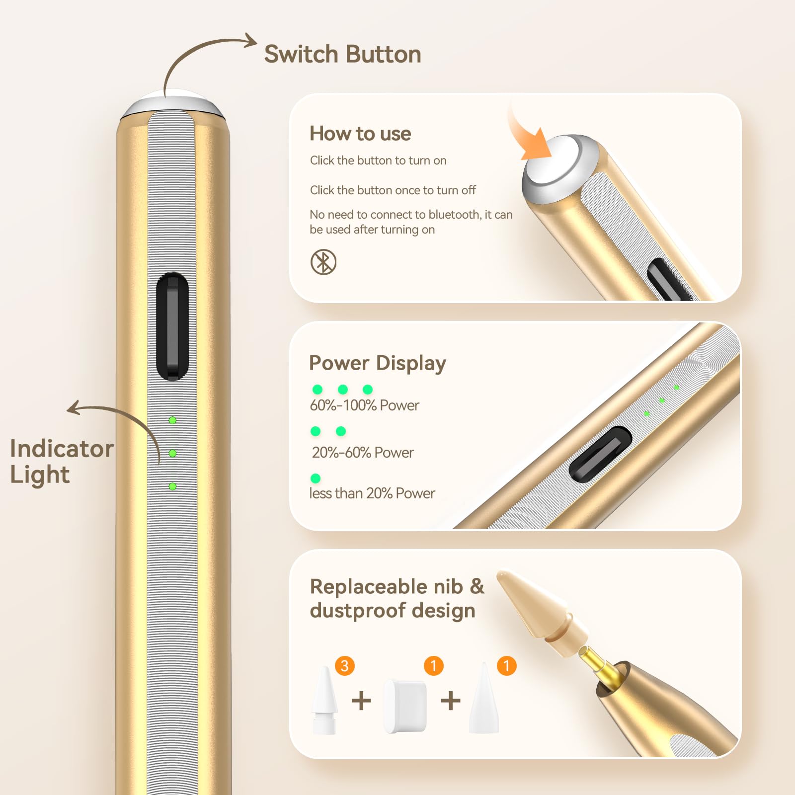 🖊【Battery Display/No Bluetooth Required】:No need for Bluetooth connection, turn on this stylus pen by simply touching the cap button. Hastraith ipad pencil has 3 battery indicator lights: All lights on: 70%-100% power, 2 lights on: 30%-70% power, 1 light on: 5%-30% power, 1 light flashing: less than 5% power. Therefore, you can view the battery consumption progress in real time so that you can charge it before important work begins.