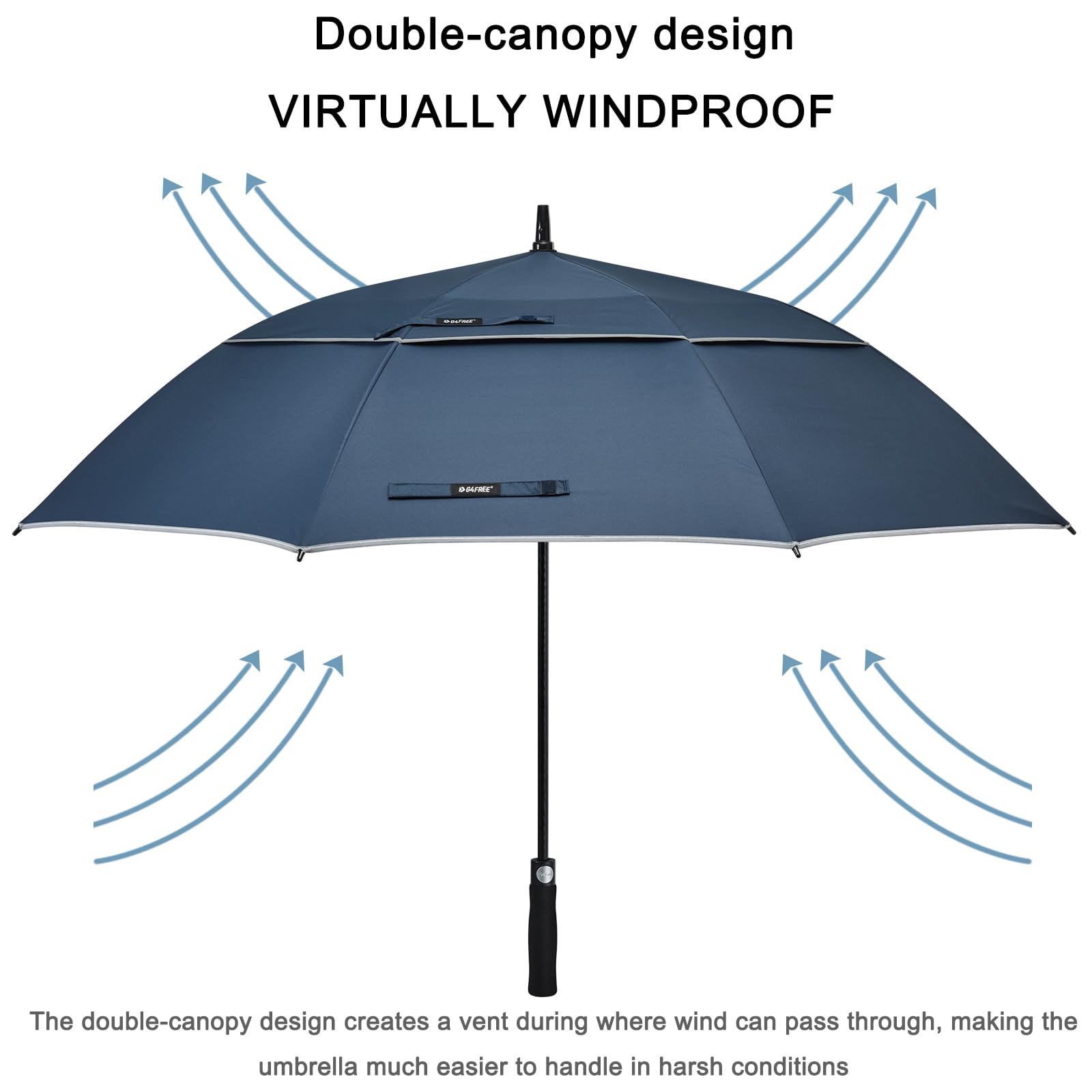 YOU (WON'T) BE BLOWN AWAY The double-canopy design and fiberglasses frame will ensure that your umbrella is VIRTUALLY WINDPROOF. Wind will simply not break it. The double-canopy design creates a vent that wind can pass through, making the umbrella much easier to handle in harsh conditions.