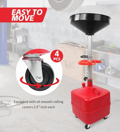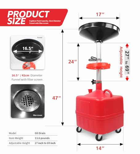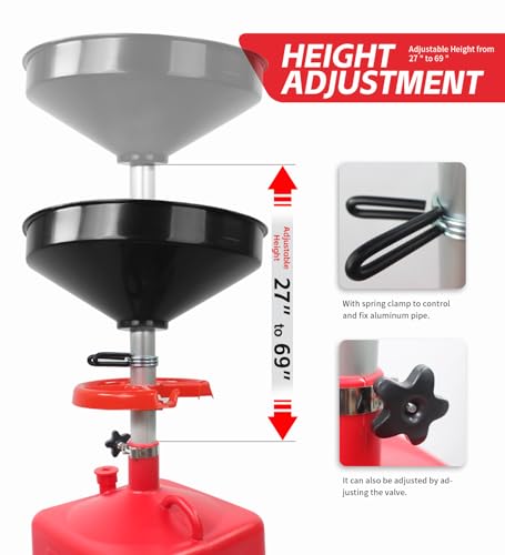 9 gallons Fluid Capacity, 42cm Diameter Funnel with filter screen, Equipped with 4x 2.5" casters, Adjustable Height from 69cm to 175cm.