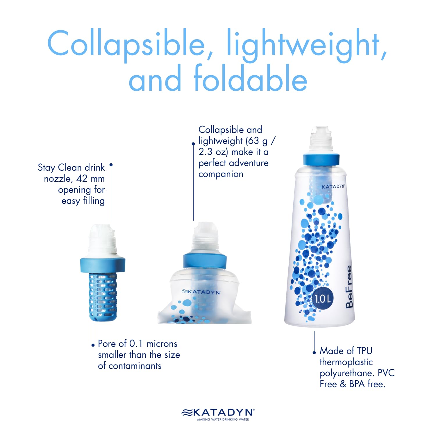 With the Katadyn befree water filtration system, you no longer have to worry about where your next drink will come from. Just fill up the flask and let the ez-clean membrane do the work. Gently squeeze the flask for instant refreshment. Maintain the ez-clean membrane quickly and easily for longer life and more enjoyment. Simply fill the flask with water, attach the cover and Shake free the debris. Or, remove the Filter from the flask and swish in any lake, River or stream. And when you're ready to hit the road, the collapsible flask packs small to fit into tight spaces. Just smash, stash and go!.Hydrapak soft flask is longer lasting, rugged, high-tech, flexible, bpa-freeno backflushing and no clumsy tools. Simple Shake or swish the ez-clean membrane in the water and be on your way0.1 micron hollow fiber technologyfor solo usesuitable for cloudy waterlightweight and portableflow rate: 2 liter per minutetested to 1000 L, depending on water qualitywt. 2.3 oz (63g)size: 10.0 x 4.25 x 3.0 in (25.4 x 10.8 x 7.7 cm).