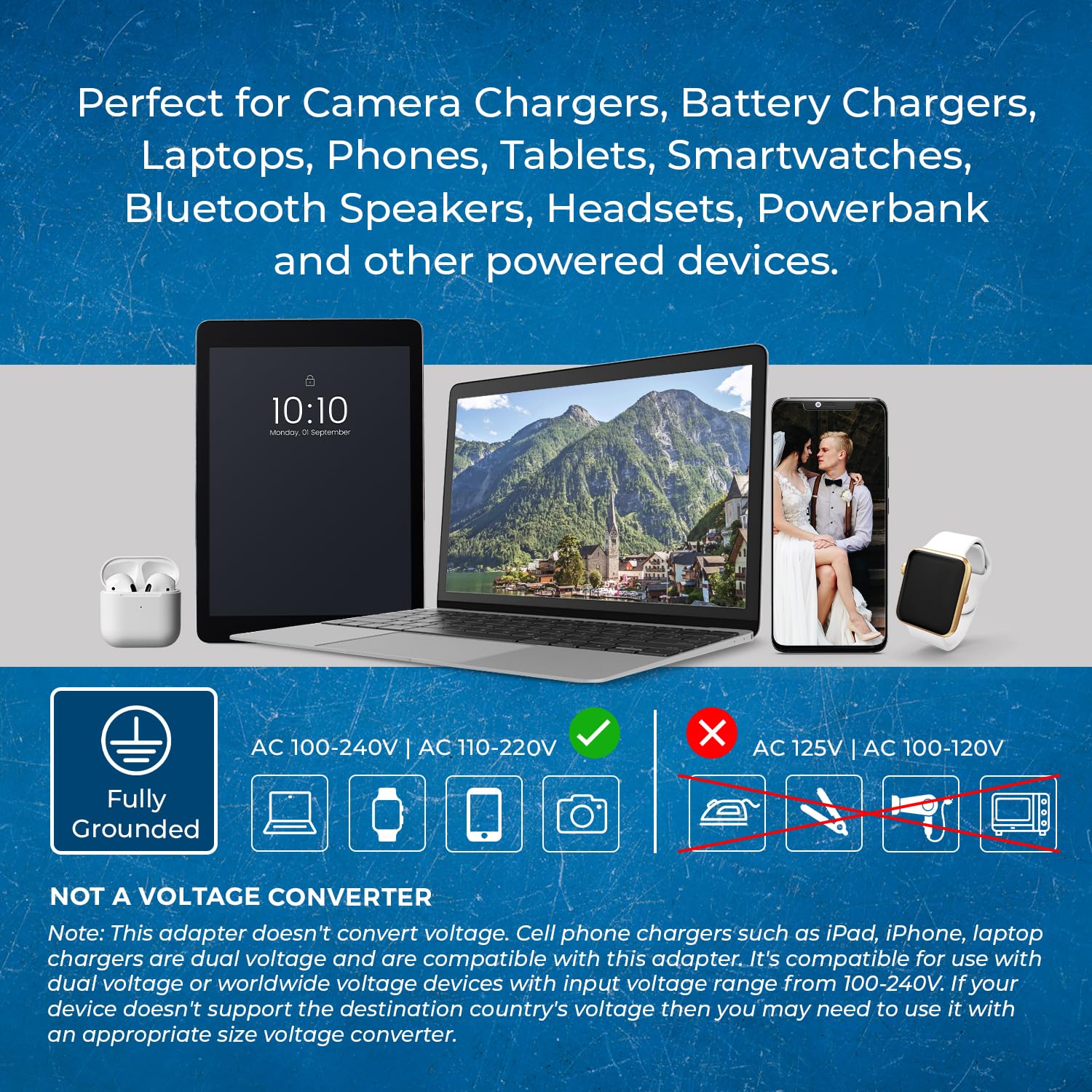 Important: This is just a travel adapter, it will not work with devices that require a voltage converter. It will only work with dual voltage products such as cell phones, chargers, & laptops etc.
