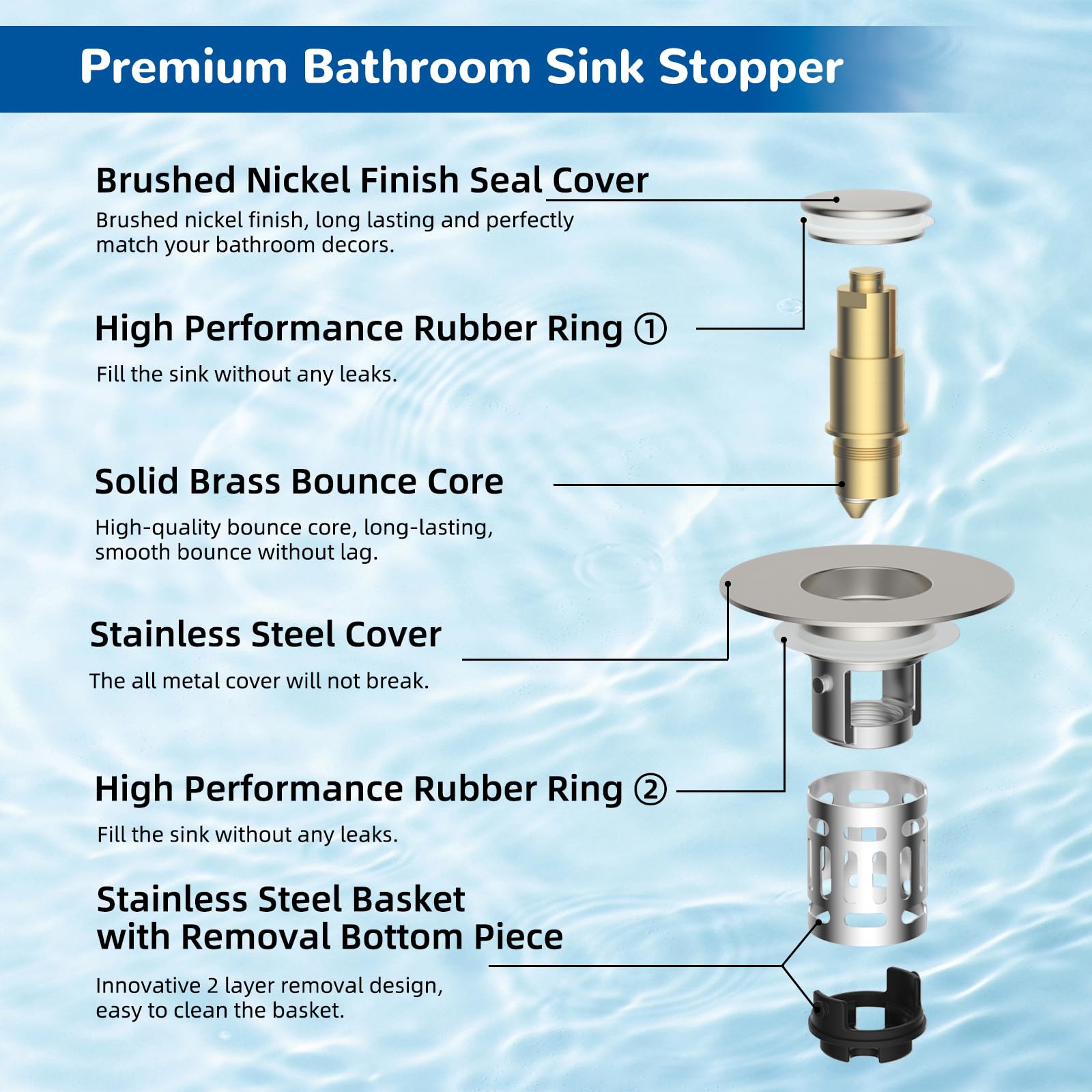 [Pop-up Design] Our pop-up sink drain strainer is made of high-quality stainless steel, plastic, and solid brass, providing exceptional rebound strength, corrosion resistance, and long-lasting durability. It features a long-lasting and sensitive pop-up brass bullet core mechanism, allowing you to easily switch between the water storage and fast drainage modes with just a gentle press
