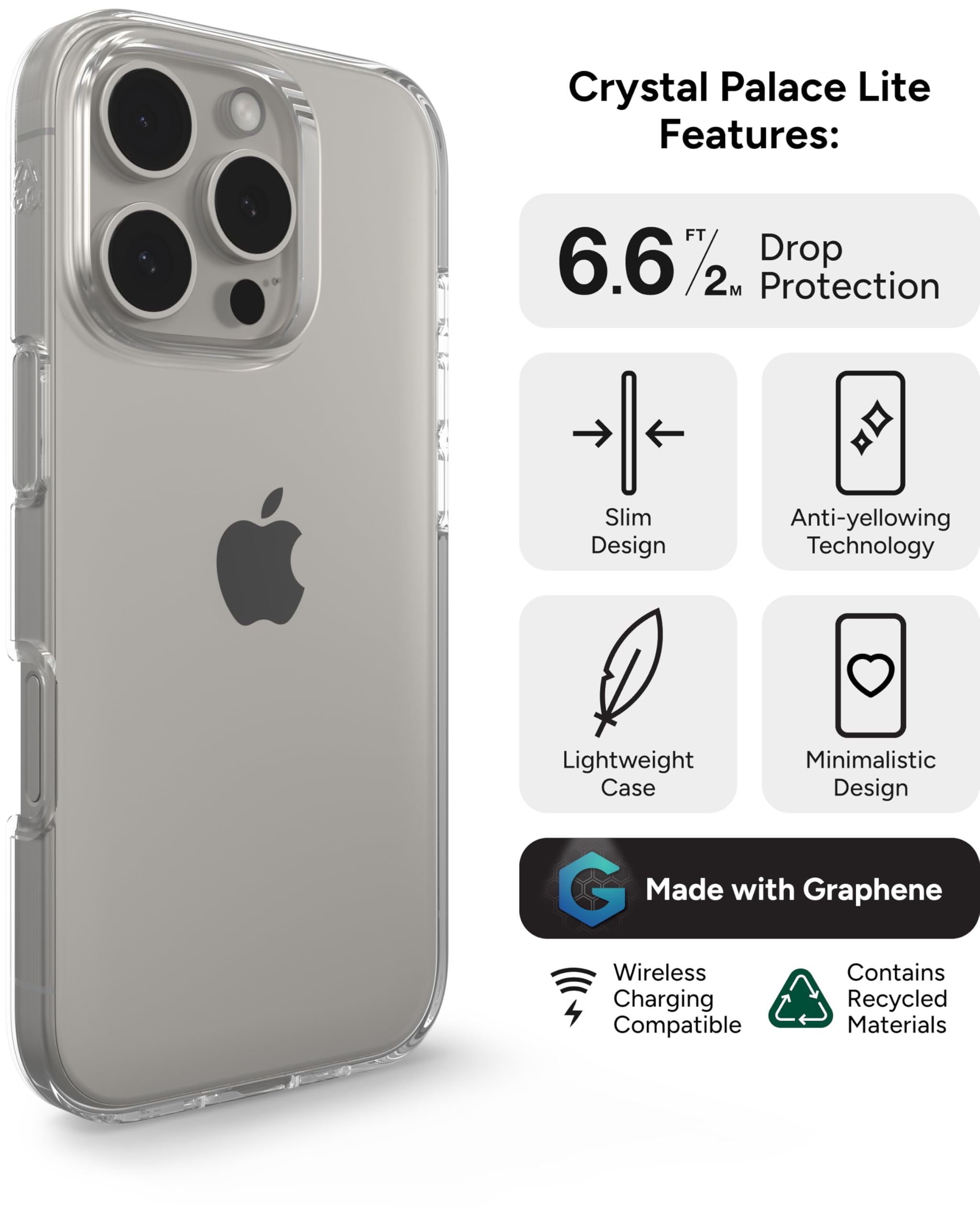The ZAGG Crystal Palace Lite case for the iPhone 16 Pro is designed to be your phone’s toughest defender without sacrificing style. Imagine you're on the move—your phone slips out of your hand and tumbles to the ground. With the Crystal Palace Lite case, you’re covered. This case offers military-grade drop protection, surviving drops from up to 6.6ft (2 meters) and meeting the Mil Std 810G 516 standard, ensuring that even in extreme conditions, your iPhone is safe. The case's anti-yellowing technology uses three advanced systems to keep the case looking crystal clear, so your iPhone’s sleek design is always on display. Plus, an anti-scratch finish helps preserve its beauty, making your phone look as pristine as the day you unboxed it. Not only is the Crystal Palace Lite case tough, but it’s also ultra-slim and lightweight, weighing 40% less than previous models. You get all the protection without the bulk, allowing your phone to easily slide into your pocket, bag, or hand. Thanks to the integration of graphene, one of the strongest materials known to man, the case provides unmatched durability and flexibility while maintaining a slim profile. And for those who care about the environment, the Crystal Palace Lite is made with up to 55% recycled materials, reducing your carbon footprint while offering the ultimate protection for your iPhone. It's also wireless charging compatible, allowing for seamless wireless charging without the hassle of removing the case. Key Features: Drop protection up to 6.6ft (2 meters) Military-grade protection (Mil Std 810G 516 certified) 40% lighter than previous designs Graphene reinforcement for enhanced strength and flexibility Three advanced anti-yellowing technologies and anti-scratch finish 55% recycled content for eco-friendly protection Wireless charging compatible for wireless charging Limited lifetime warranty by ZAGG
