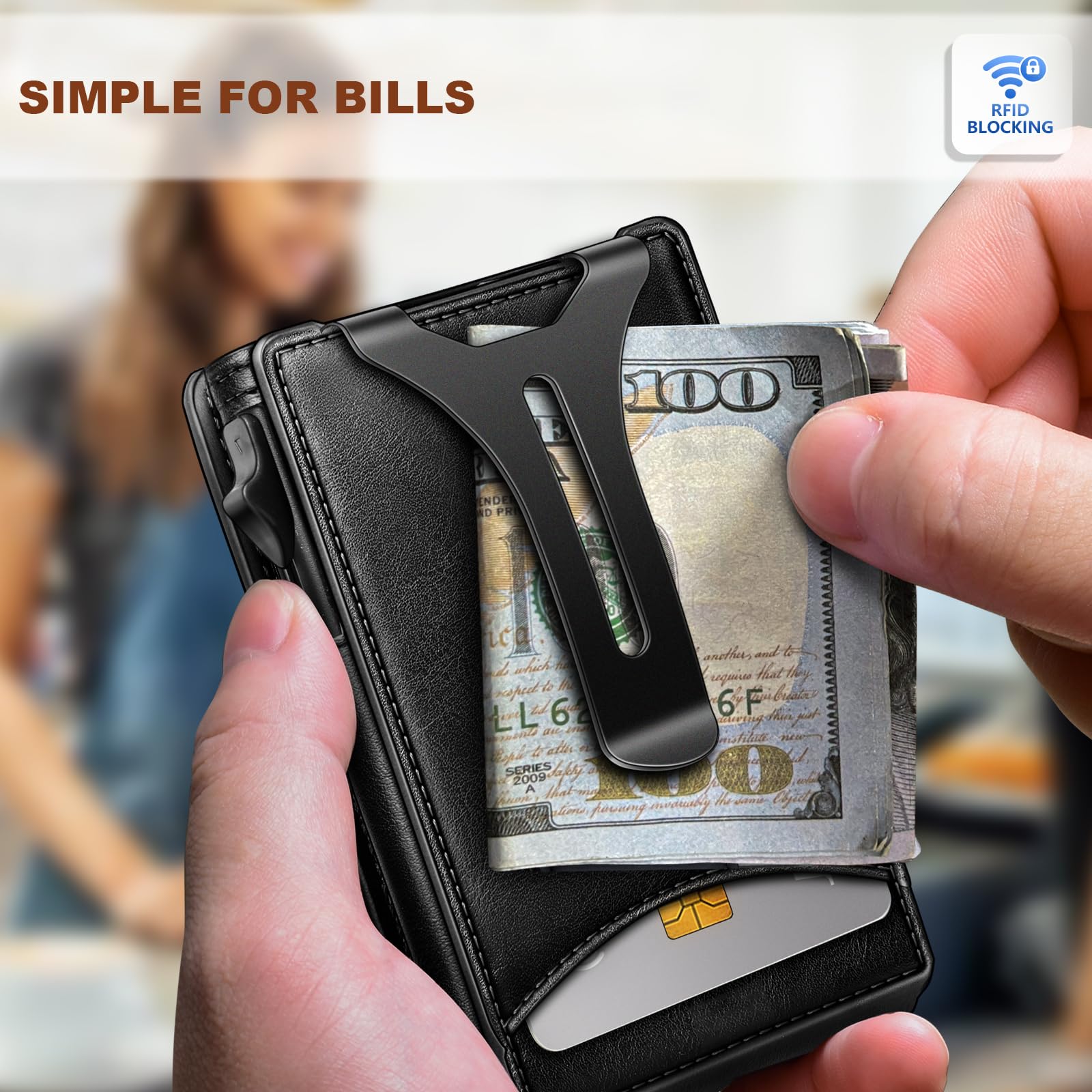 CAPACITY-Pop-up metal Case in flipping leather shell,9 card slots (including 1 ID window) and metal money clip for couple of bills;