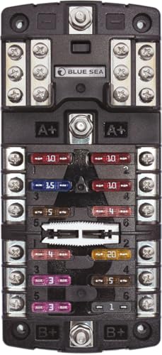 Organize and protect circuits with a covered fuse block. Fuse Blocks are an effective method of protection to prevent damage to wiring and possible fire in the event of an over-loaded or short circuit. This Blue Sea Systems space-saving fuse block can provide protection for new installations or when the panel has run out of breakers. Often used for electronic installations, this fuse block can be fed by one breaker from the distribution panel and supply power to 12 additional circuits. Compact size allows it to be installed in tight spaces close to the loads they protect. Accept ATO/ATC fuses that provide protection from 1 amp to 40 amps.