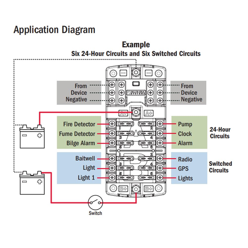Split Bus Fuse Block with ground for use when a mix of switched and 24-hour circuits are desired in the same block