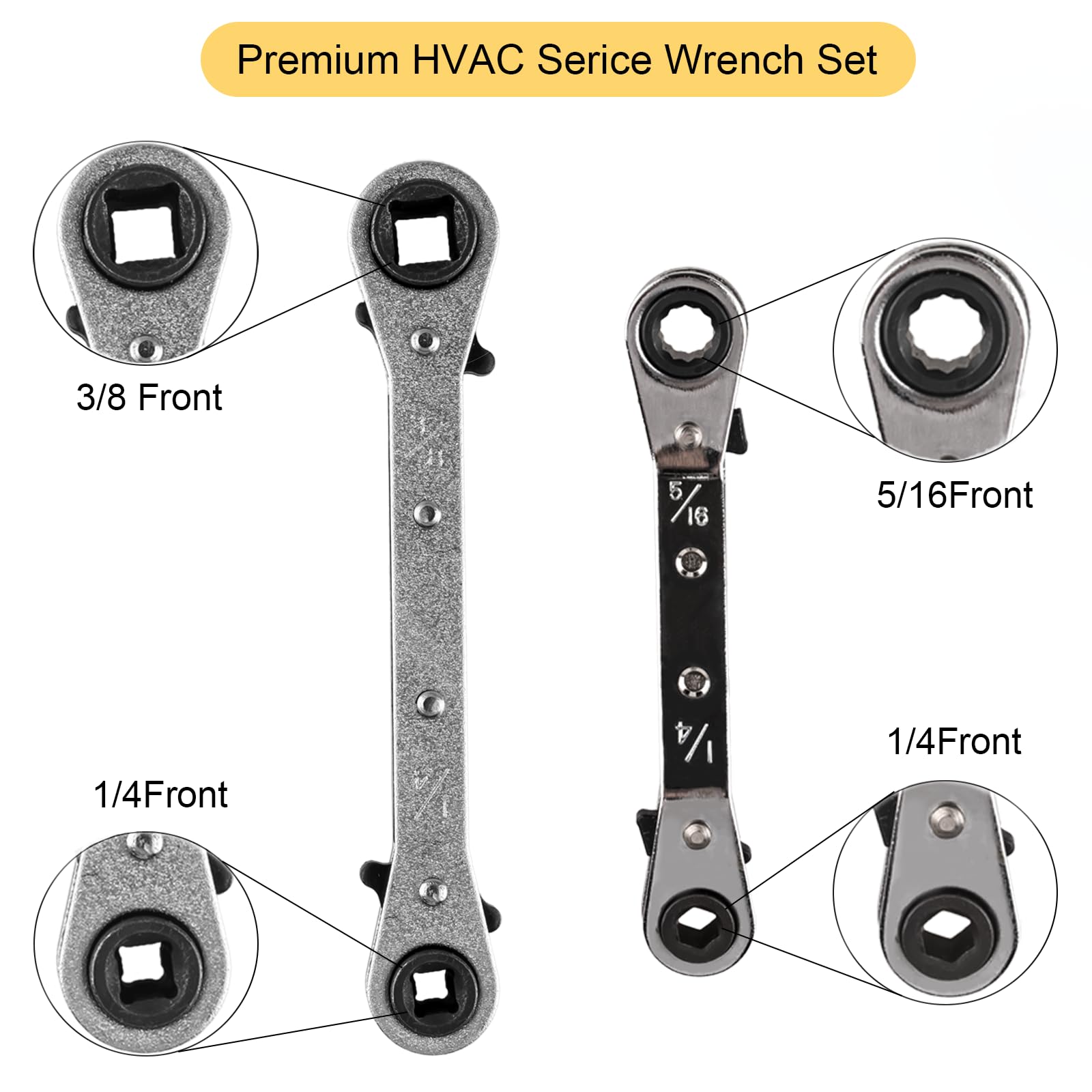 What You Get: Package include 1pc Valve Core Remover Installer Tool, 1pc 1/4 & 5/16 HVAC service wrench, 1pc 3/8'' to 1/4'', refrigeration service wrench, 2pcs hex bit adapters and 10pcs valve core