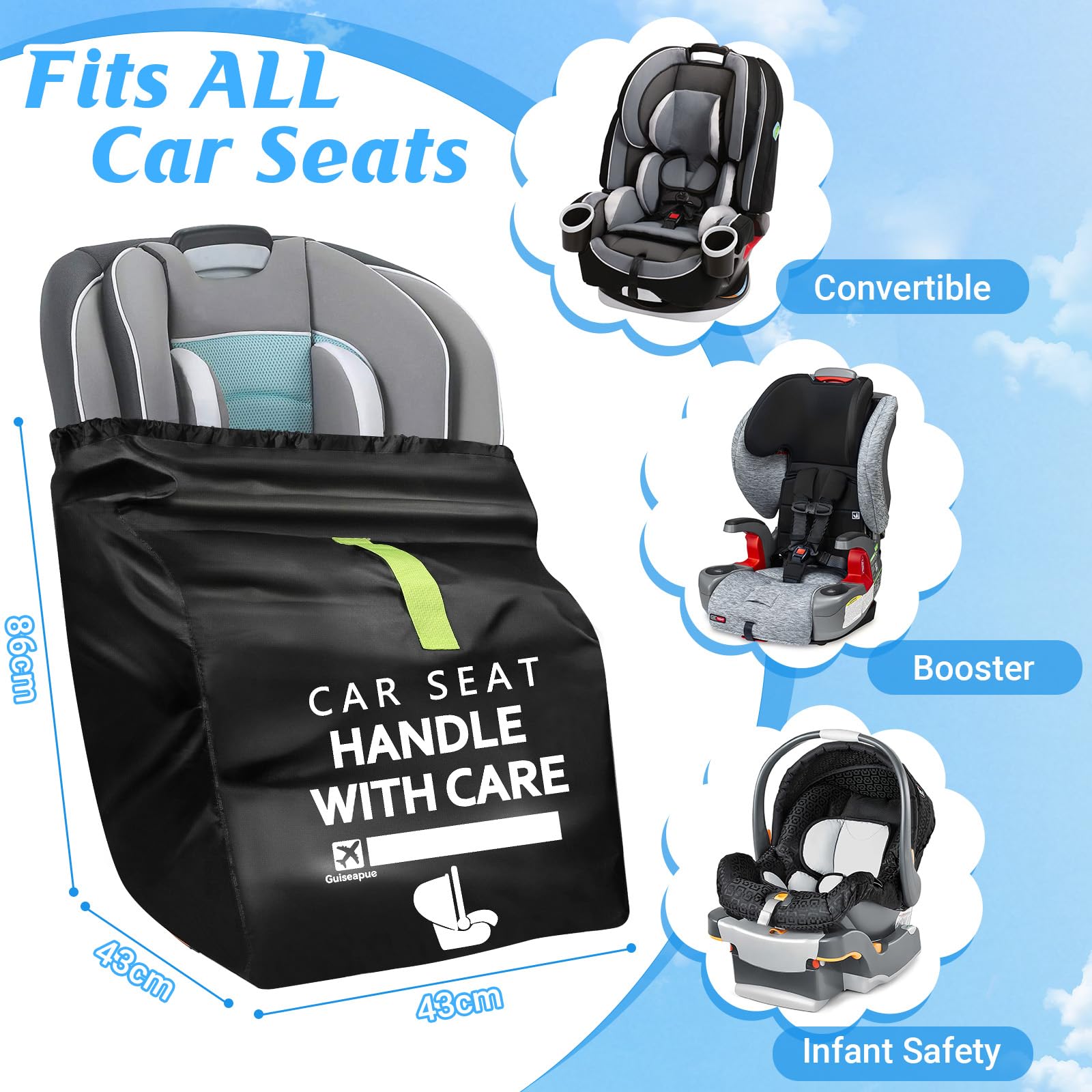 Wide Compatibility: This car seat travel bag for airplane comes in a 34x18x18inch size which can easily accommodate almost all major brands of Infant carriers, booster seats, convertible car seats, fits for Doona/Graco/Evenflo/Maxi Cosi/Britax/Cybex/Chicco.