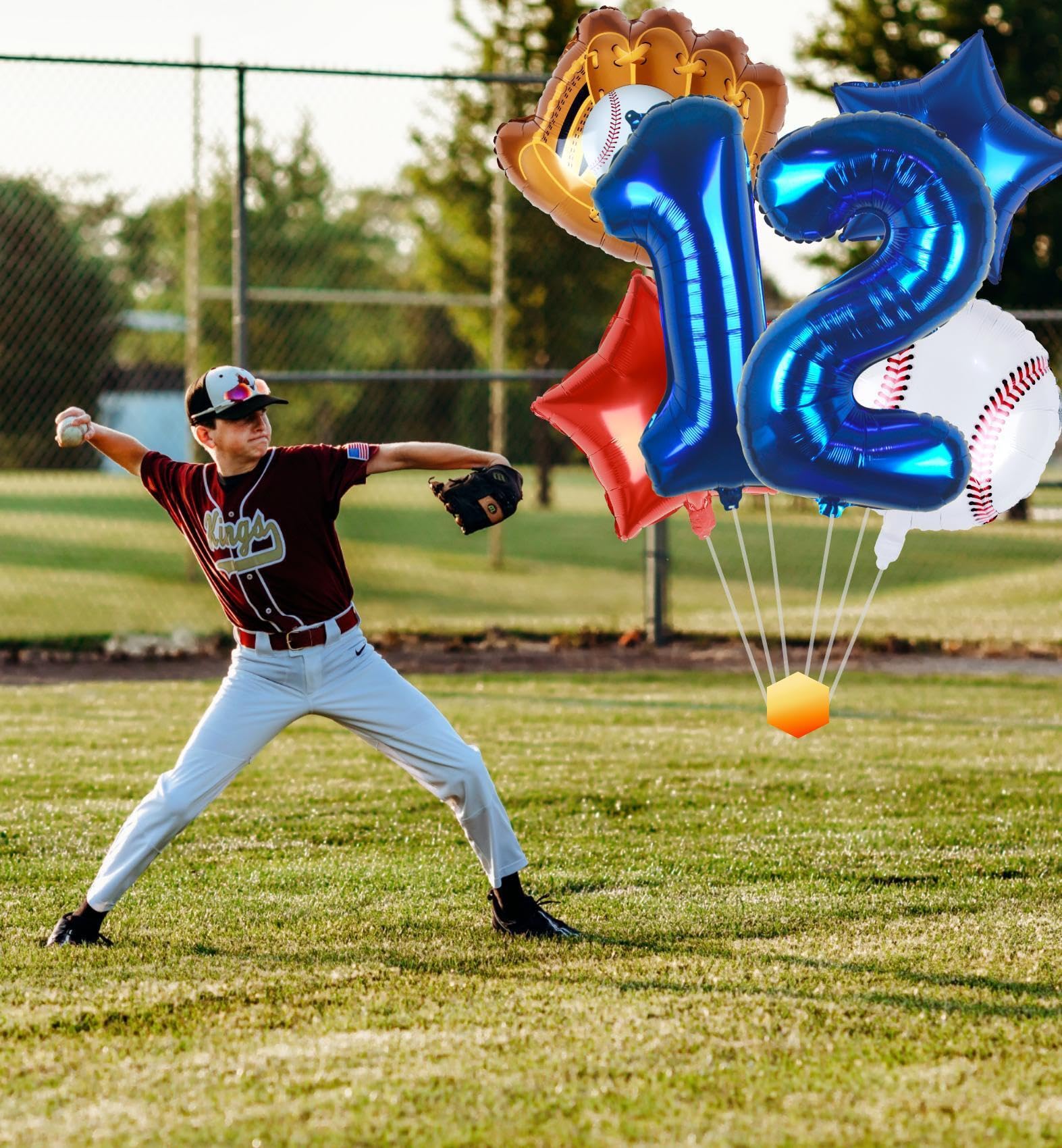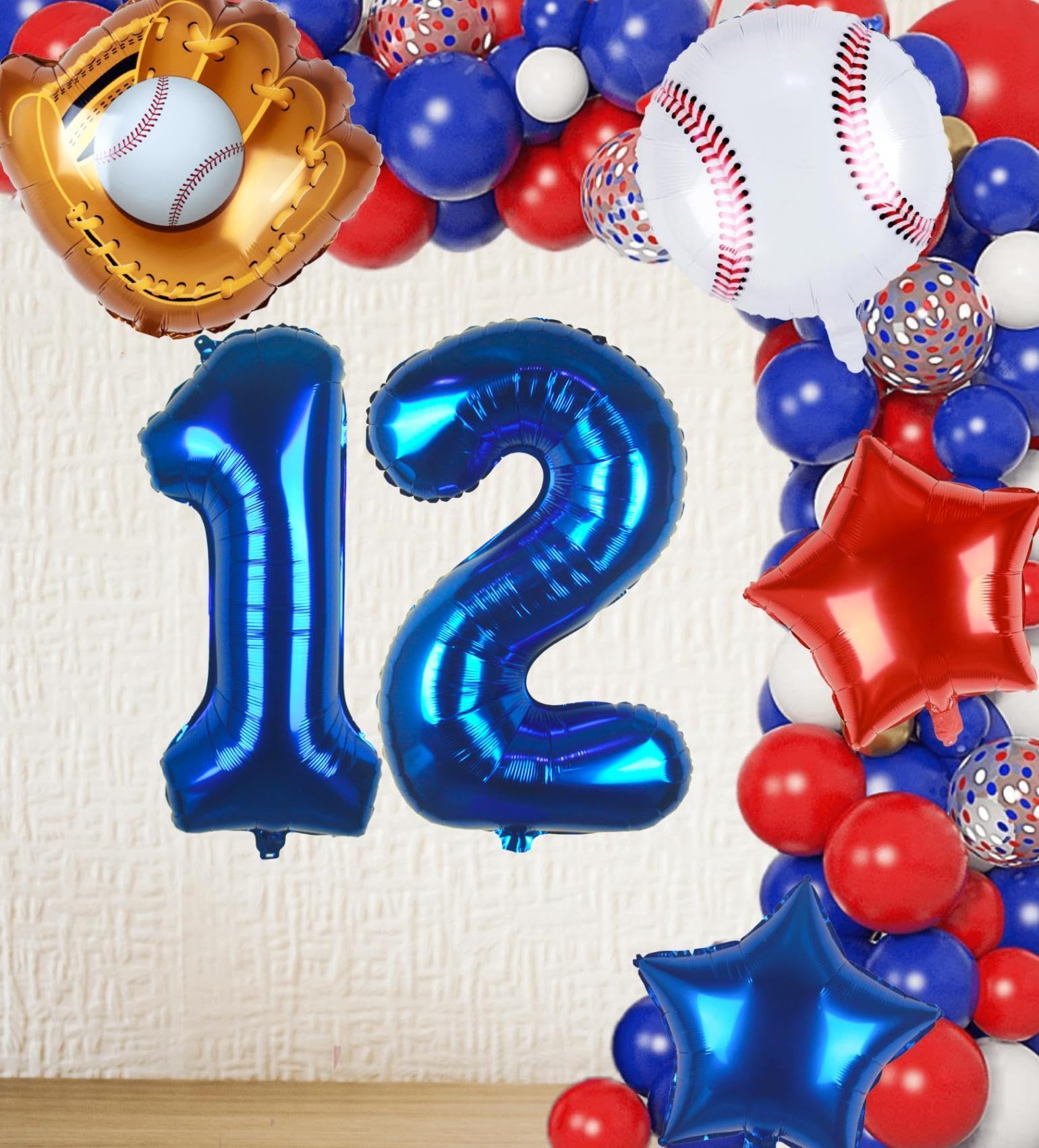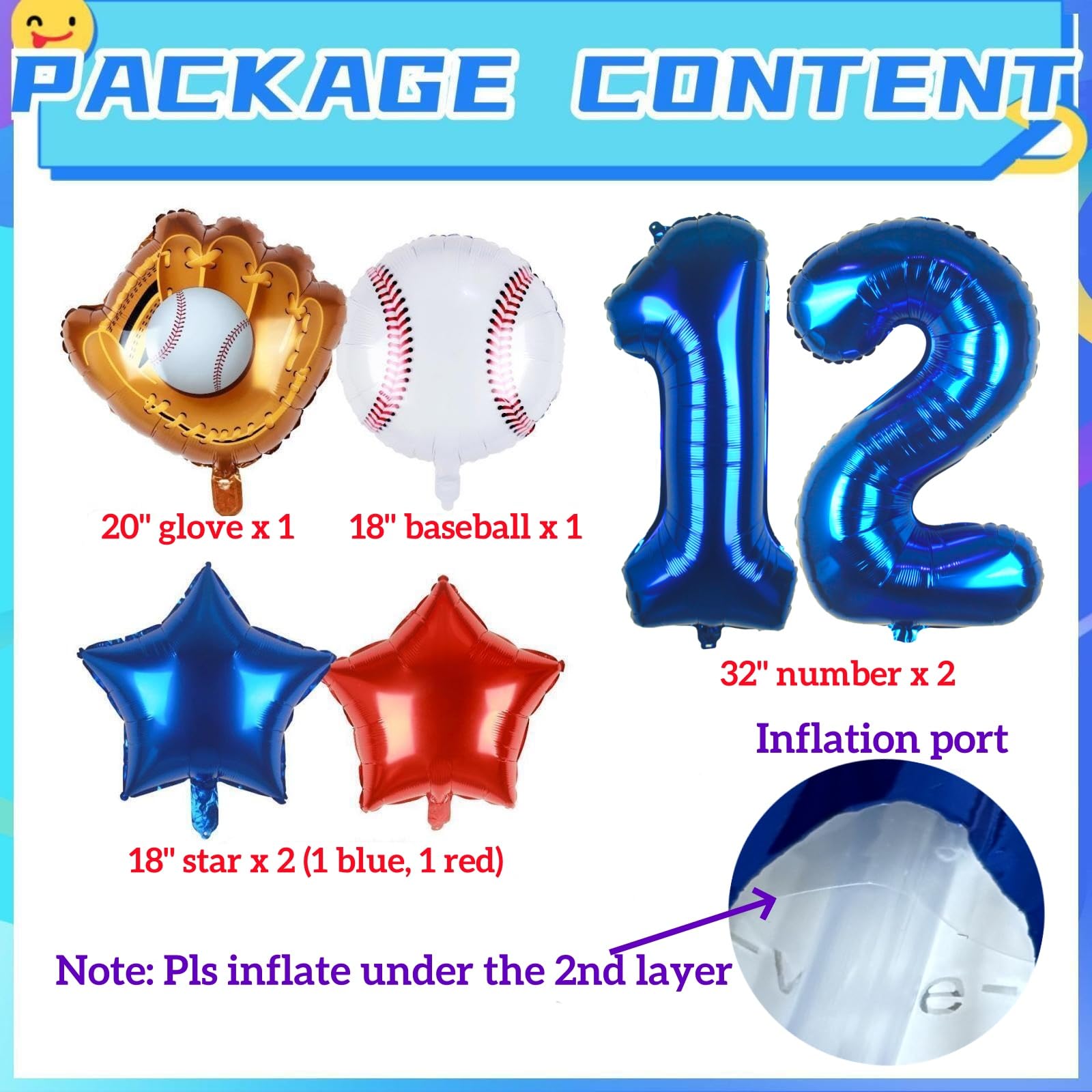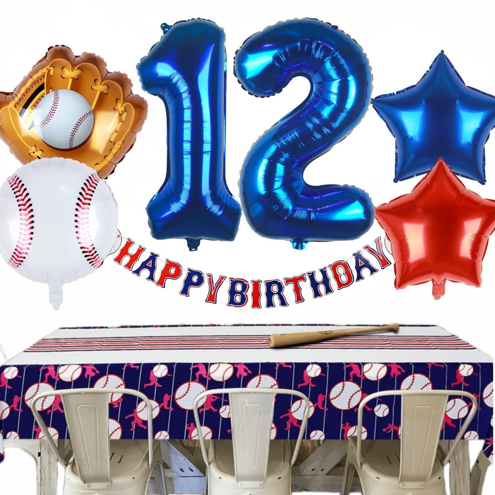 6 PCS PACK | BASEBALL PARTY DECORATIONS: 32inch navy blue number 12 balloon x 1, 18inch foil baseball balloons x 1, 20inch baseball glove balloons x 1, 18inch star balloons (1 dark blue, 1 red), straw x 1, 32ft ribbon.