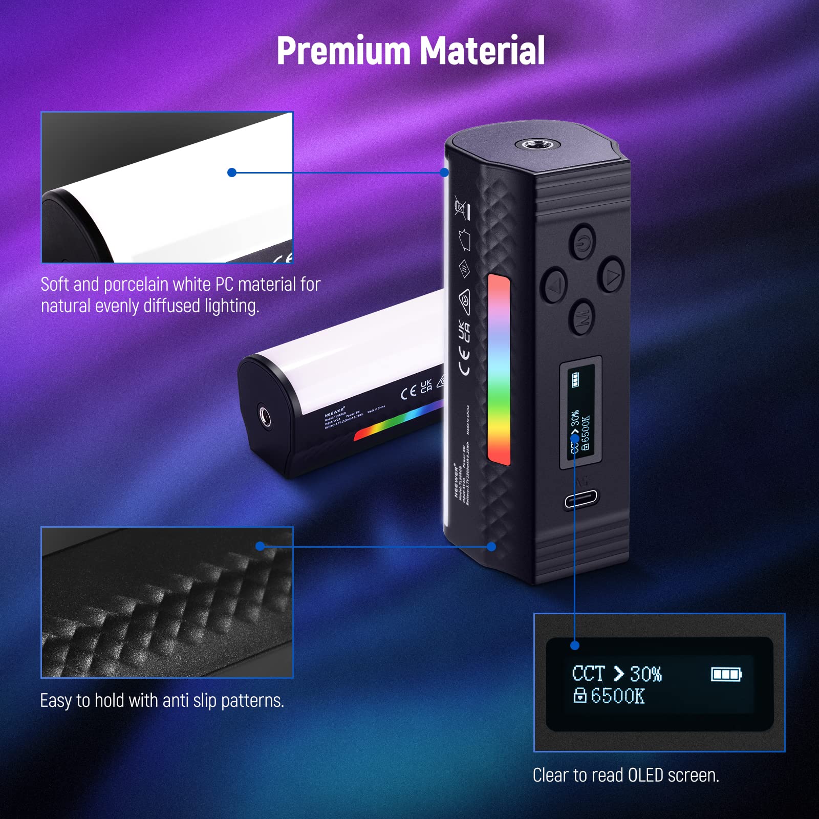 【Pocket Sized Mini Handheld Light Wand】Measuring 10.8cm/4.3" in length and 4cm/1.6" in width, and weighing only 134g/4.7oz, this handheld mini light stick wand contains 96 pieces of high performance LED beads with 6W maximum power, 97 CRI, 120° illumination angle, and 800 lux/0.5m illuminance. Clearly read light settings with the LCD display. For optimal lighting, keep it close to your subject (within a 6.6’/2m distance)
