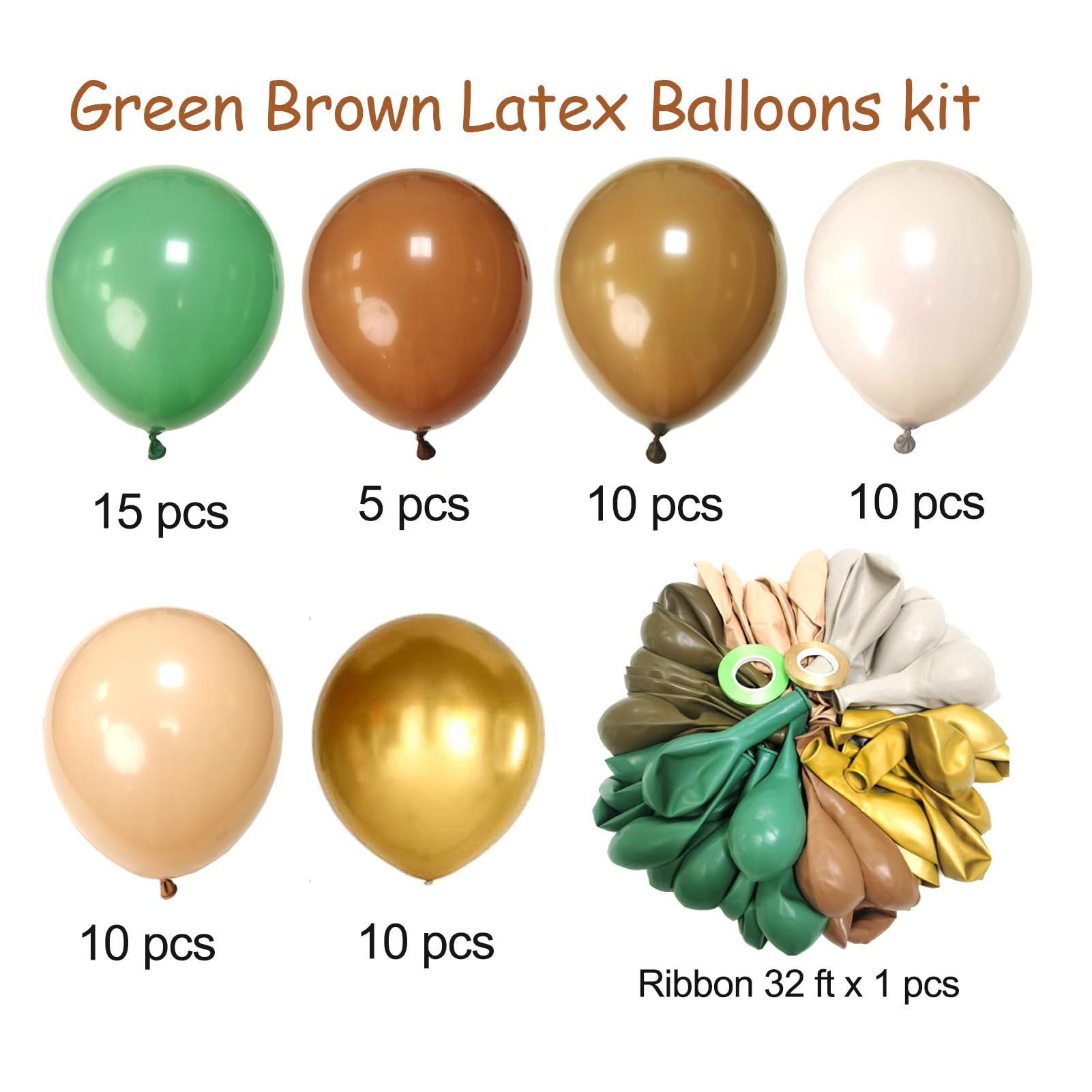 【All-in-One Kit】: This green brown gold balloon kit includes everything you need to create a stunning decoration, metallic chrome gold balloons 10pcs, sage olive green retro green balloons 15pcs, cream balloons 10pcs, blush nude balloons 10pcs, brown balloons 10pcs, coffee cocoa balloons 5pcs, 2pcs green balloon ribbons 32ft. The size of the balloon is about 12 inches after inflation. the synergy of green brown cream gold balloon jungle balloons can make any party or occasion more elegant.