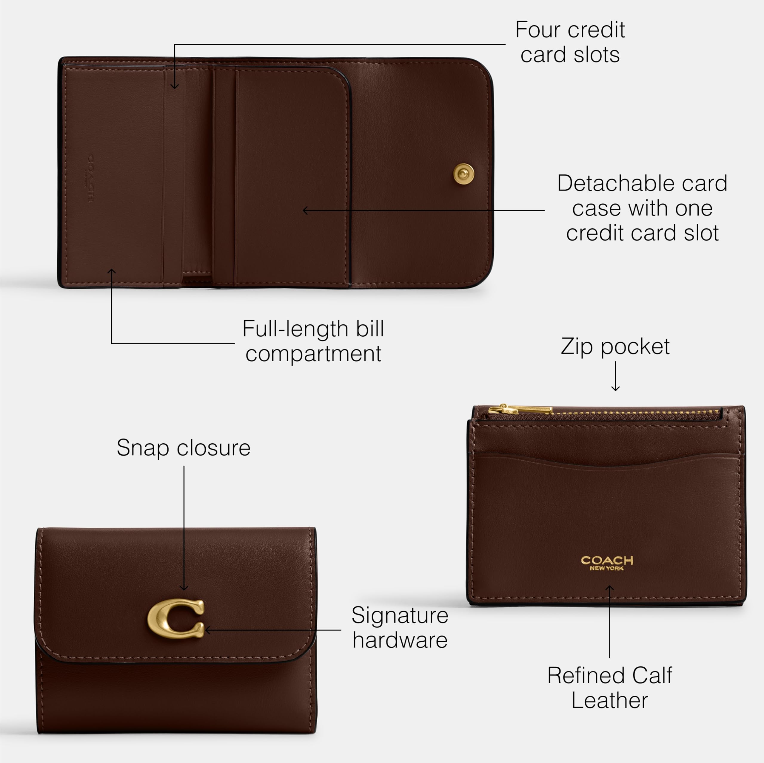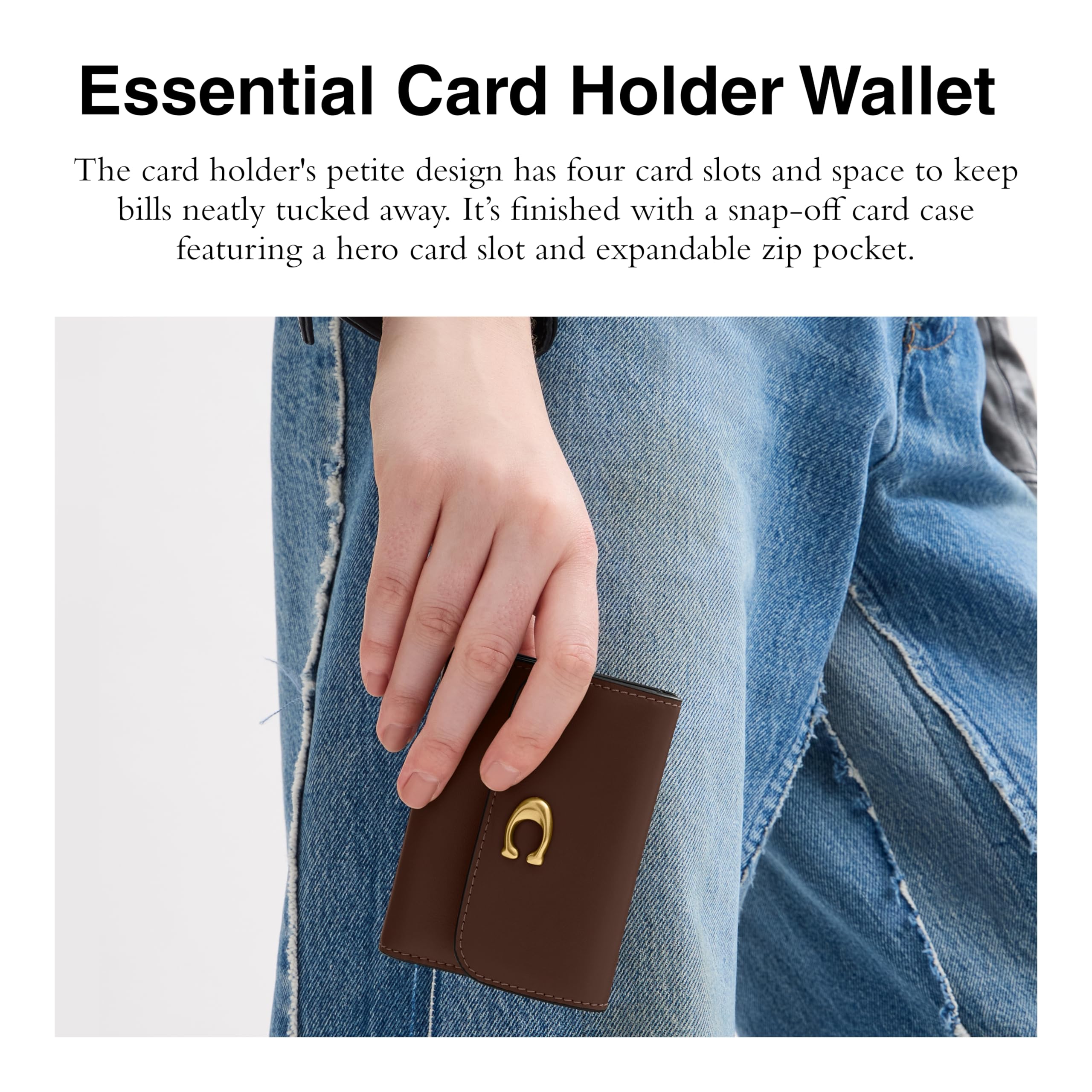 Description Crafted of crossgrain leather this card holder wallet has 4 card slots & zip compartment to hold more cards or cash. Slip it in your pocket or stash inside your bag. This wallet purse features 4 credit card slots & zip compartment to keep essentials secure.