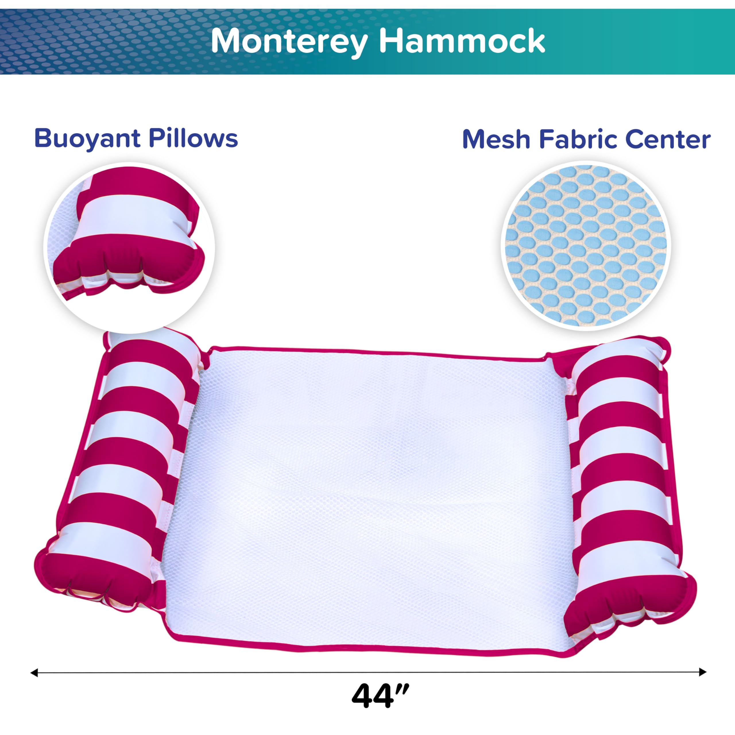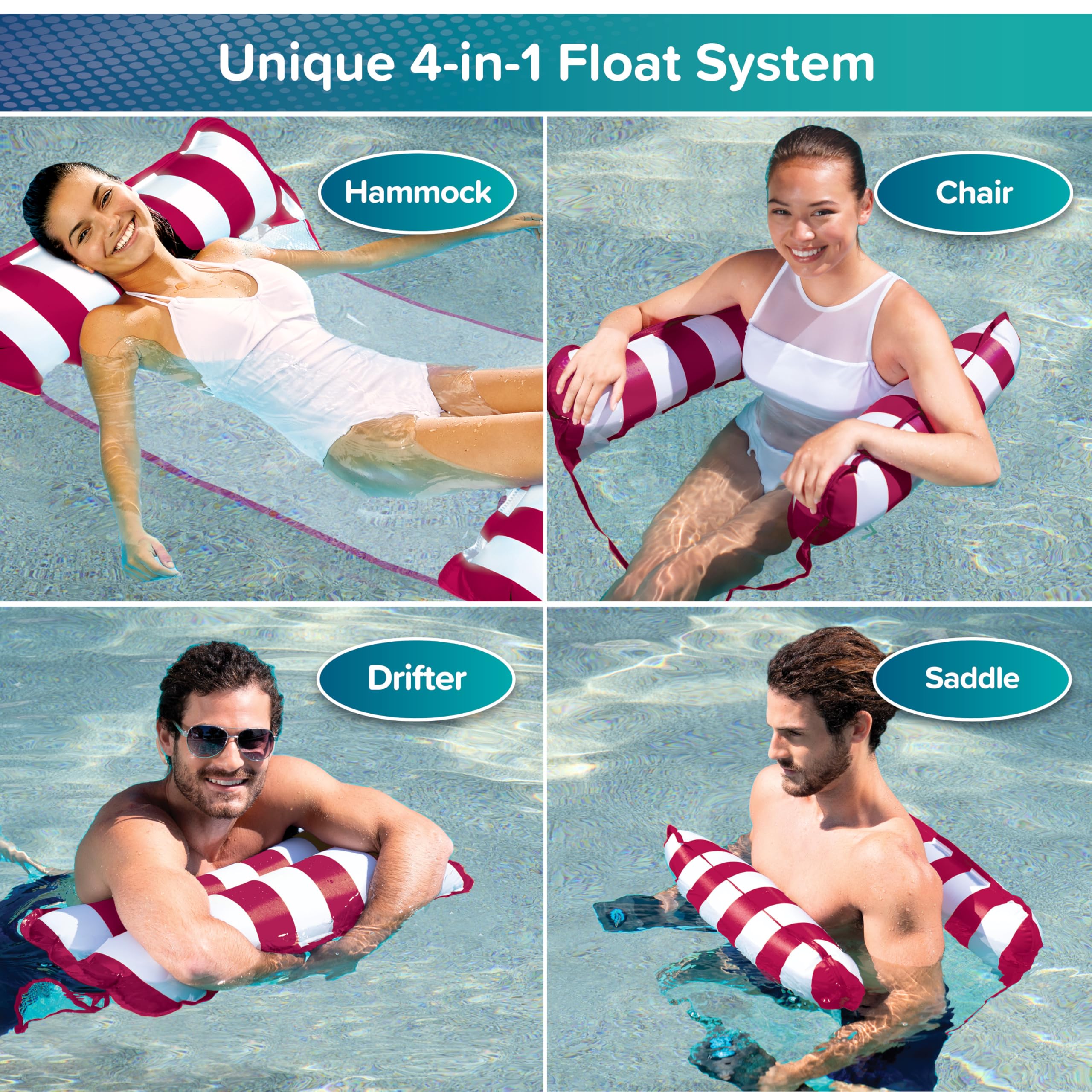 Color: Light Blue/White Stripe Relax or workout. The Monterey boasts a 4-in-1 inflatable float system: hammock, lounge chair, exercise saddle, and Drifter. The Multi-purpose lounge quickly converts for relaxation, socializing, and even exercise in the pool. Lounge features comfortable cool weave fabric and folds easily for portability. Easily inflate and deflate with duo lock inflation system. The Monterey inflatable float system is a great addition to the summer pool this season and delivers fun so you can socialize, relax and even exercise. -Versatile: Monterey 4-in-1 Hammock offers 4 unique positions! Hammock, lounge chair, drifter and exercise saddle. Great for free-motion water (aerobics) exercise. -Recline-Relax-Dream: Supportive mesh lining keeps you cool as you relax on the water’s surface. -#1 Customer Comment: “Easiest pool float to get on and get off of while in the water.” -Perfect Size: 44” x 28” (112 cm x 71 cm) -Ages 15 and up; Weight Capacity 250 lbs. WARNING: This is not a life-saving device. NEVER leave children unattended while device is in use. Use only under competent supervision. Good safety practices should be followed at all times. Do not over-inflate or use high-pressure air to inflate.