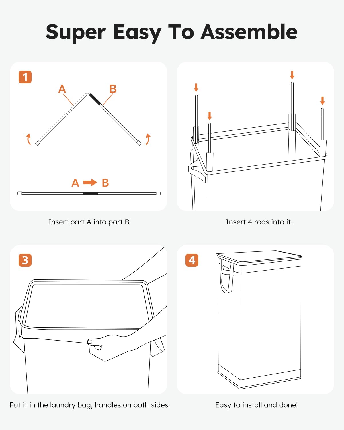 【Easy to Install and Foldable】This clothes basket with detailed installation instructions, just insert 4 support rods into the fixed tube, you can complete the collapsible laundry basket installation in 1 minute, which is simple and convenient. In addition, it can be folded up and stored in a cabinet when idle, reducing the space occupation.