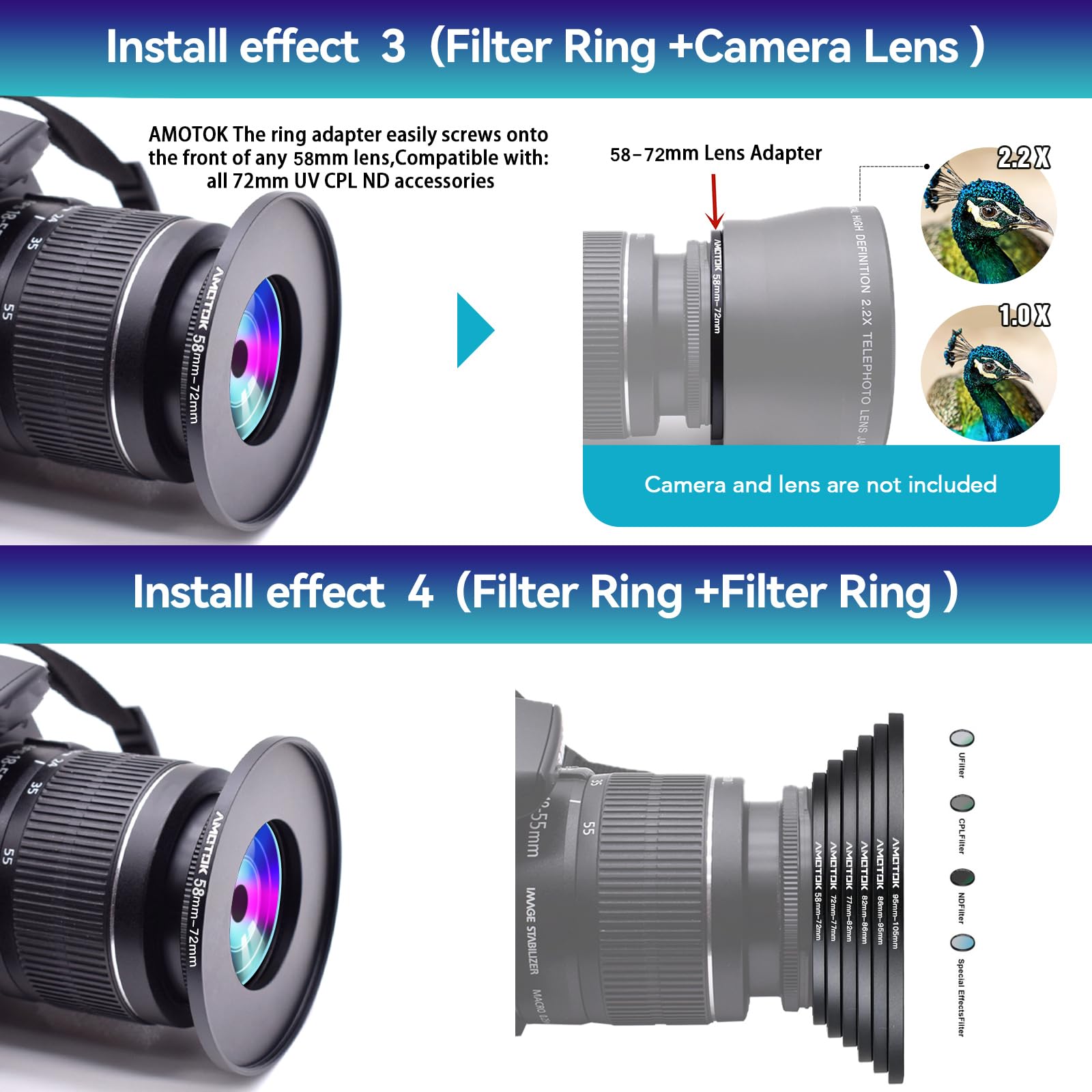 【2】AMOTOK The ring adapter easily screws onto the front of any 58mm lens,and converts the thread size of your lens to the thread size of any other 72mm accessory(such as filters,hoods,flashes and lens converters),and other 72mm accessories.The purpose is to increase the diameter of the lens.yet can still be removed easily when not needed.