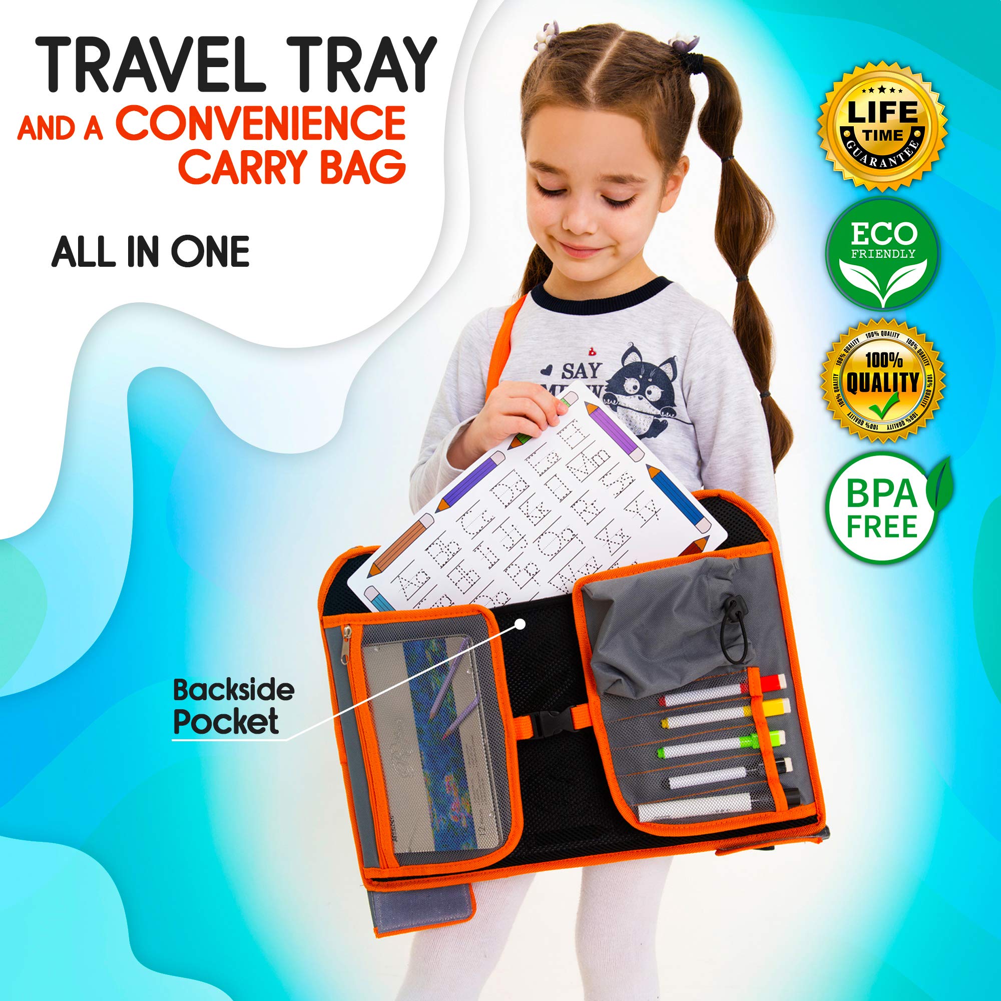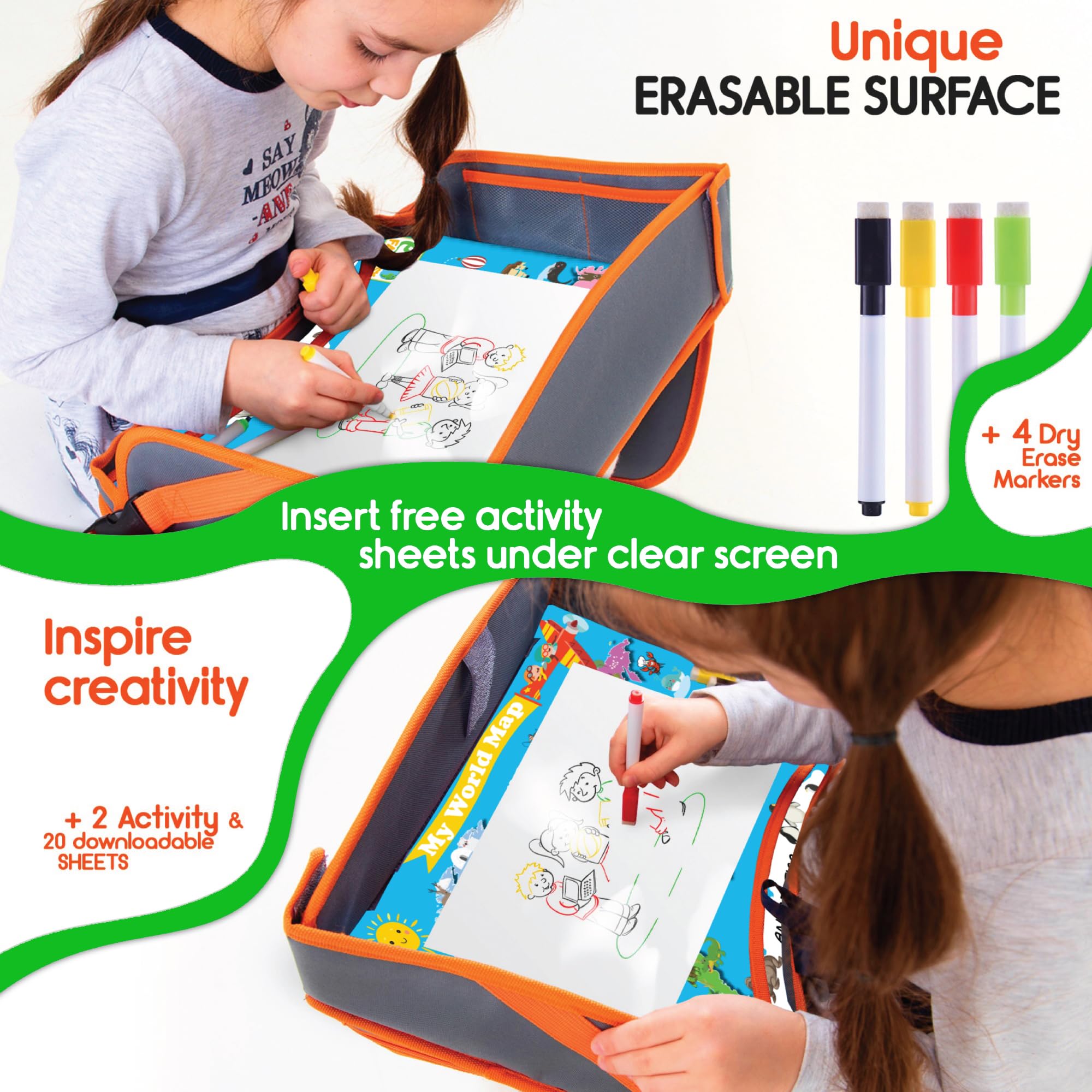 Let Kids Play & Learn - Our car seat tray for kids travel comes with 2 activity sheets and 4 erasable markers along with 20 downloadable sheets so your little one can draw, play and have fun while providing them with a multipurpose car trays for eating, writing, drawing, preschool activities and more. It doubles as a car tray for toddler travel activities and plane activities for kids ages 3-5, making it travel essentials kids will love!