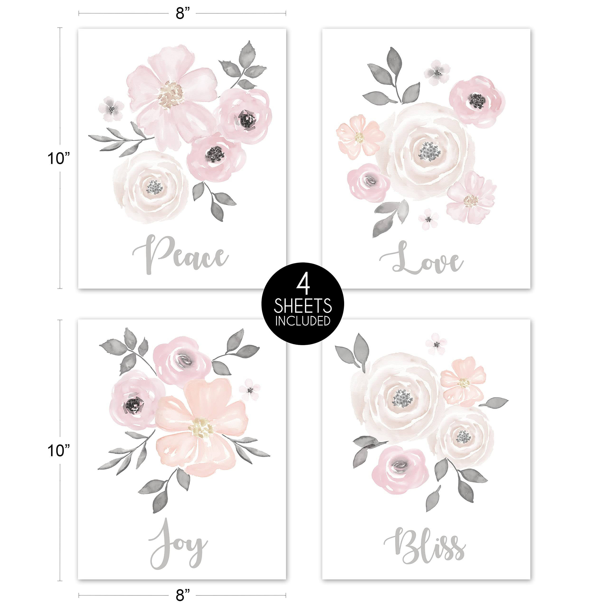 4 PIECE ART PRINT SET INCLUDES: 8in. x 8in. each individual print. Designed in the USA, this set is professionally printed on premium matte heavyweight paper with fade resistant ink. These vibrant decorative wall art prints for girls would pair perfectly with coordinating bedding sets and match with the Blush Pink and Grey Watercolor Floral Flower Rose Floral Collection accessories to complete your nursery, bedroom, living room, office, kitchen, or dining room look. FRAMES AND MATS NOT INCLUDED.
