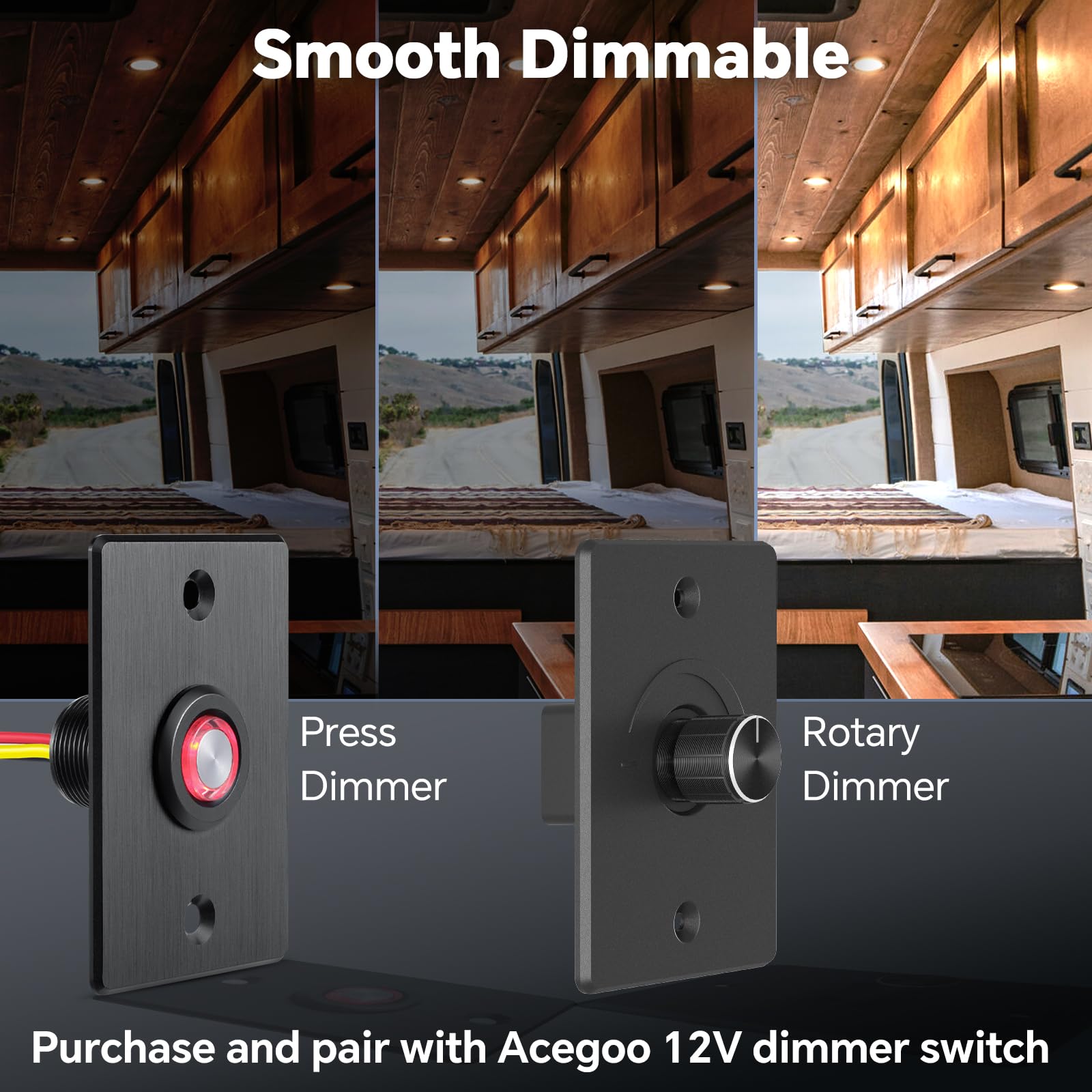 Full Range Stepless Dimming: The LED 12V Light Fixtures are compatible with Acegoo's 12V dimmer, allowing for 0-100% smooth dimmable lighting and saving battery power. The dimmer switch (integrated with on/off and dimming control) is sold separately