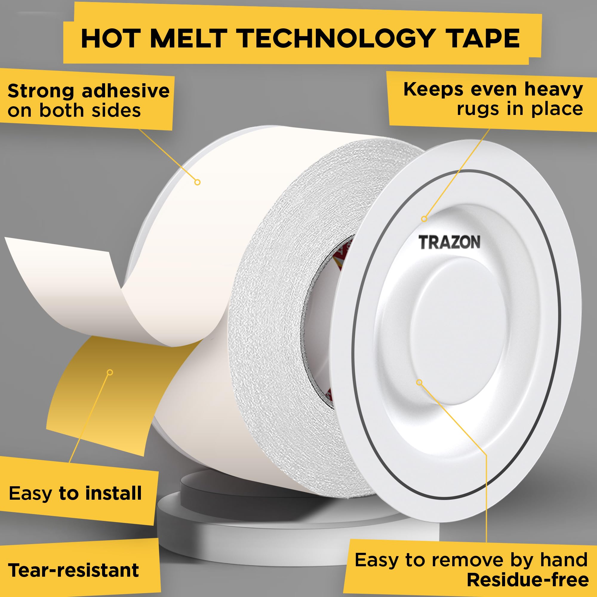 Strong adhesion: Double-sided carpet tape with industrial-strength adhesive provides secure, long-lasting hold that keeps rugs and carpets firmly in place on any surface
