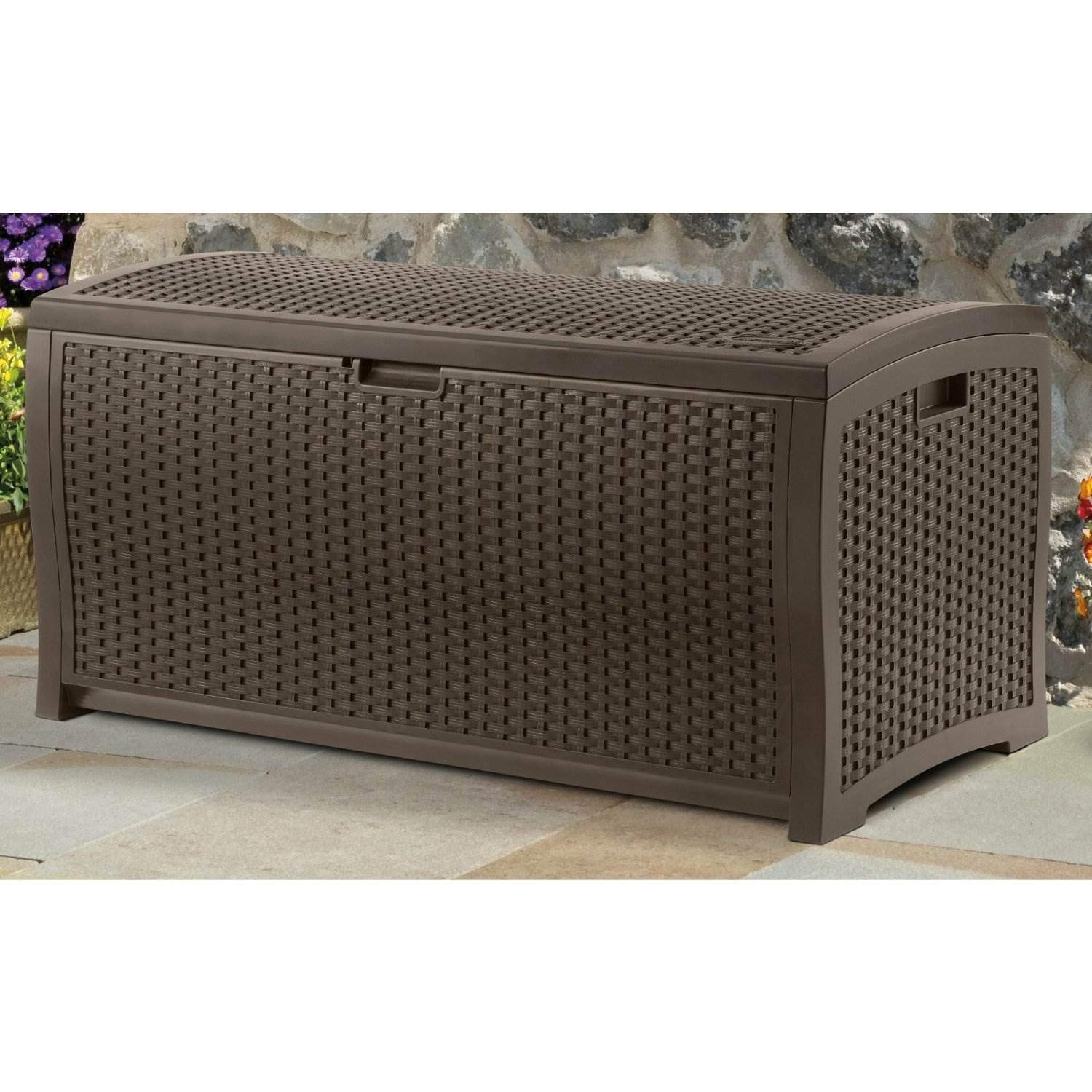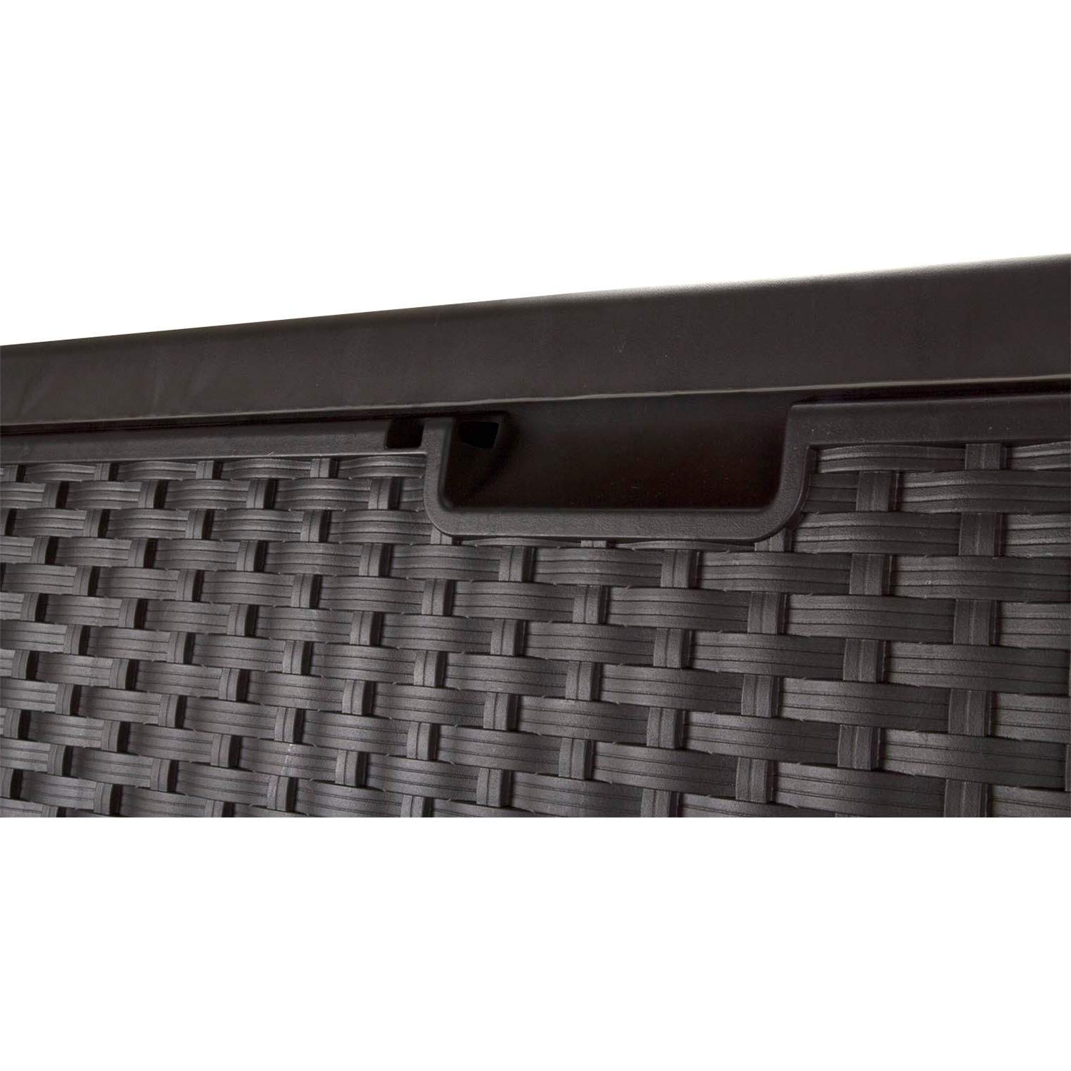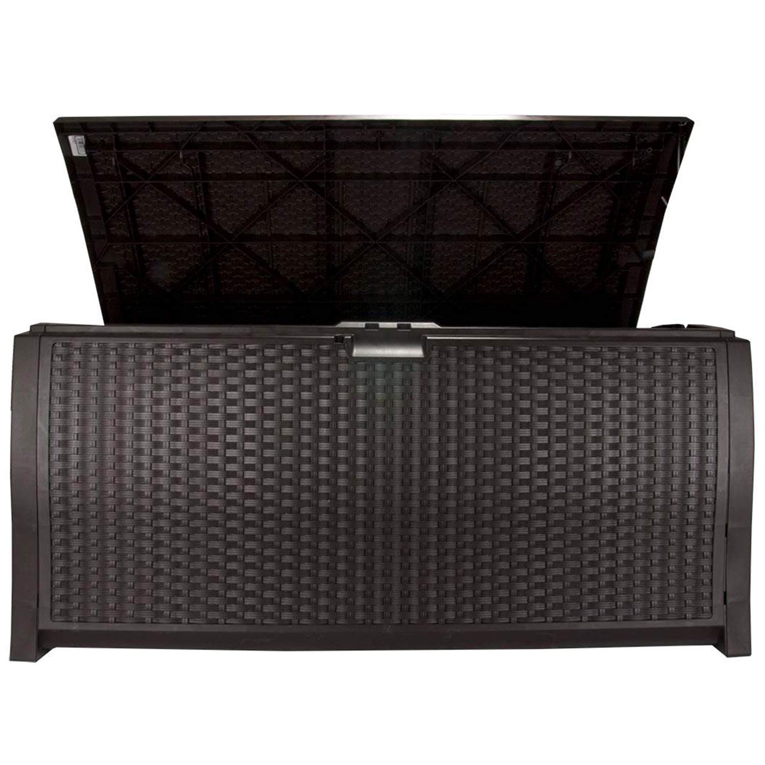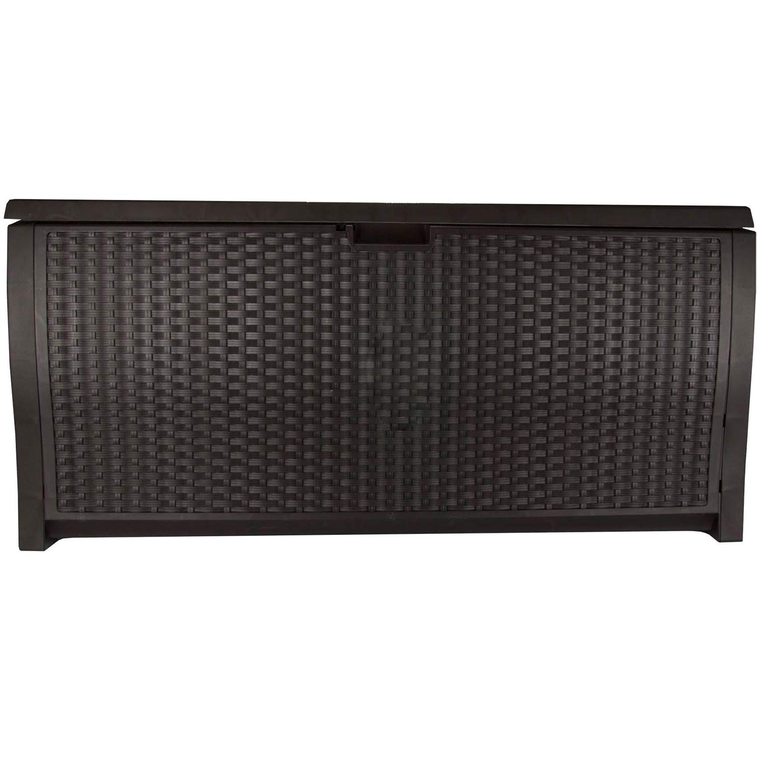 Keep your personal items organized and enjoy a clutter-free space using the plastic wicker deck box container from Suncast; Versatile storage box that can be used in your home, garage, pool, and more