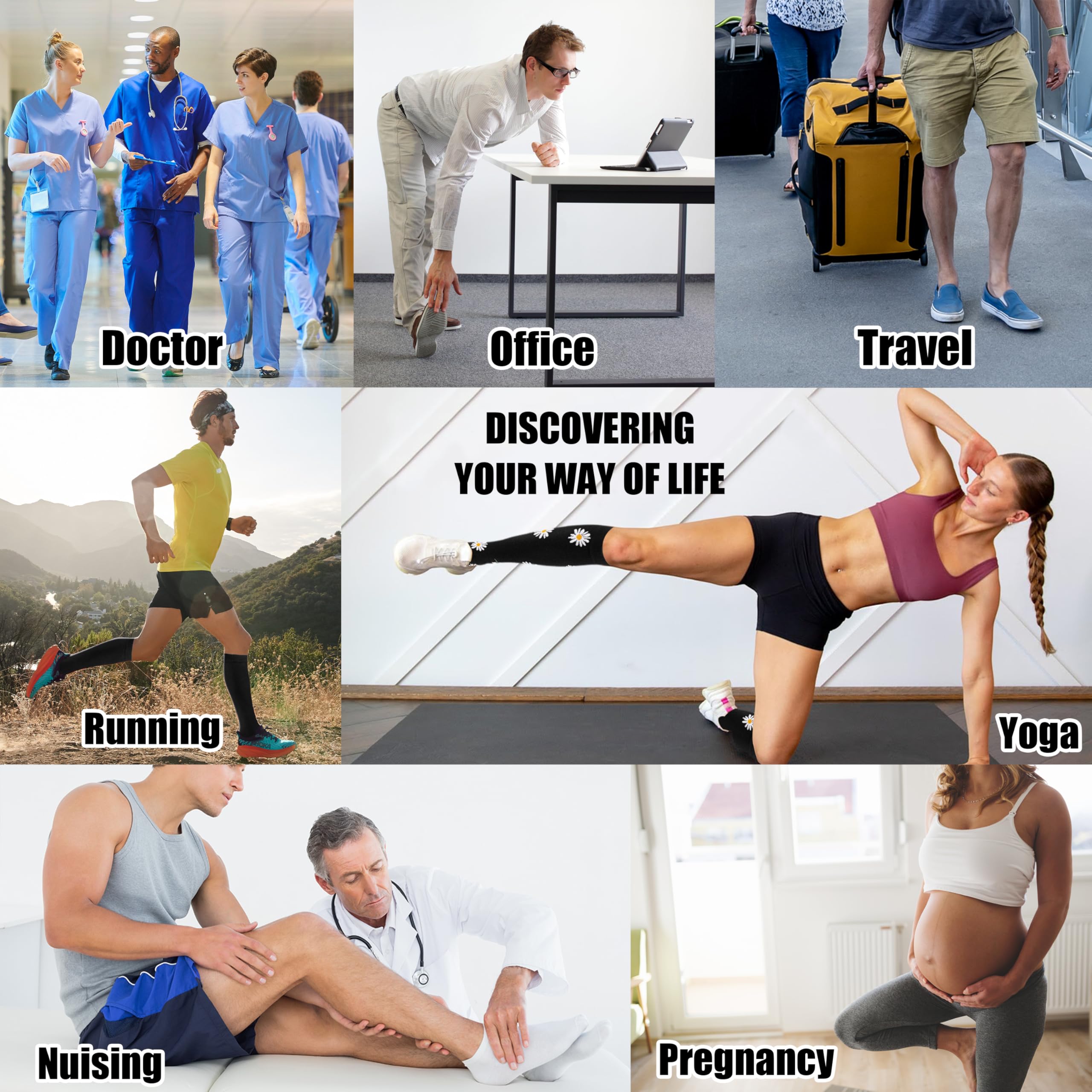 ENERGIZE YOUR LEGS: Medical compression socks offer many benefits, effectively relieving swelling and fatigue, preventing blood clots, aiding in the treatment of venous diseases, leg pain, and plantar fasciitis. Additionally, travel compression socks reduce the risk of deep vein thrombosis (DVT) during air travel; Soft compression socks also relieve swelling and pain during pregnancy. Give them a shot and feel the comfort and protection they offer!