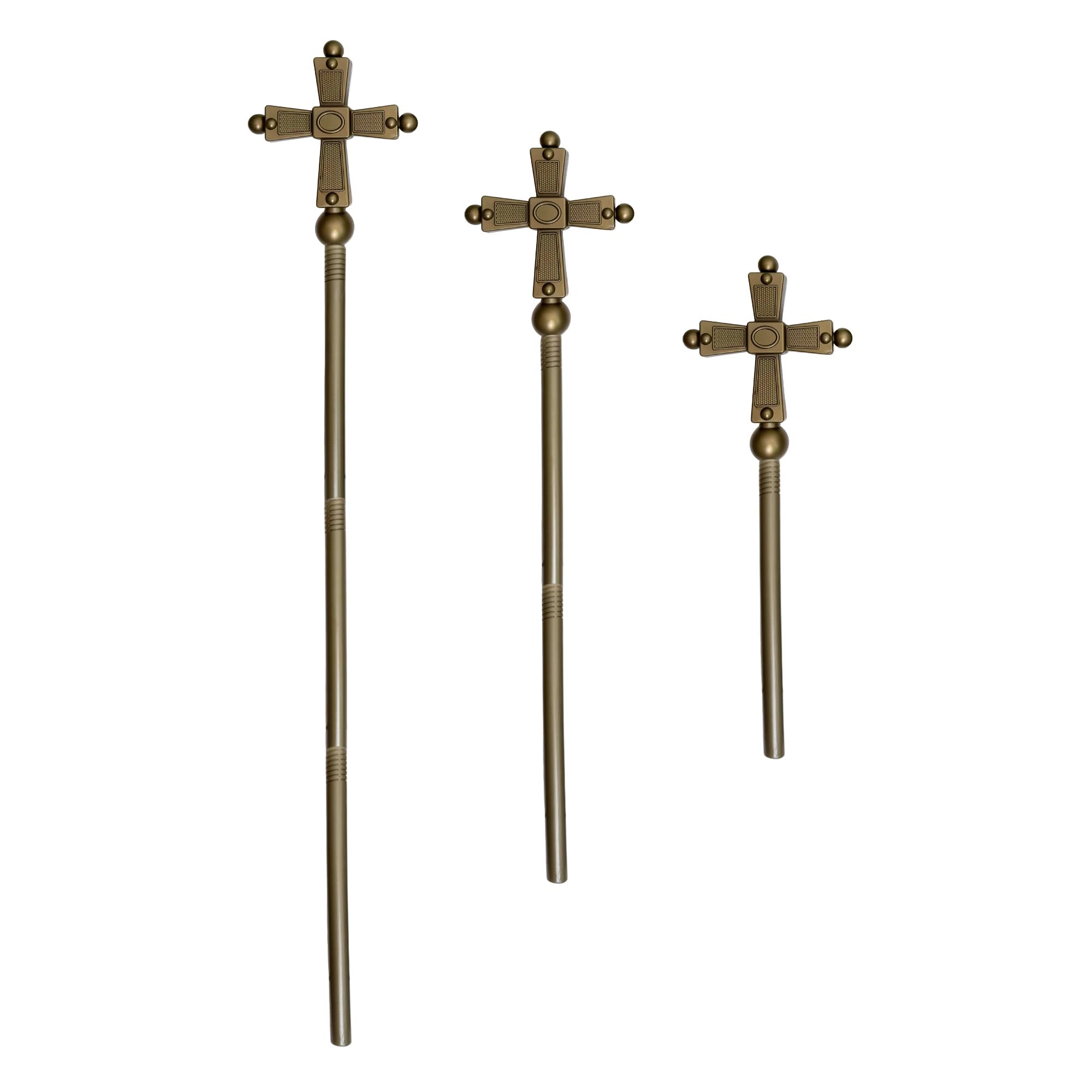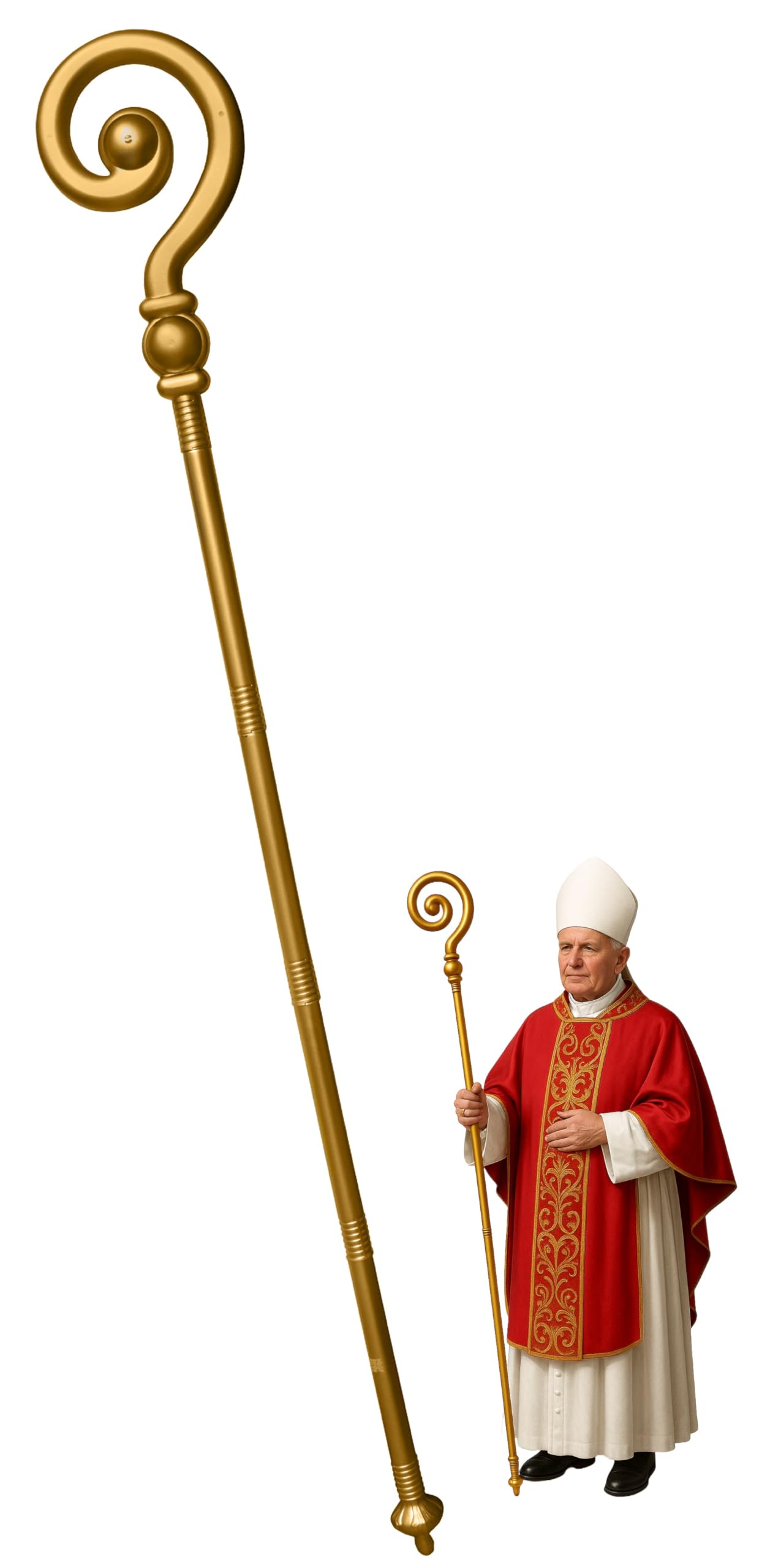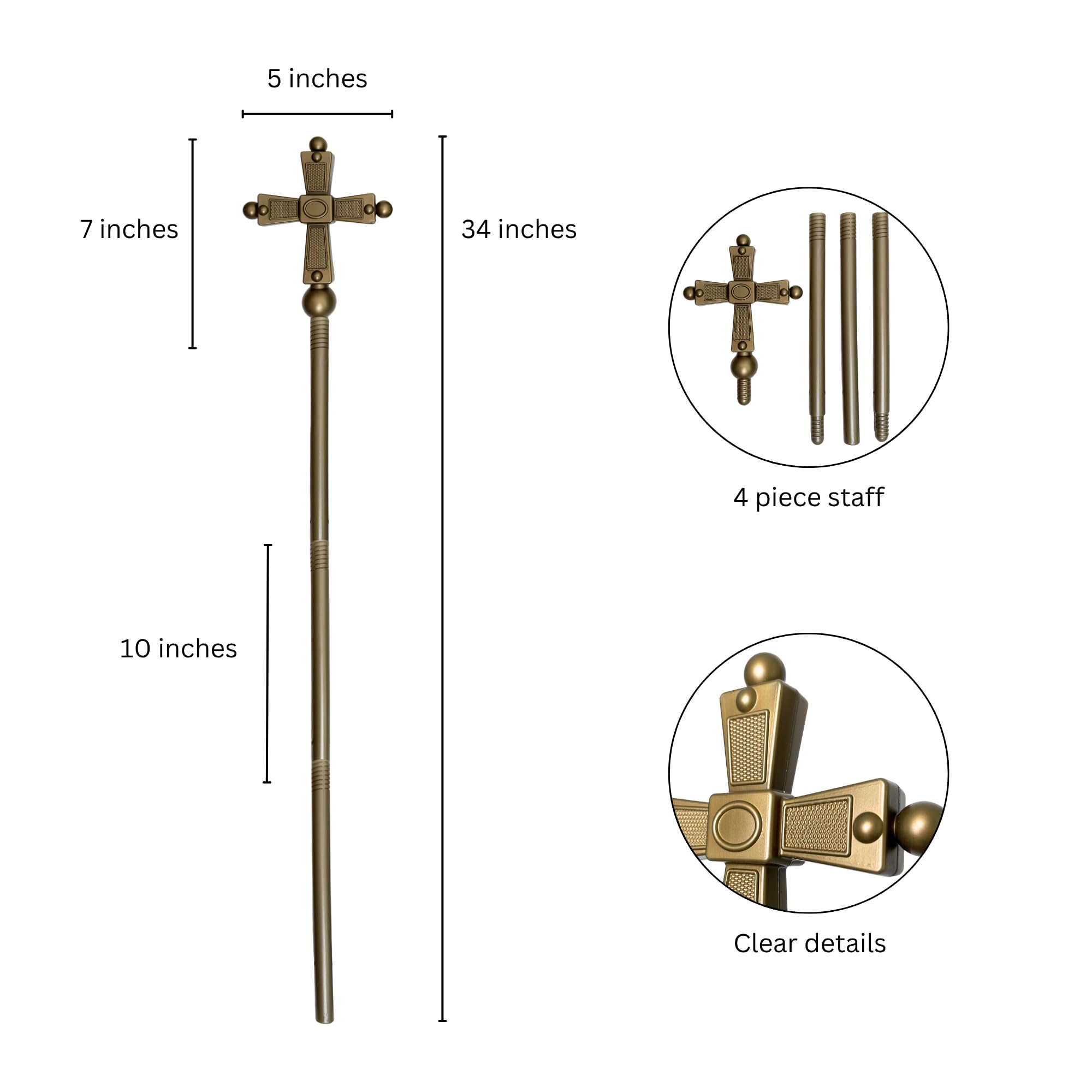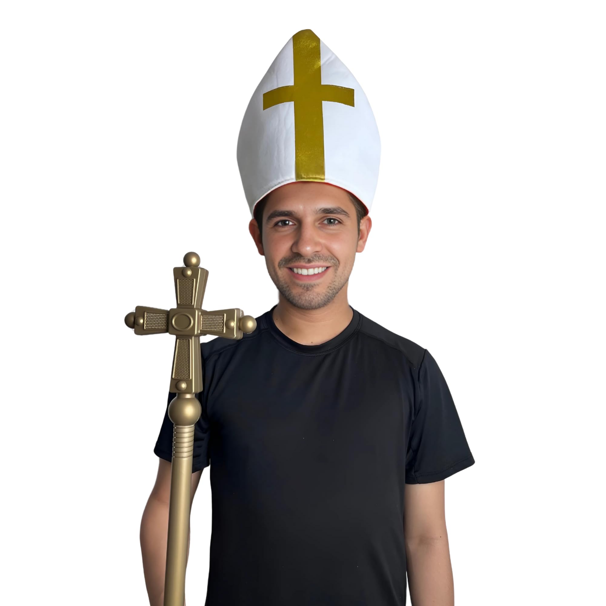 Description Complete your religious-themed costume with the EverJoy Party Gold Cross Staff and Plush Catholic Pope Clergy Hat. The 44-inch tall gold cross staff, with its hollow design, is lightweight and comfortable for all-day wear. Its adjustable 4-piece construction and striking gold cross top make it perfect for costumes of a pope, priest, bishop, or saint, suitable for Halloween, theater, cosplay, and religious or medieval-themed events. Pair it with the luxurious Plush Catholic Pope Clergy Hat, crafted with high-quality materials for a comfortable fit and majestic look. Accented with radiant gold crosses and gold-detailed lappets, this hat measures approximately 10.25 inches in height and 12.5 inches in width, fitting a head circumference of about 53 cm. This combination is ideal for both men and women, perfect for crucifixion dramas, Easter passion plays, religious celebrations, costume parties, and theatrical performances, adding authenticity and elegance to any religious-themed outfit.