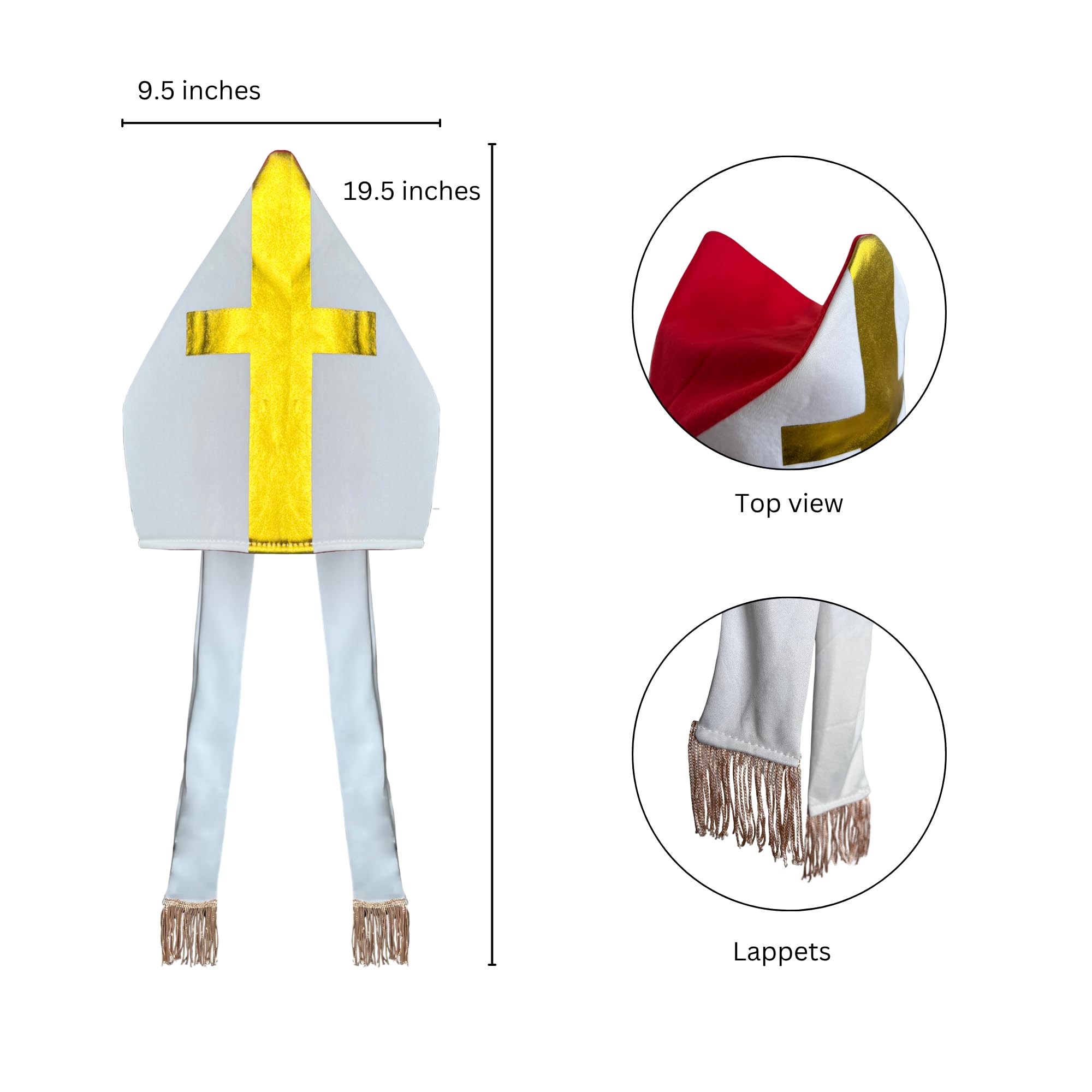 Elegantly accented with radiant gold crosses and gold-detailed lappets, measuring approximately 10.25 inches in height and 12.5 inches in width, fitting a head circumference of about 53 cm.