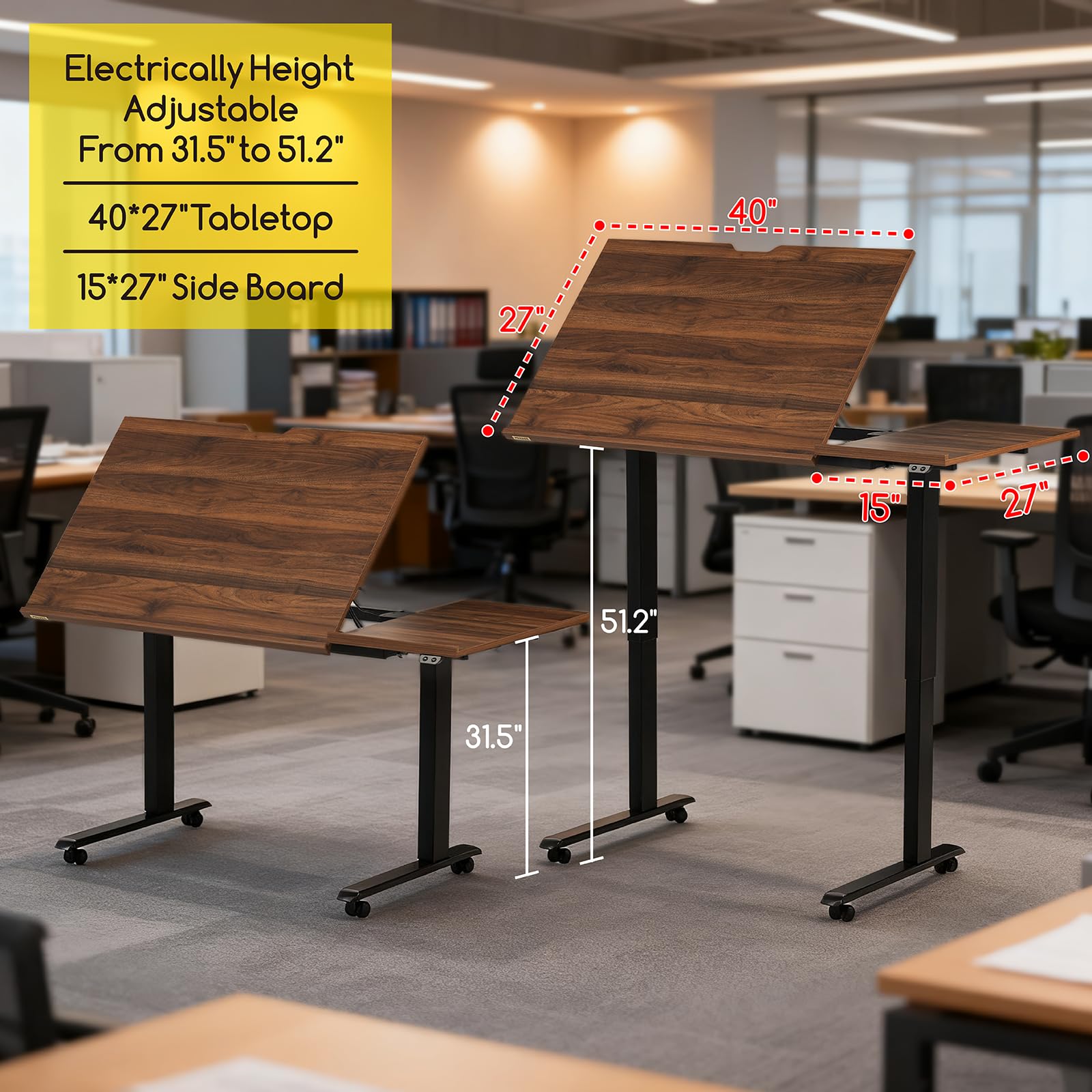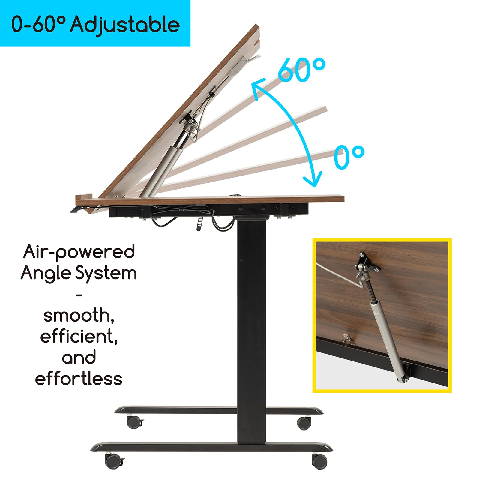 Large Tilting Tabletop: Designed for creators who work a long time on the table, the electric drafting table is easy to adjust the height from 31.5" to 51.2" and angle from 0 to 60° to always remain in a proper position when writing, reading, and drawing. The 40 x 27" large tabletop provides a large enough workspace for extra-large design drafts. The tilted desktop is supported by air-powered angle system, withstanding a maximum weight of 176lb