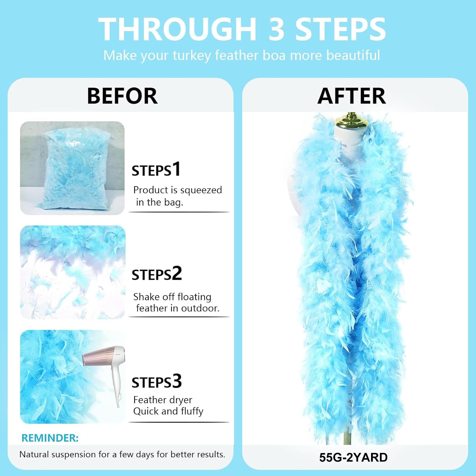 ❤️Precautions before use:Since our feathers are all natural and handcrafted,After you receive the boas, take them out of the package and shake them outdoor first, in order to get rid of debris and fallen feathers.Then hang it up for few hours before wearing. If you can hang up blowed few days, it will looks as the picture full and big.Of course,the longer you hang them up, the turkey feather boa will be more fluffy and the effect will be more stunning.