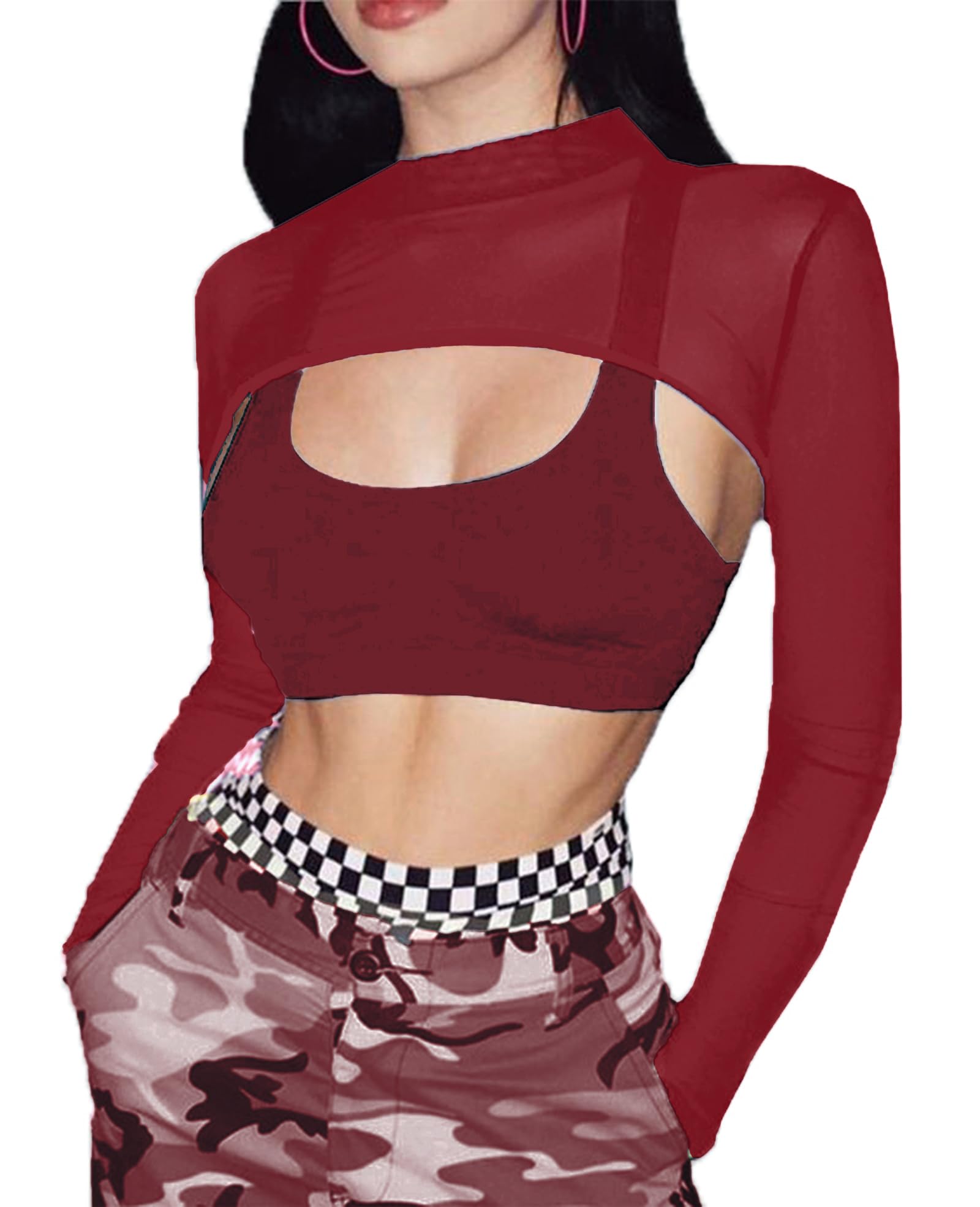 β€Features: This long sleeve see through crop top features mesh material, mock neck, slim fit, pull on closure and perfect sleeve length. Simple but super trendy and eyecatching!