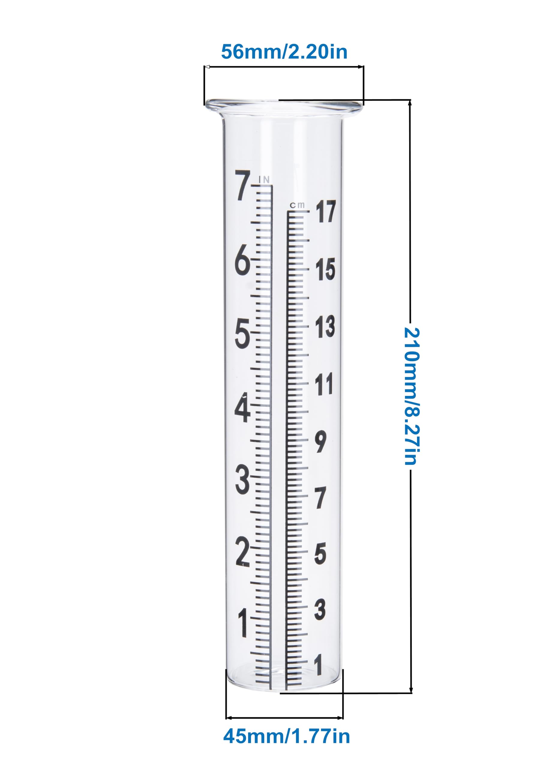 Rain gauge dimensions - 2.25 W x 2.25 D x 8.27 H in/5.5 D x 5.5 Dx 21 H cm