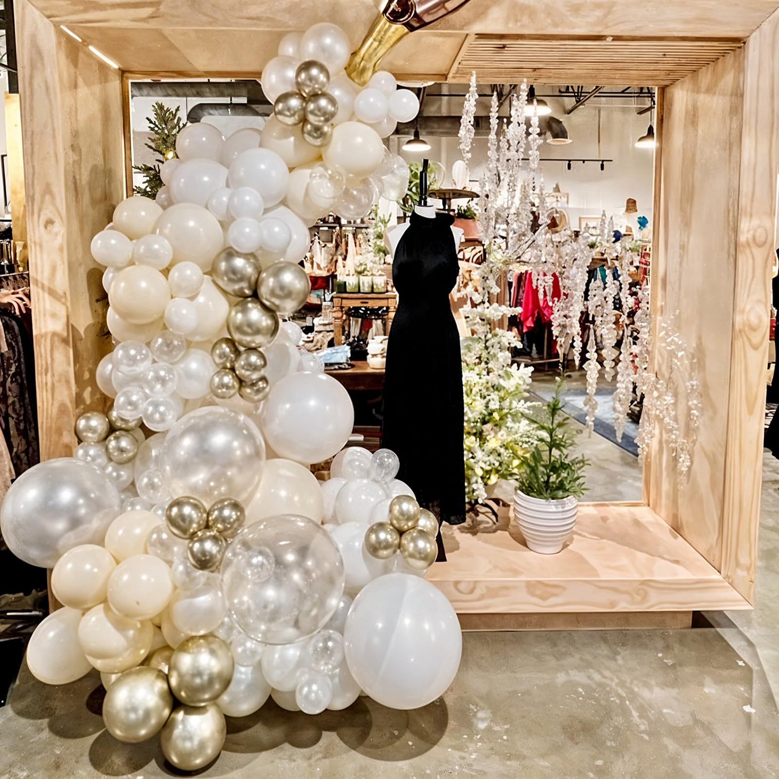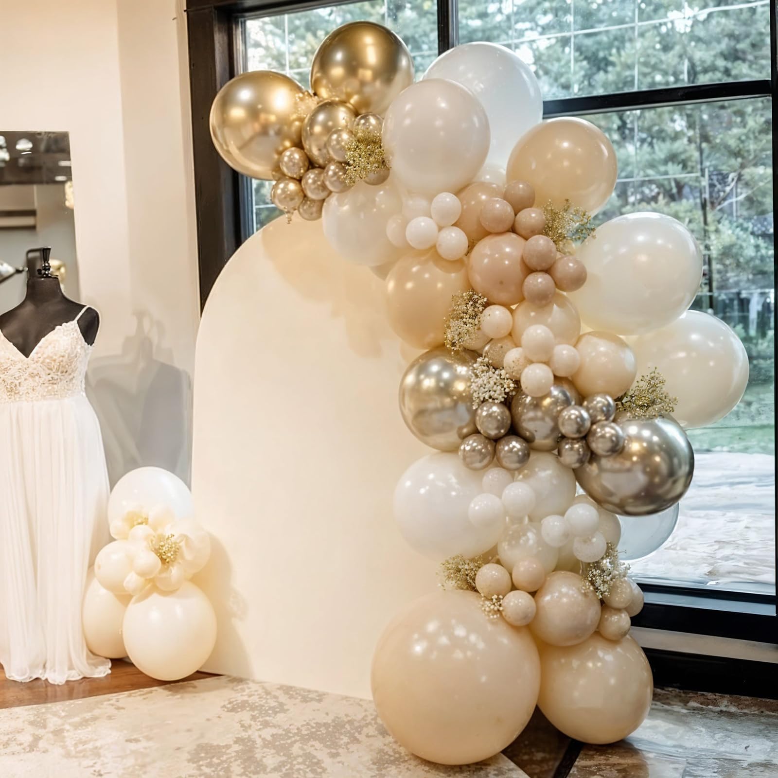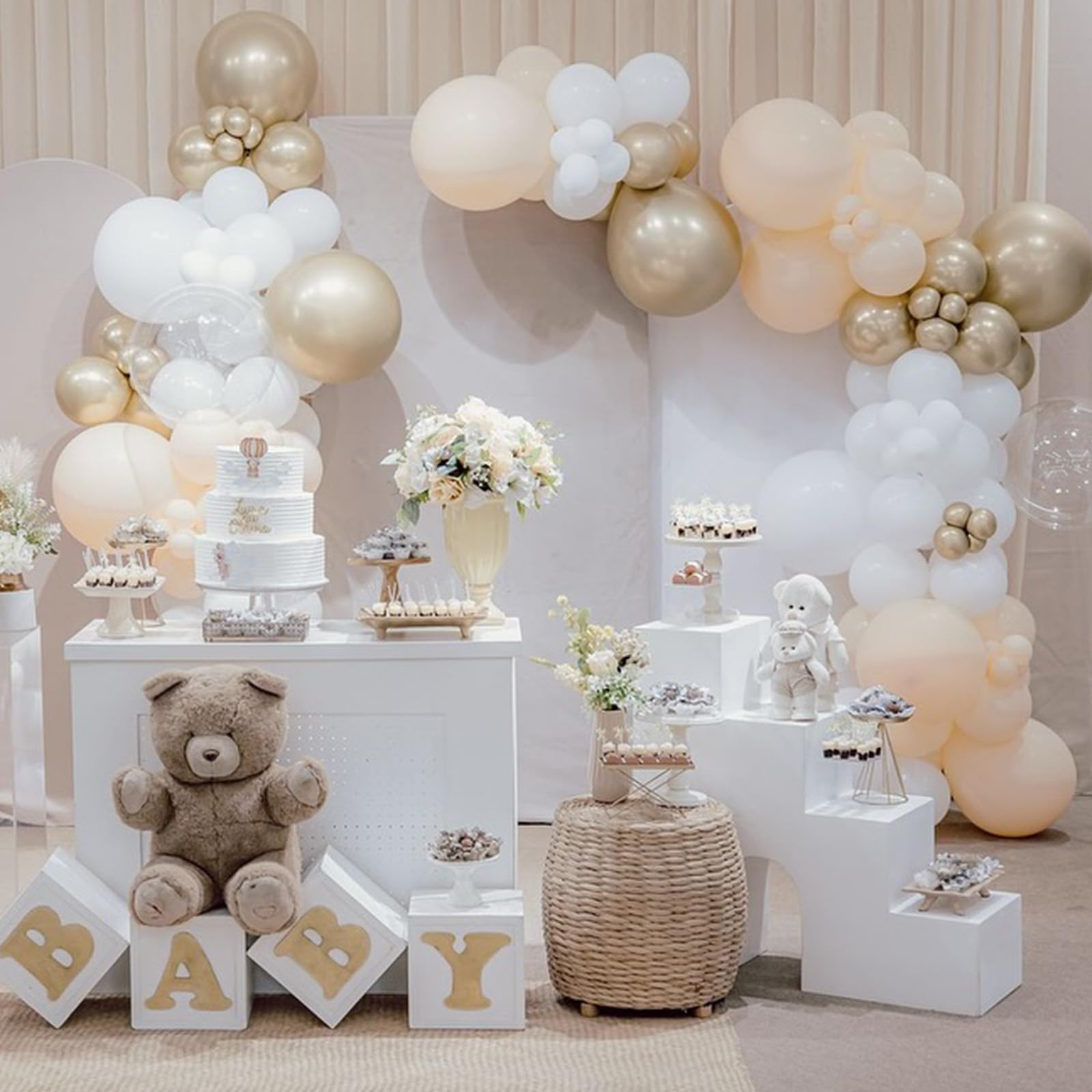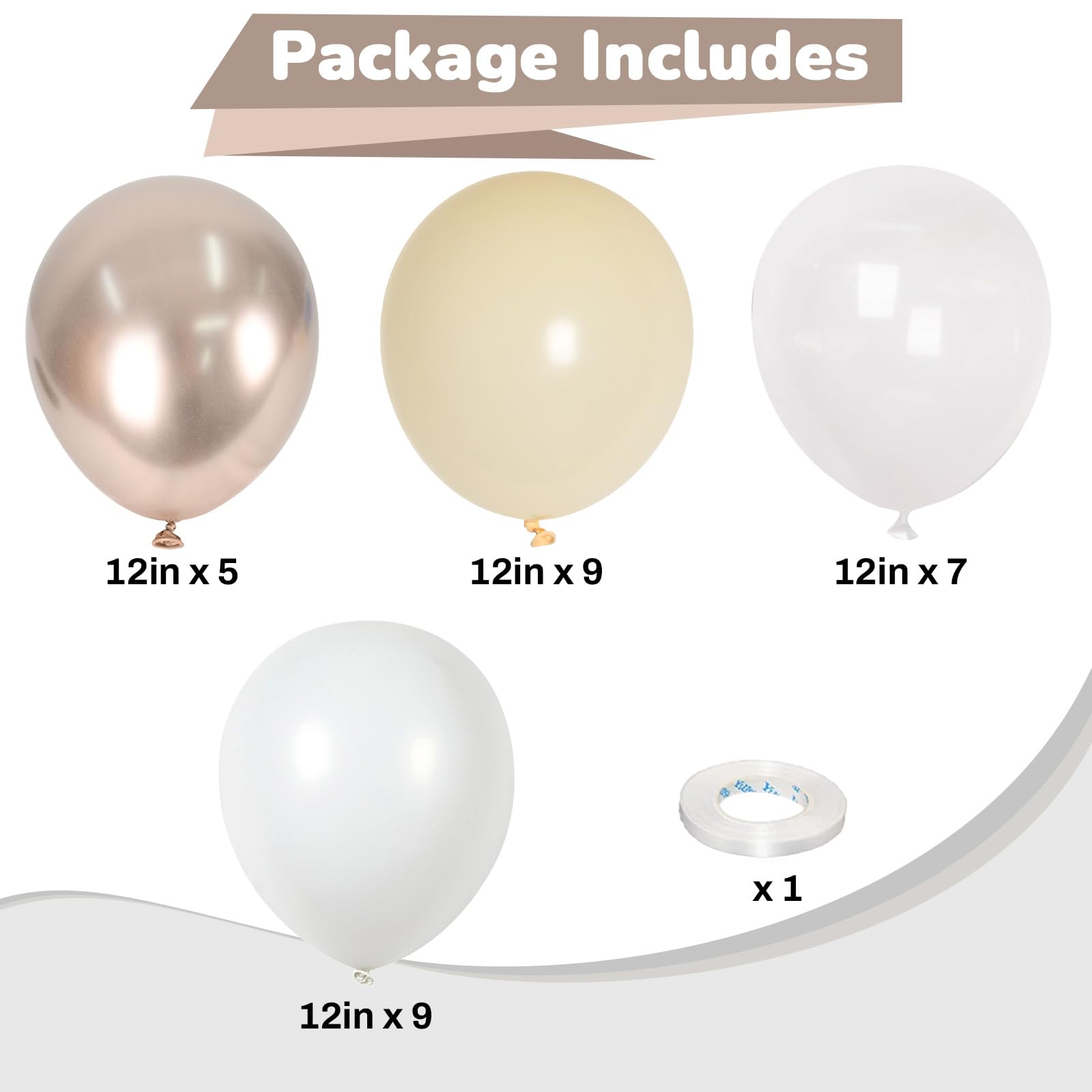 Gold and White Balloons: This 12 in latex balloon set includes 5 pcs champagne color balloons, 9 pcs ivory balloons, 7 pcs transparent balloons, 9 pcs white balloons. Ideal for baby shower, wedding, birthday party decorations to create a vibrant atmosphere