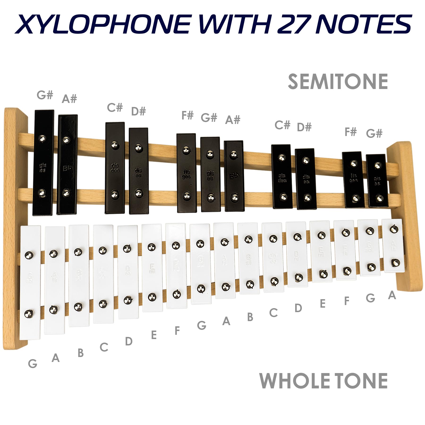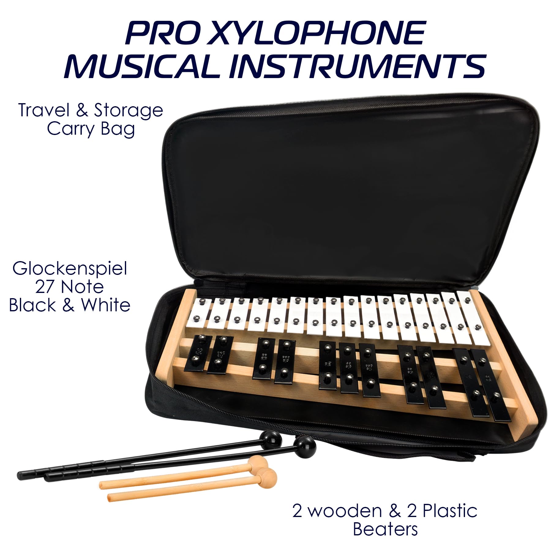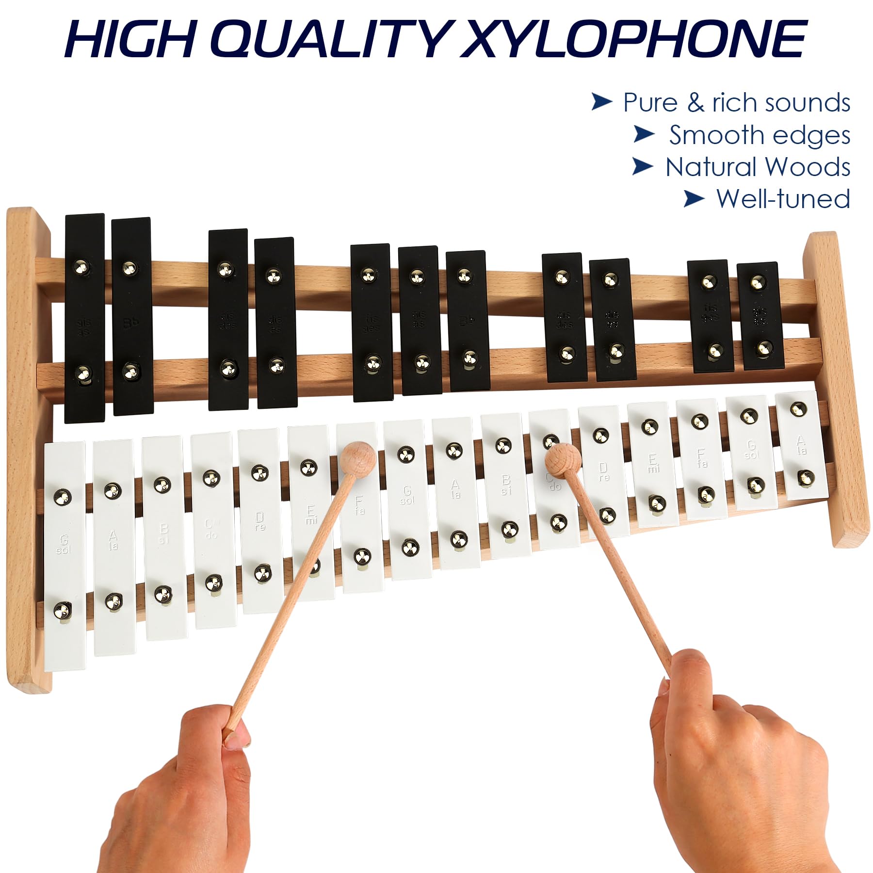 PROFESSIONAL XYLOPHONE: This full-size soprano glockenspiel xylophone boasts 27 notes range (G2-A5), each key color coded for easy guidance. Featuring classic white and black bars, the music xylophone produces bright, clear, and rich sounds with chromatic scale positioning, making it a perfect musical instrument for adults and kids. This full size xylophone provides a comprehensive musical experience to start your musical journey!