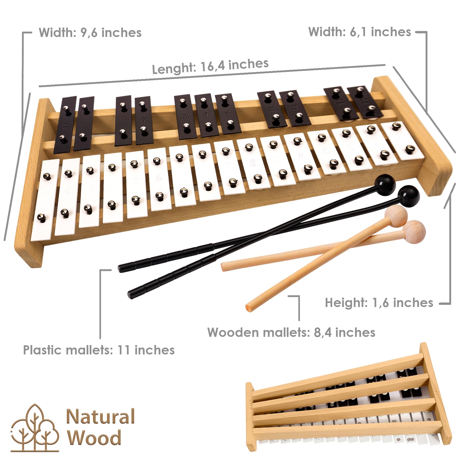 PERFECT GIFT FOR MUSICIANS: This percussion instrument includes two sets of wooden and plastic mallets and a sturdy black carry case with a handle for easy transport. With medium-sized dimensions (L-16.4 x W-9.6 x H-1.6 inches), the percussion glockenspiel spans a 2-octave range. The natural wood base paired with black&white metal bars and musical xylophone ensures a visually appealing and sonically rich instrument, making it an exceptional gift for musicians of all ages.