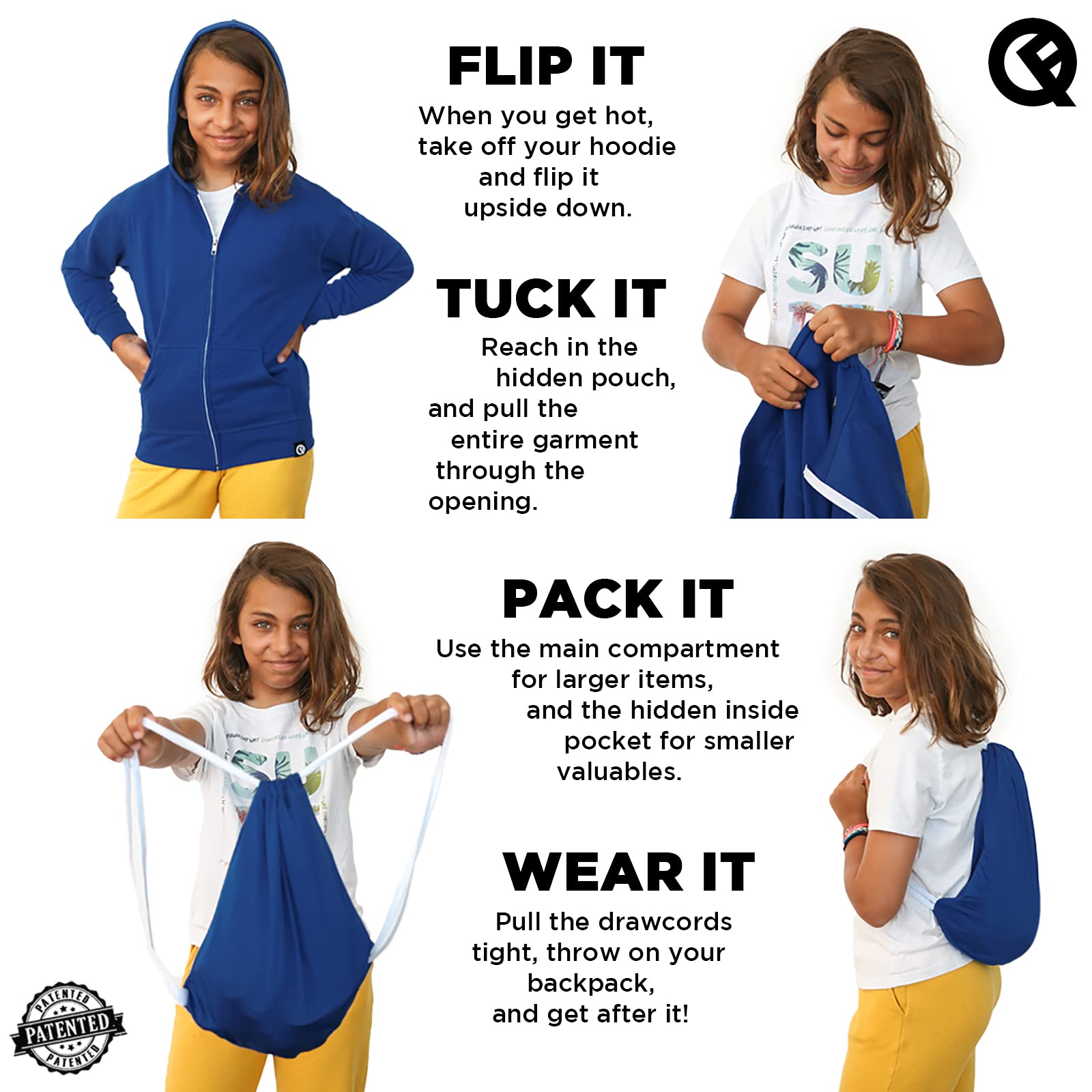 Description From the playground to the park, kids lose their hoodies when they take them off and don't know what to do with them. Using our patented Quikflip® conversion technology, every lightweight kids' Hero Hoodie transforms into a functional backpack in a matter of seconds, so there is always an easy (and cool) way to carry it, regardless of the weather!